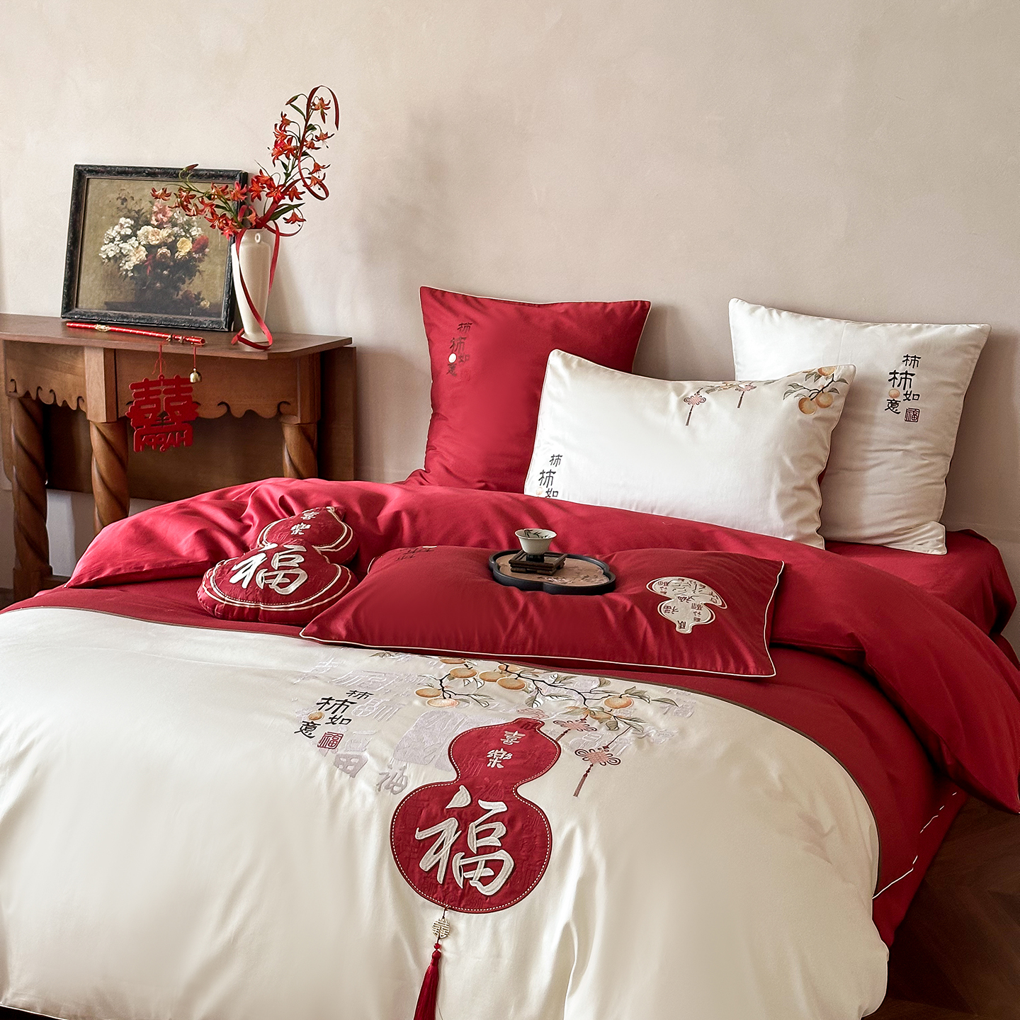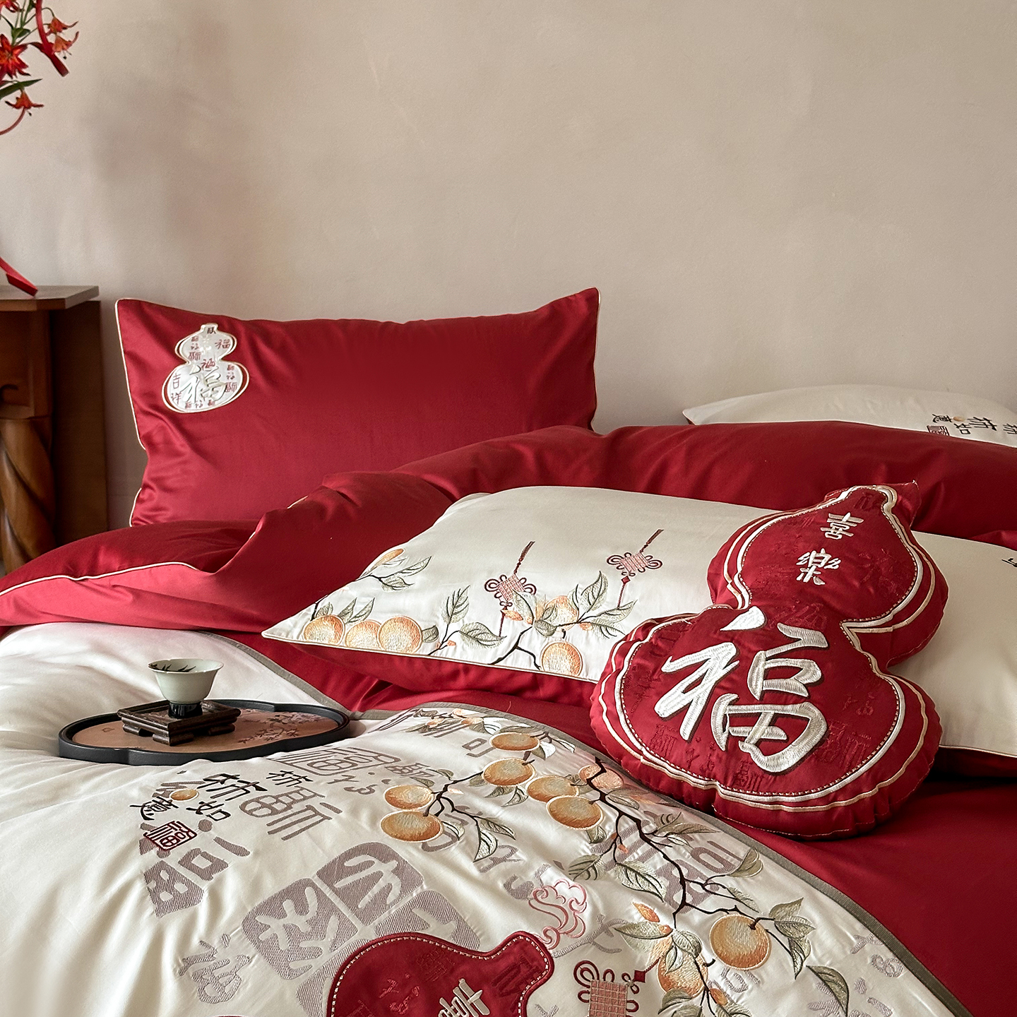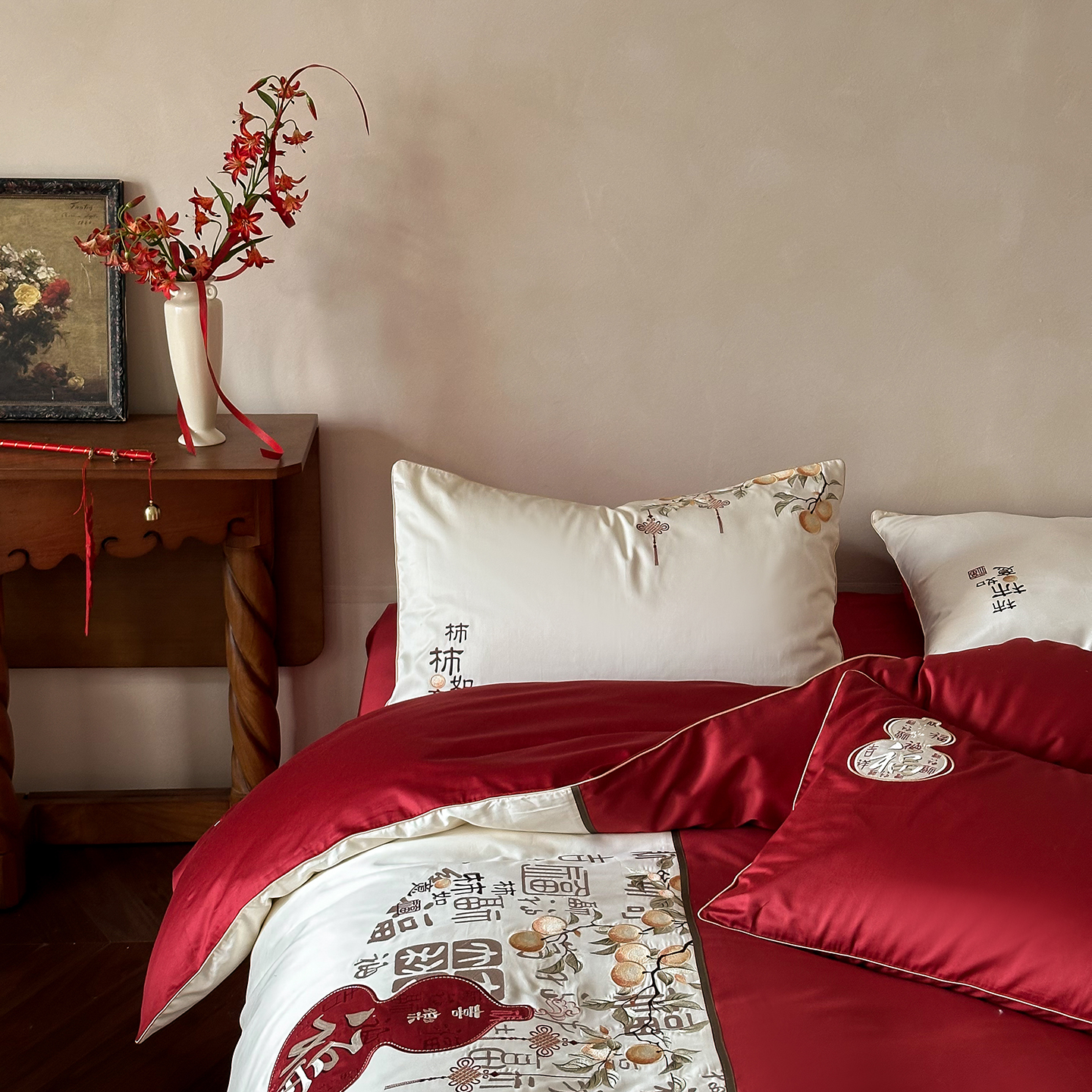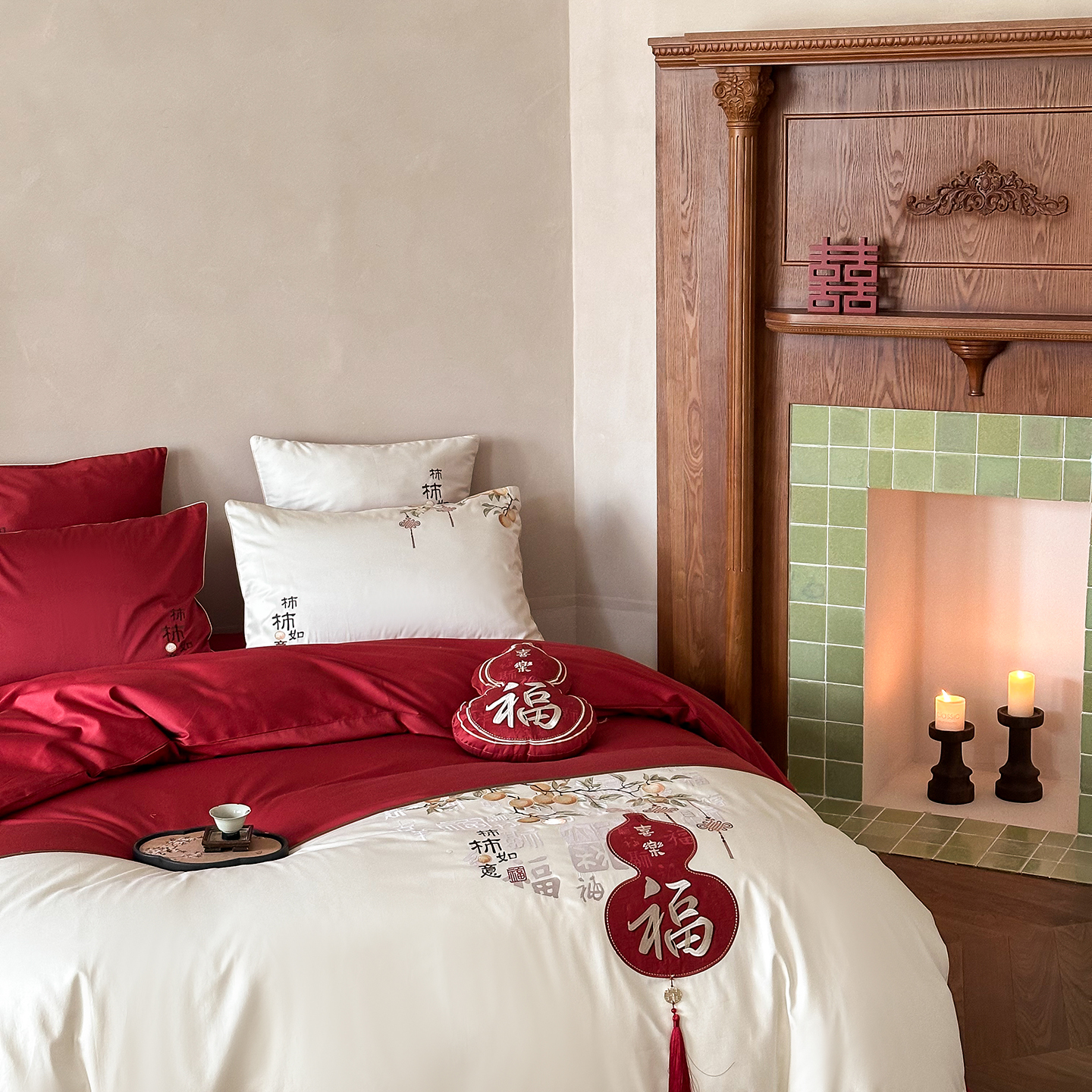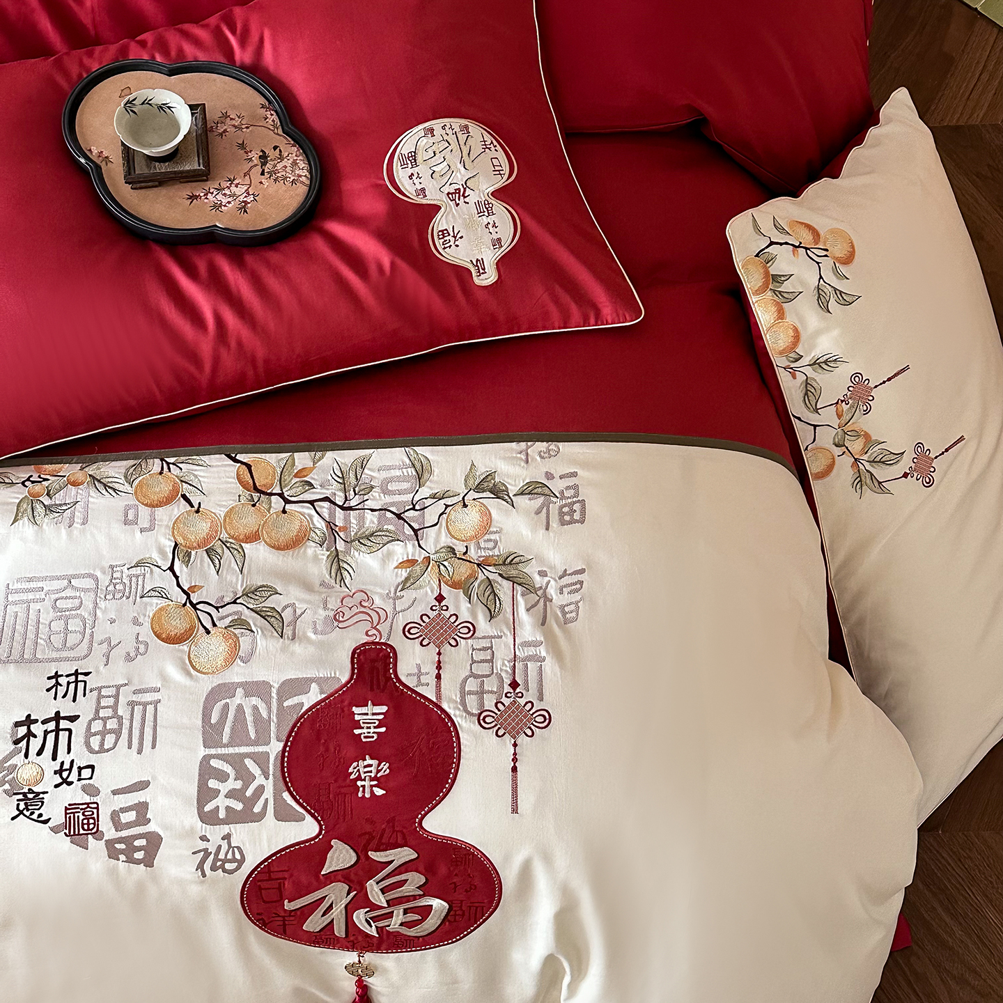 (总)西西家居 2025新款100支长绒棉大红婚庆四件套-柿柿如意