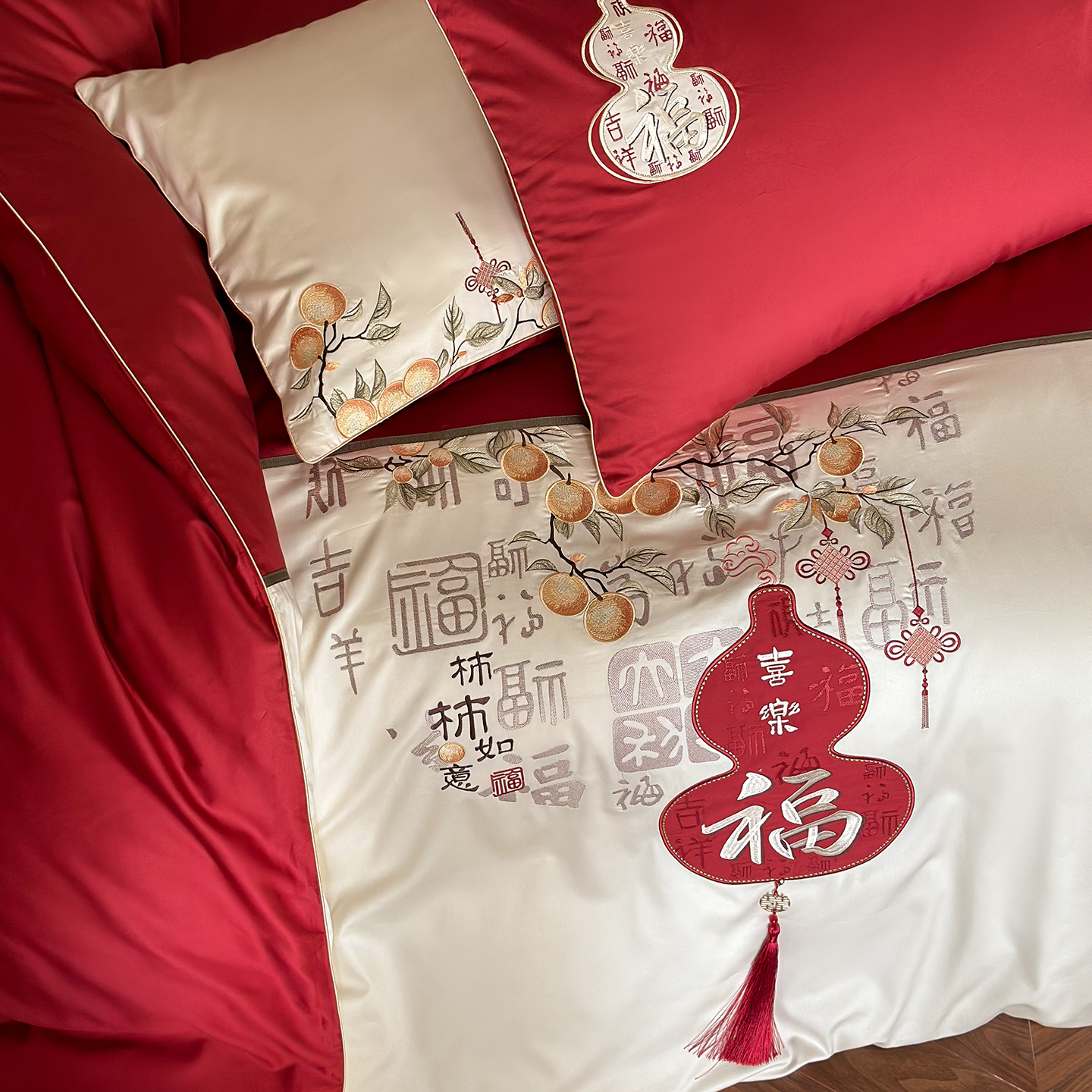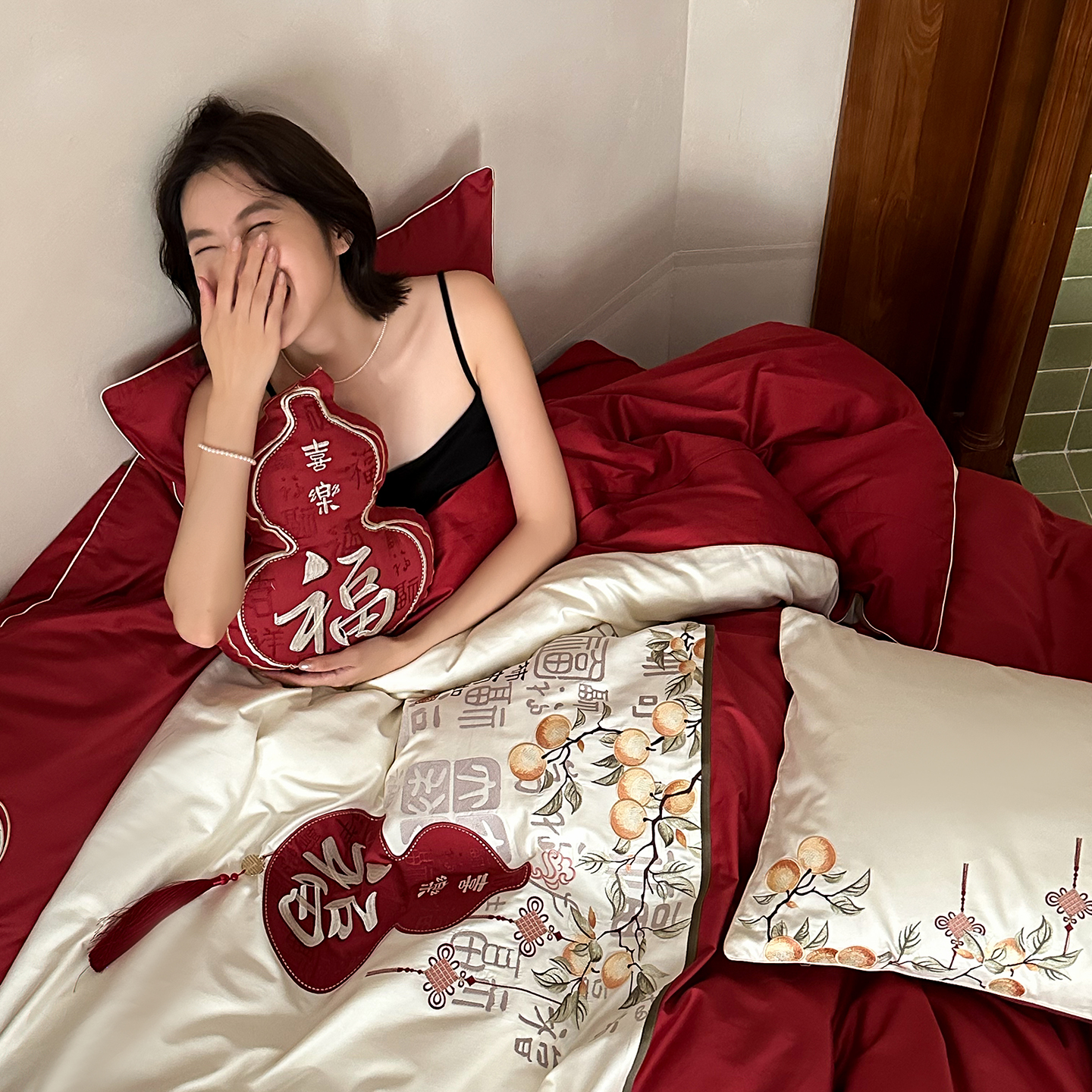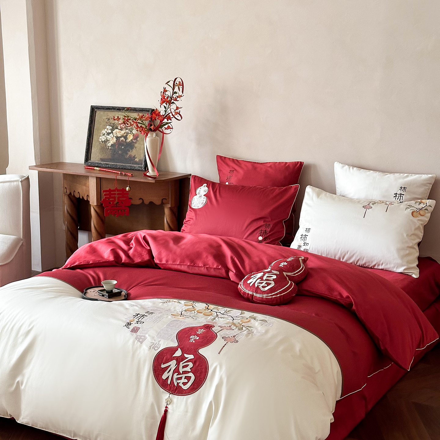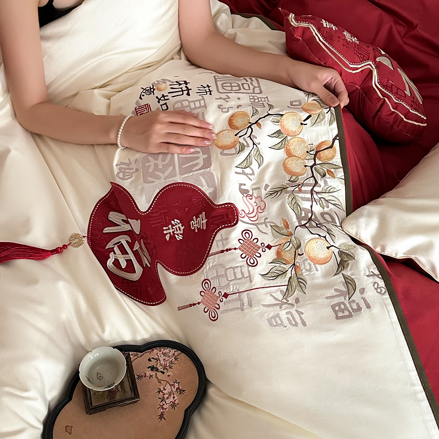(总)西西家居 2025新款100支长绒棉大红婚庆四件套-柿柿如意