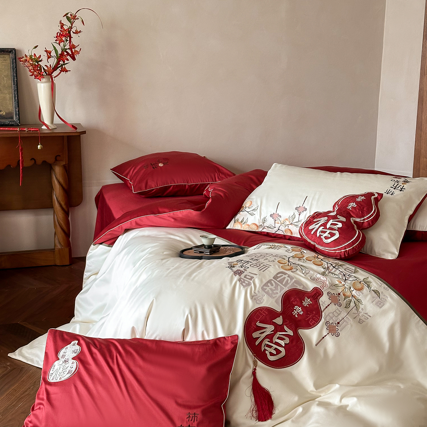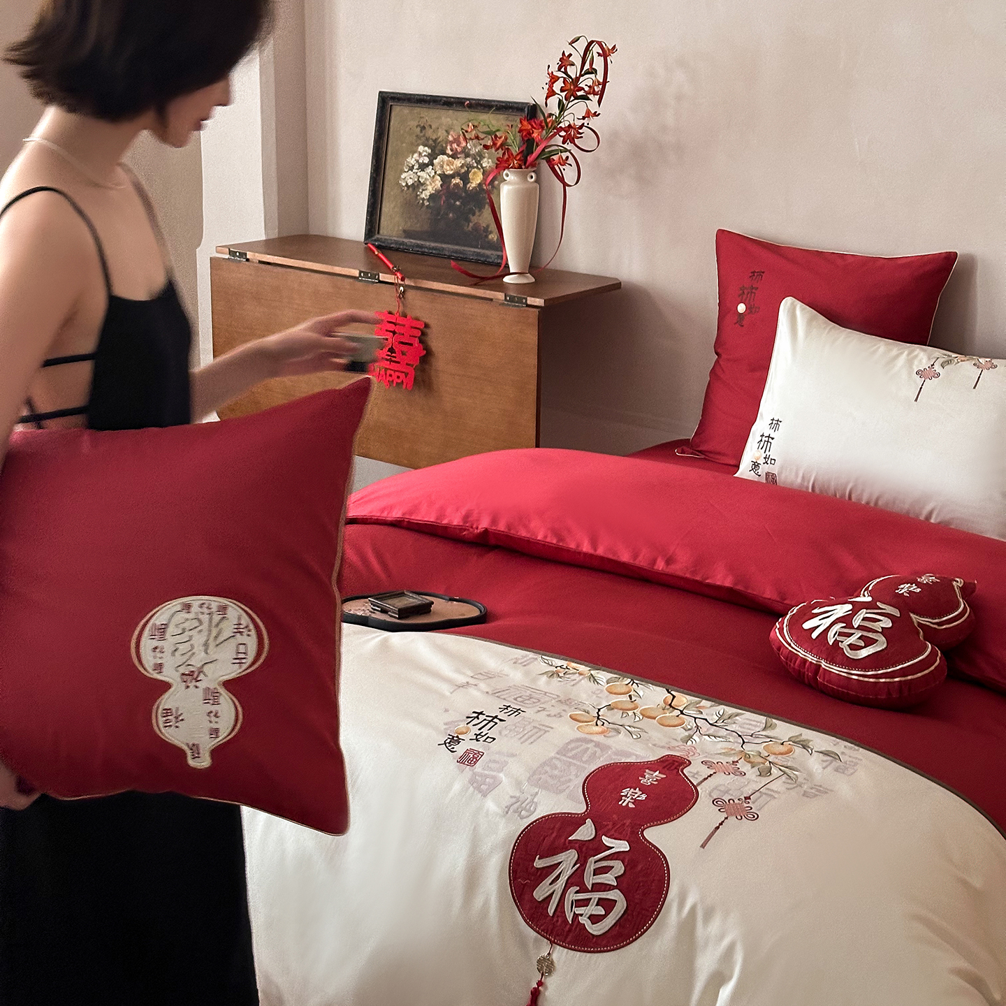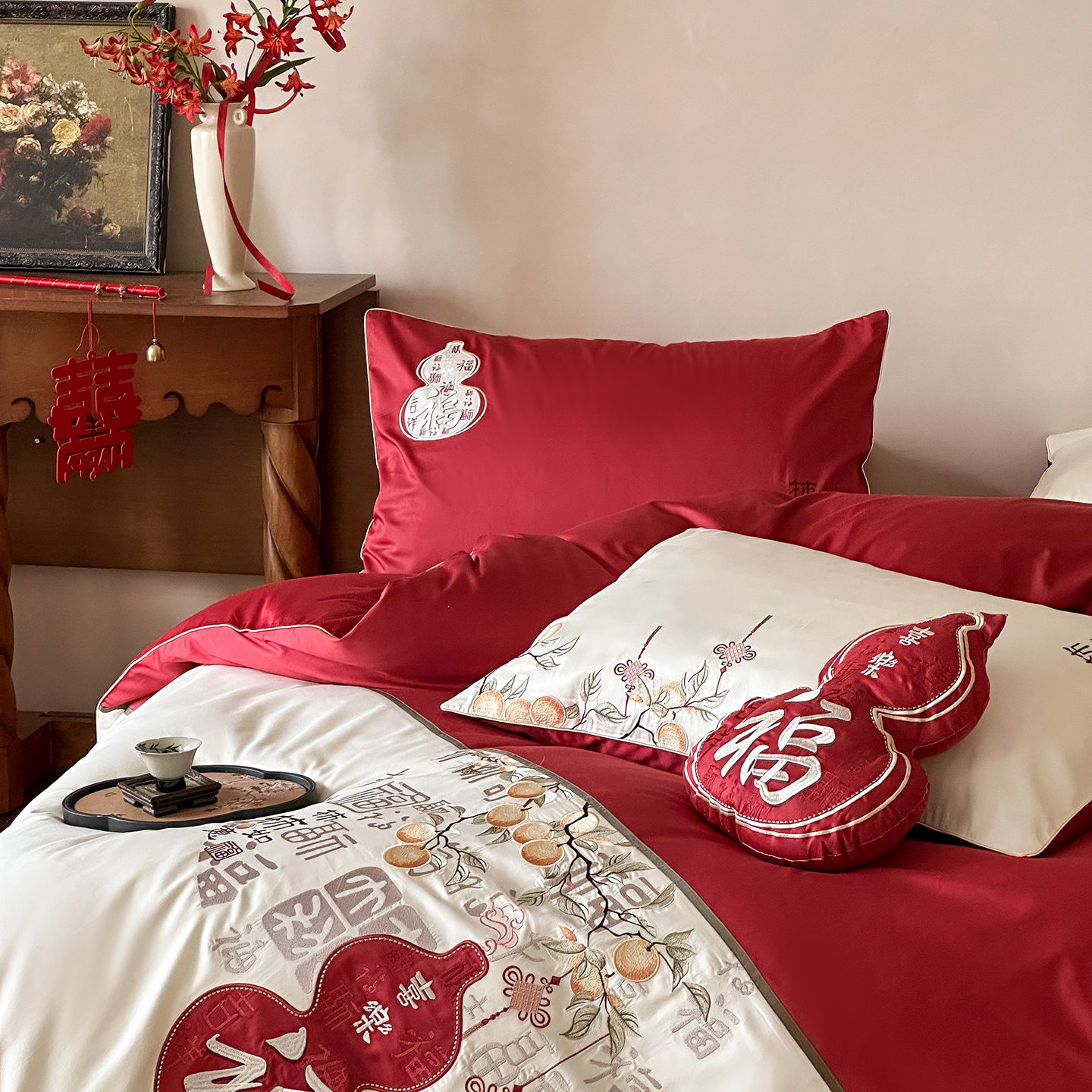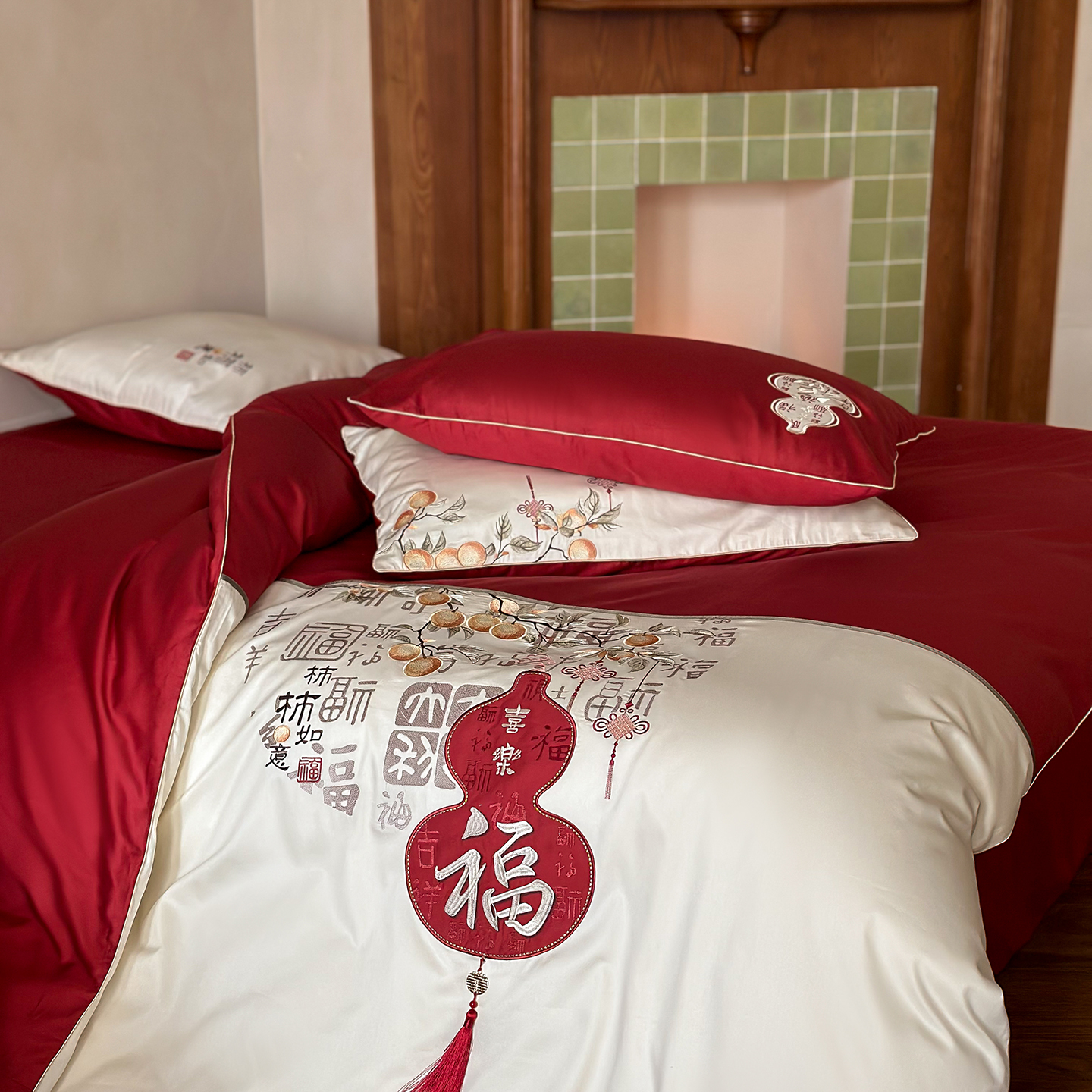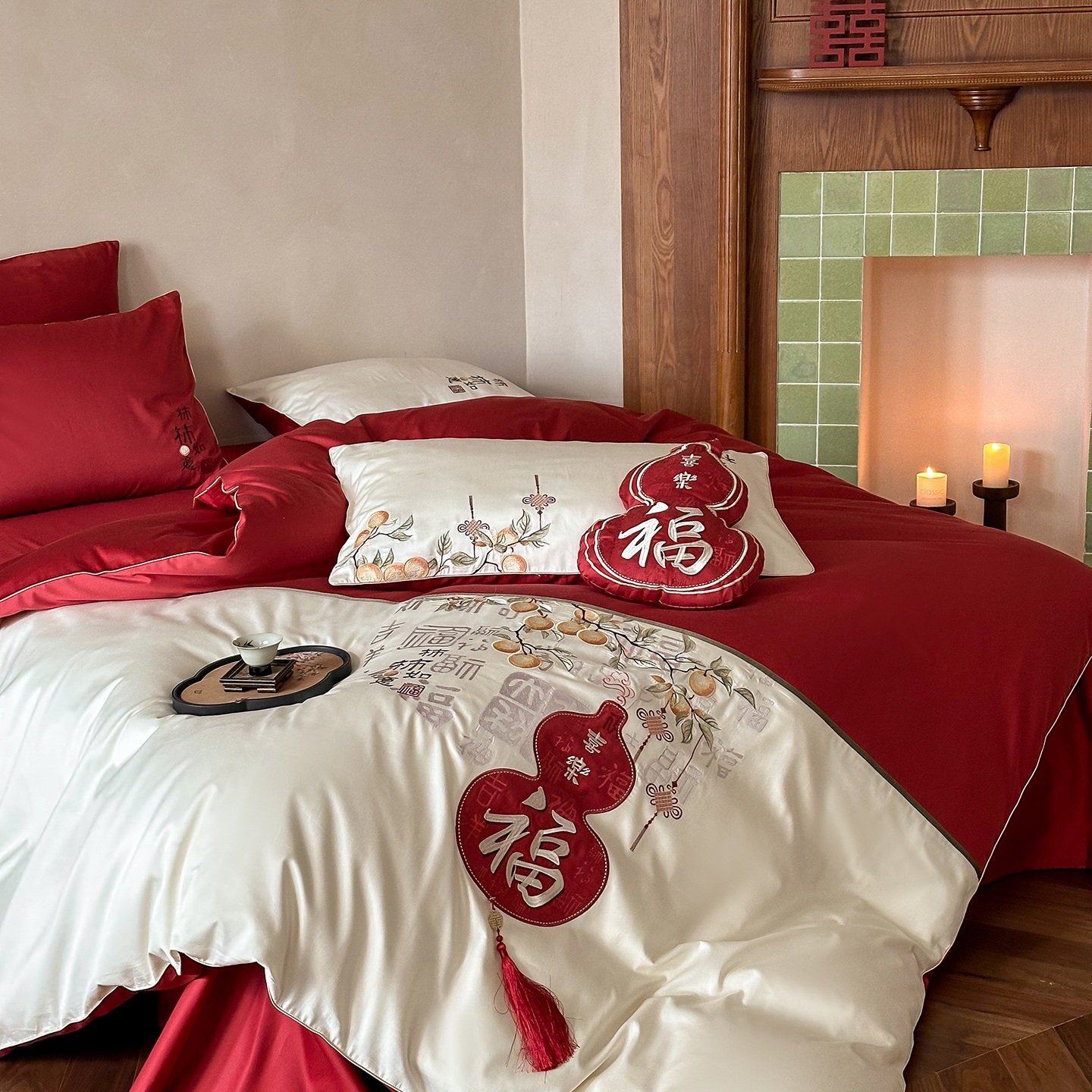 (总)西西家居 2025新款100支长绒棉大红婚庆四件套-柿柿如意
