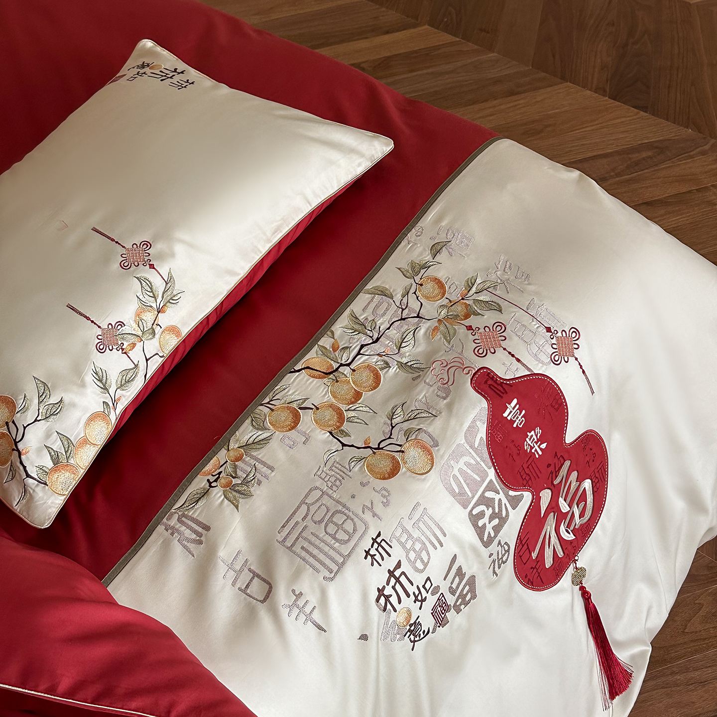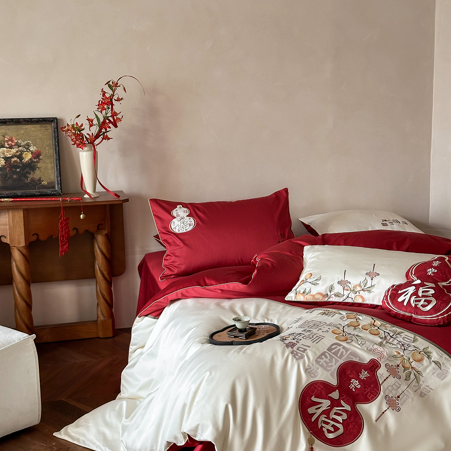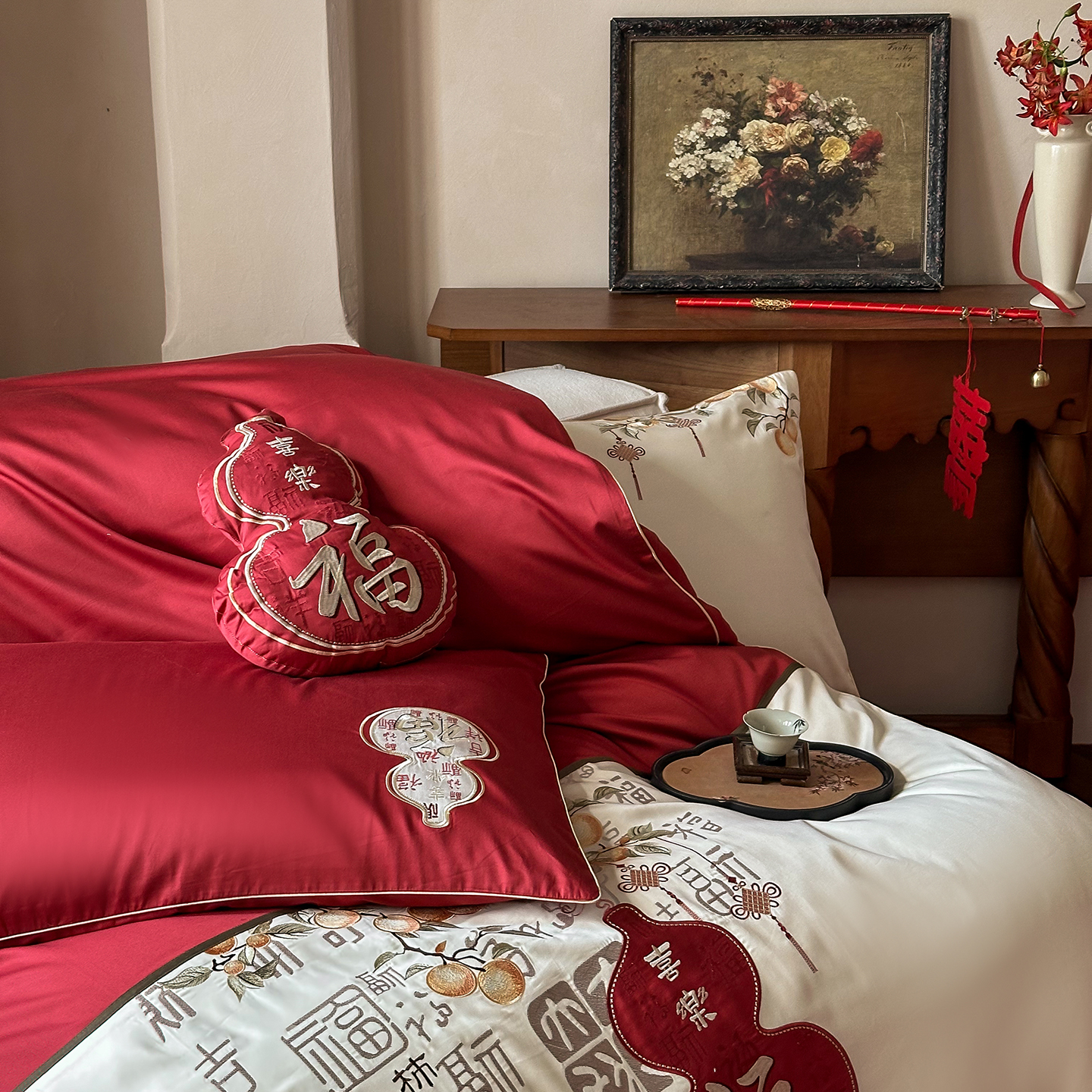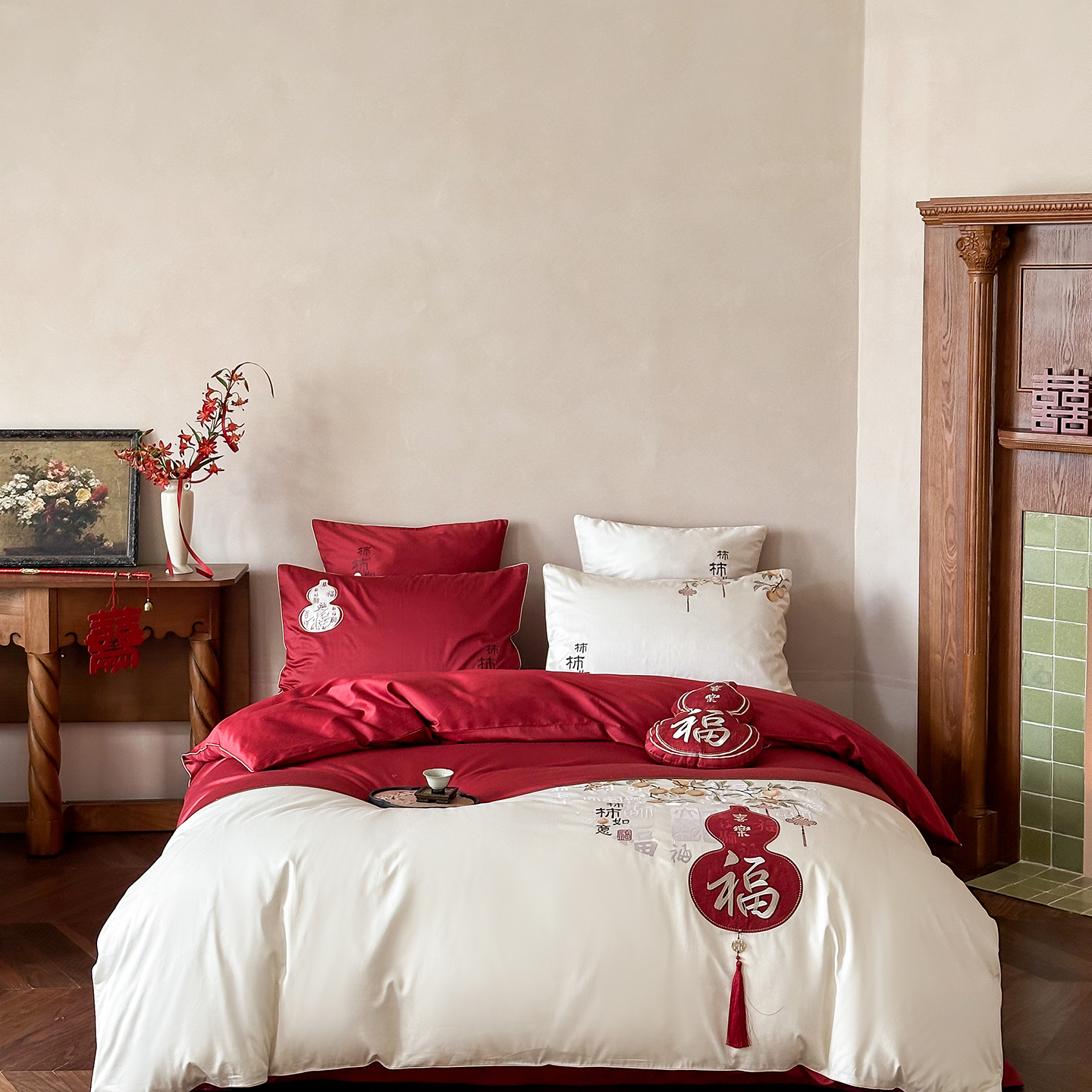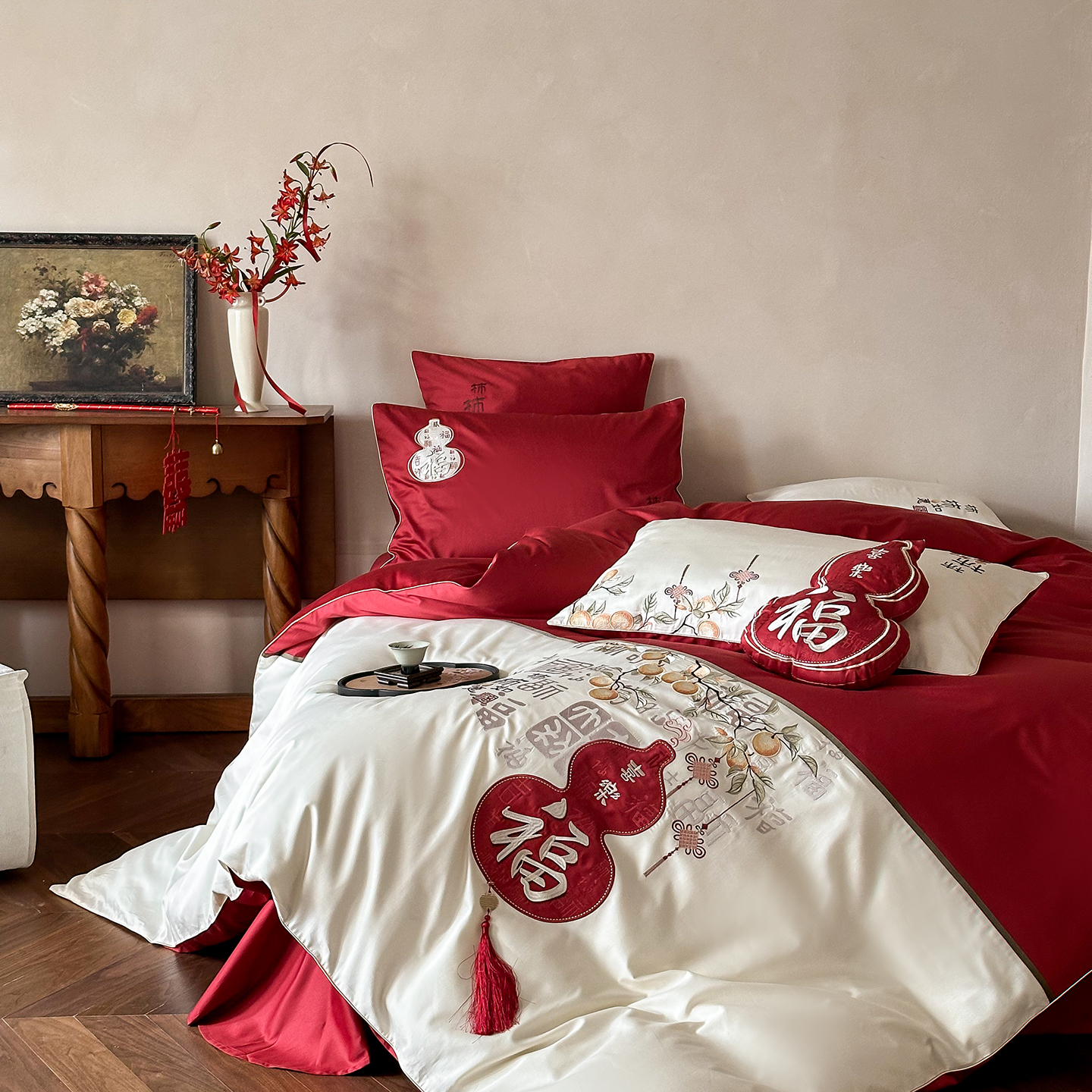 (总)西西家居 2025新款100支长绒棉大红婚庆四件套-柿柿如意