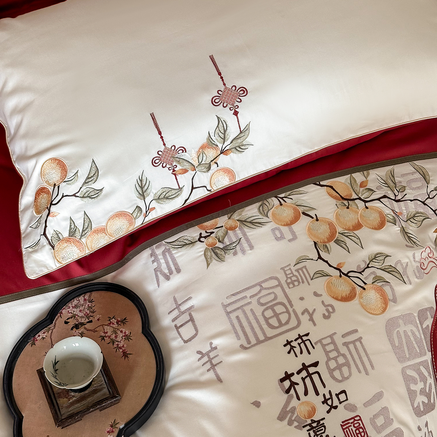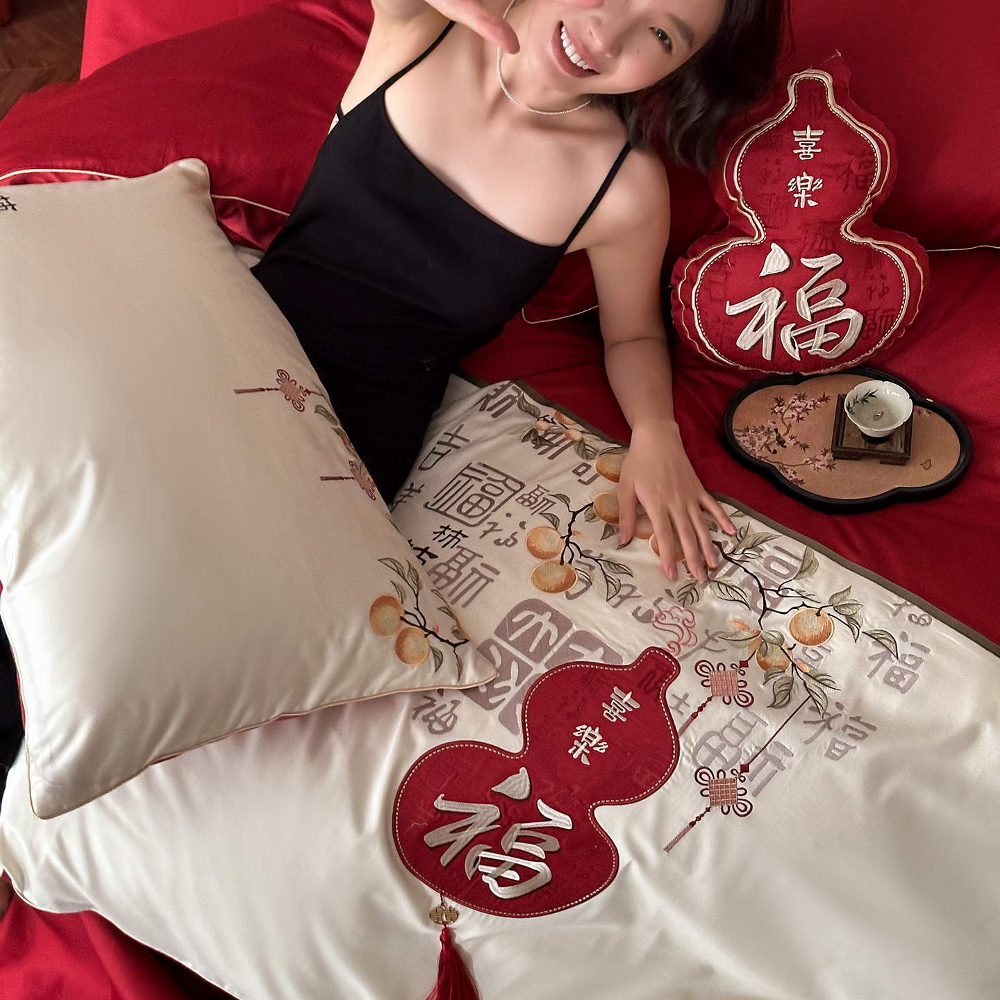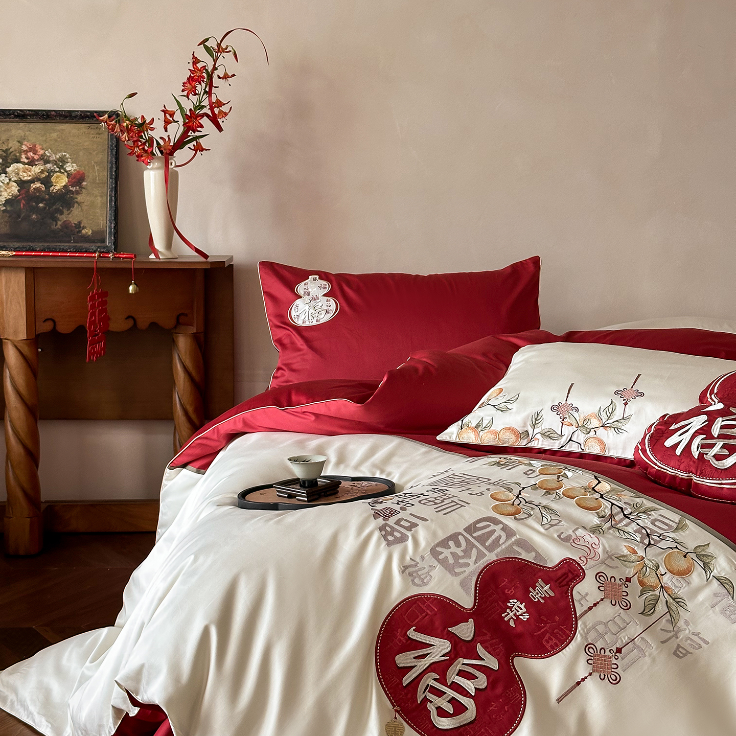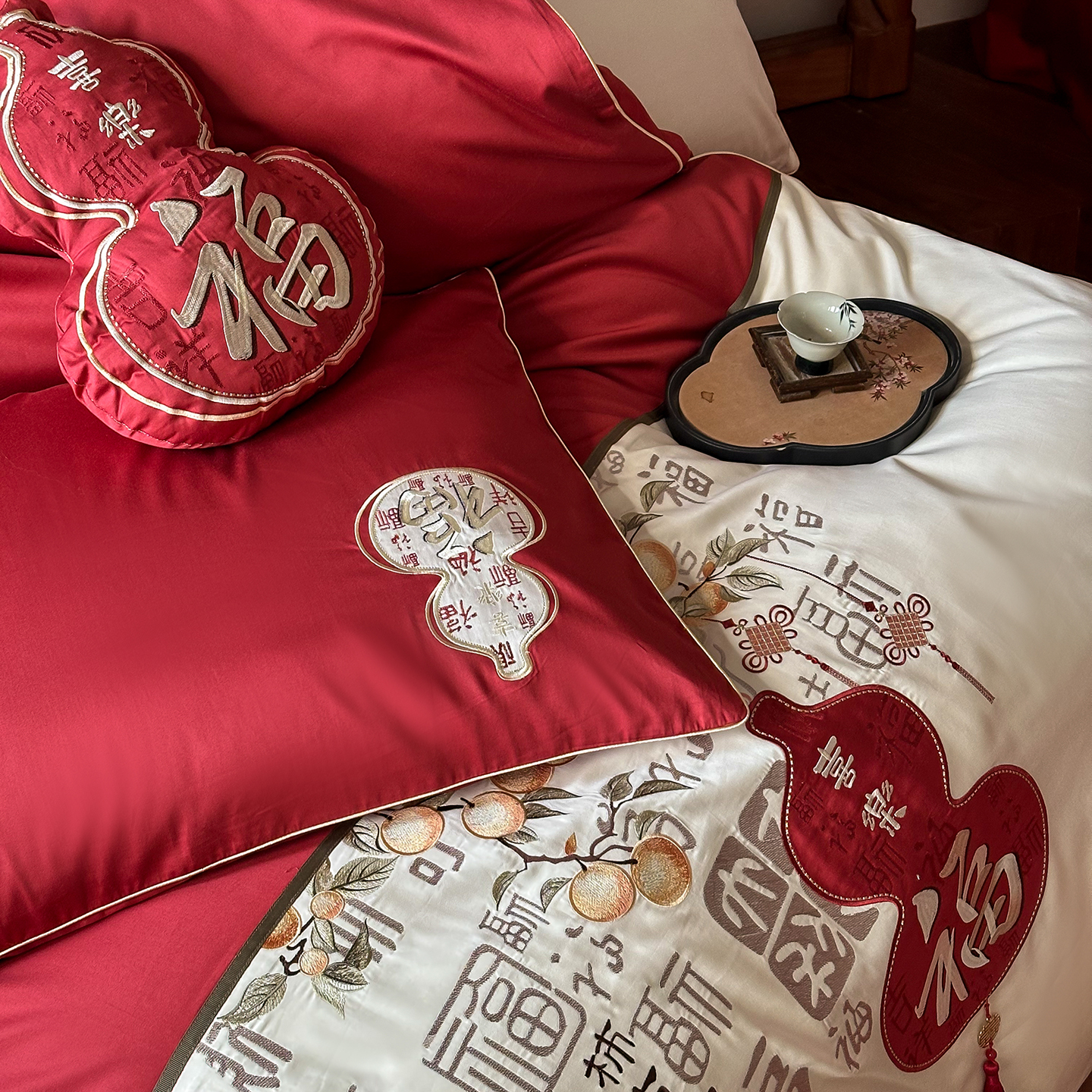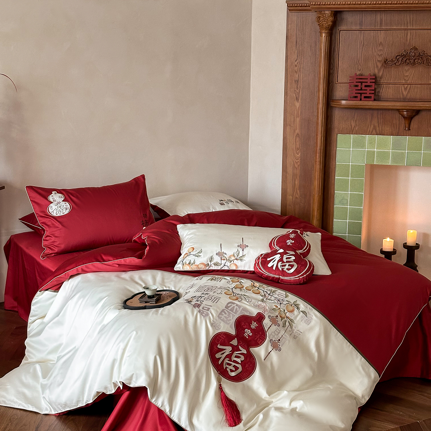 (总)西西家居 2025新款100支长绒棉大红婚庆四件套-柿柿如意