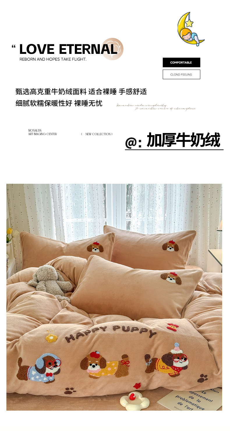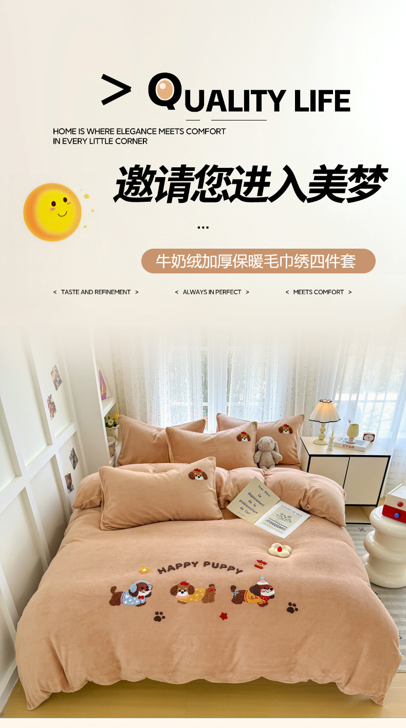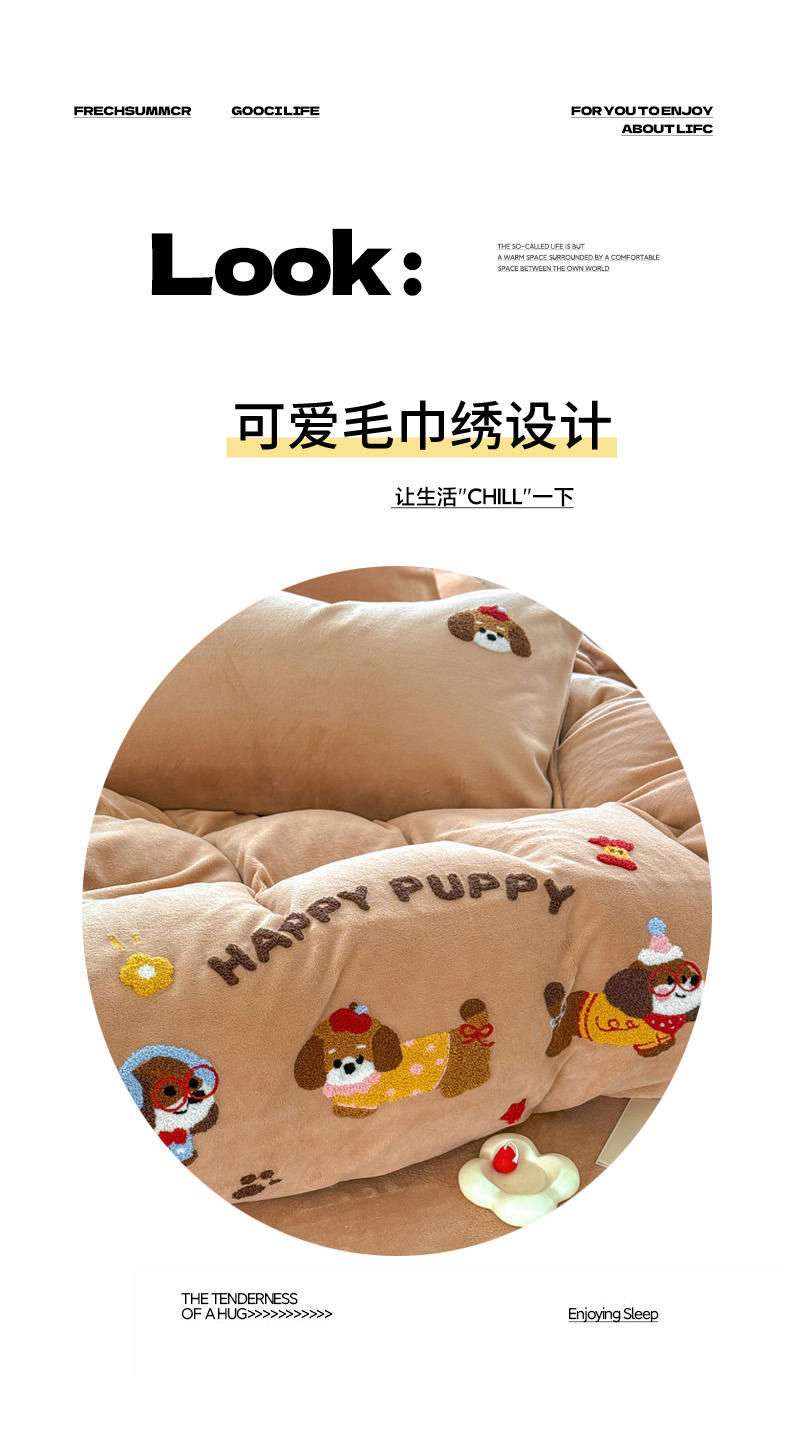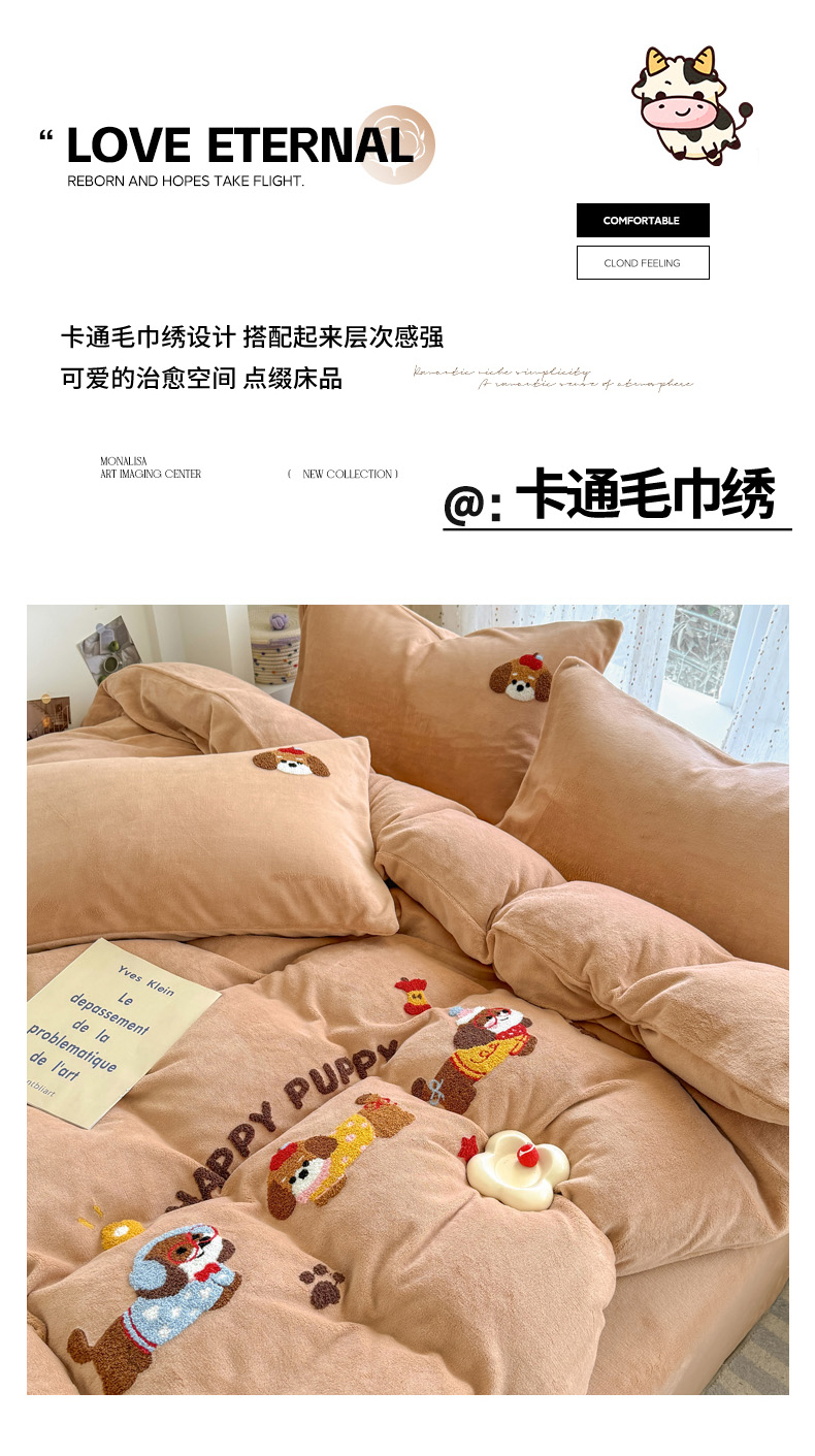 (总)恋佳居 2025新款高克重全工艺牛奶绒毛巾绣四件套,嗨皮狗复古紫,嗨皮狗咖色,嗨皮狗米色,恐龙绿色,恐龙米色,熊猫绿色,熊猫米色,中式熊猫绿色,中式熊猫米色
