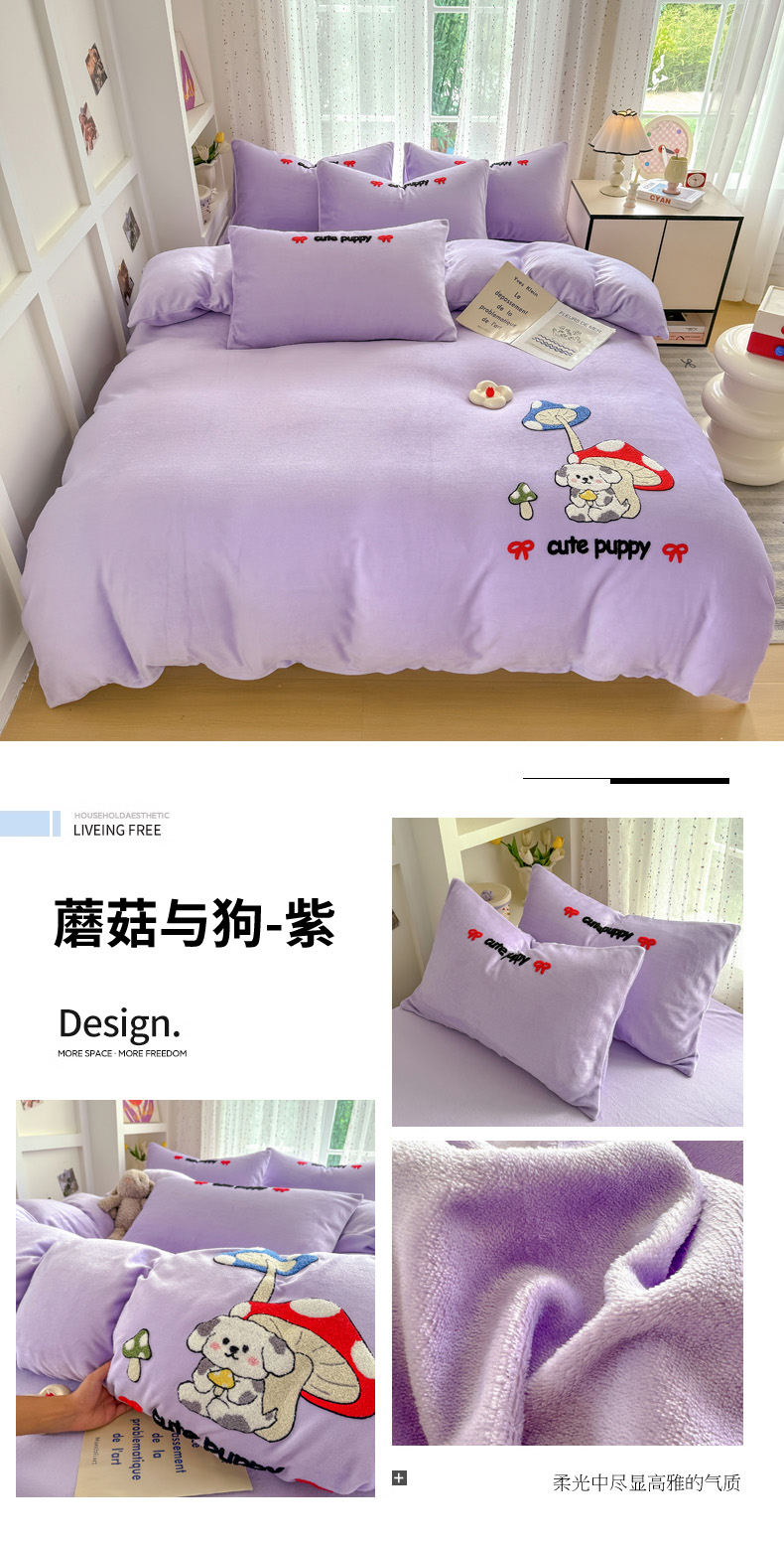 (总)恋佳居 2025新款卡通毛巾绣牛奶绒绣花四件套,花匠布布,可爱狗,萌趣,蘑菇与狗-粉,蘑菇与狗-紫,太空小恐龙,甜品时光,音乐派对,月亮天使