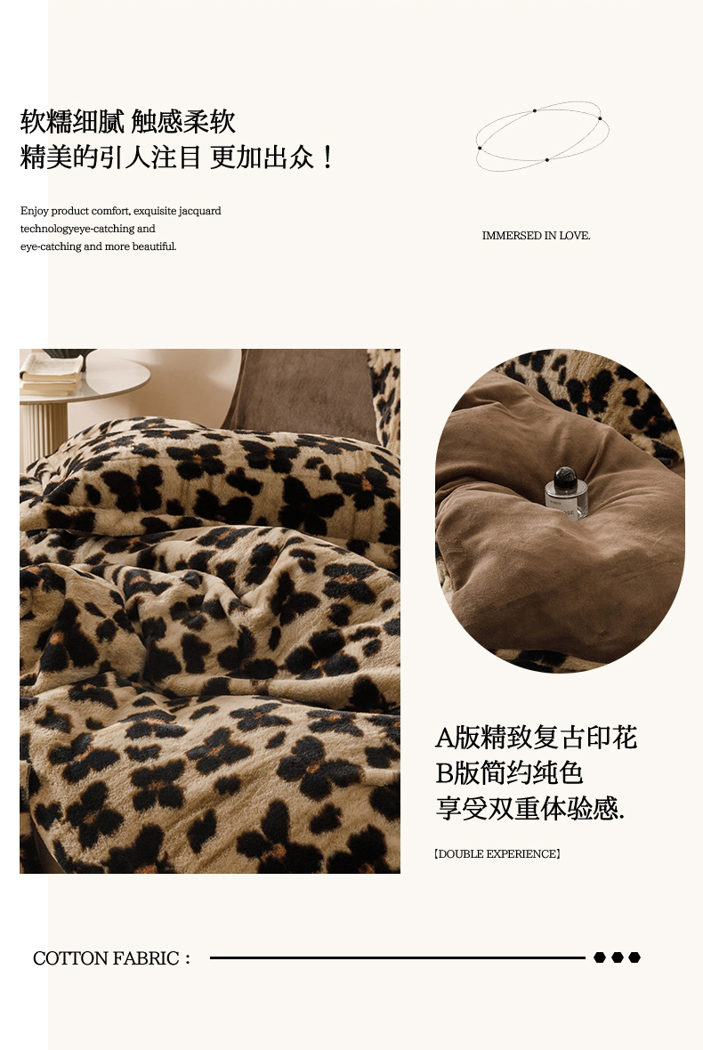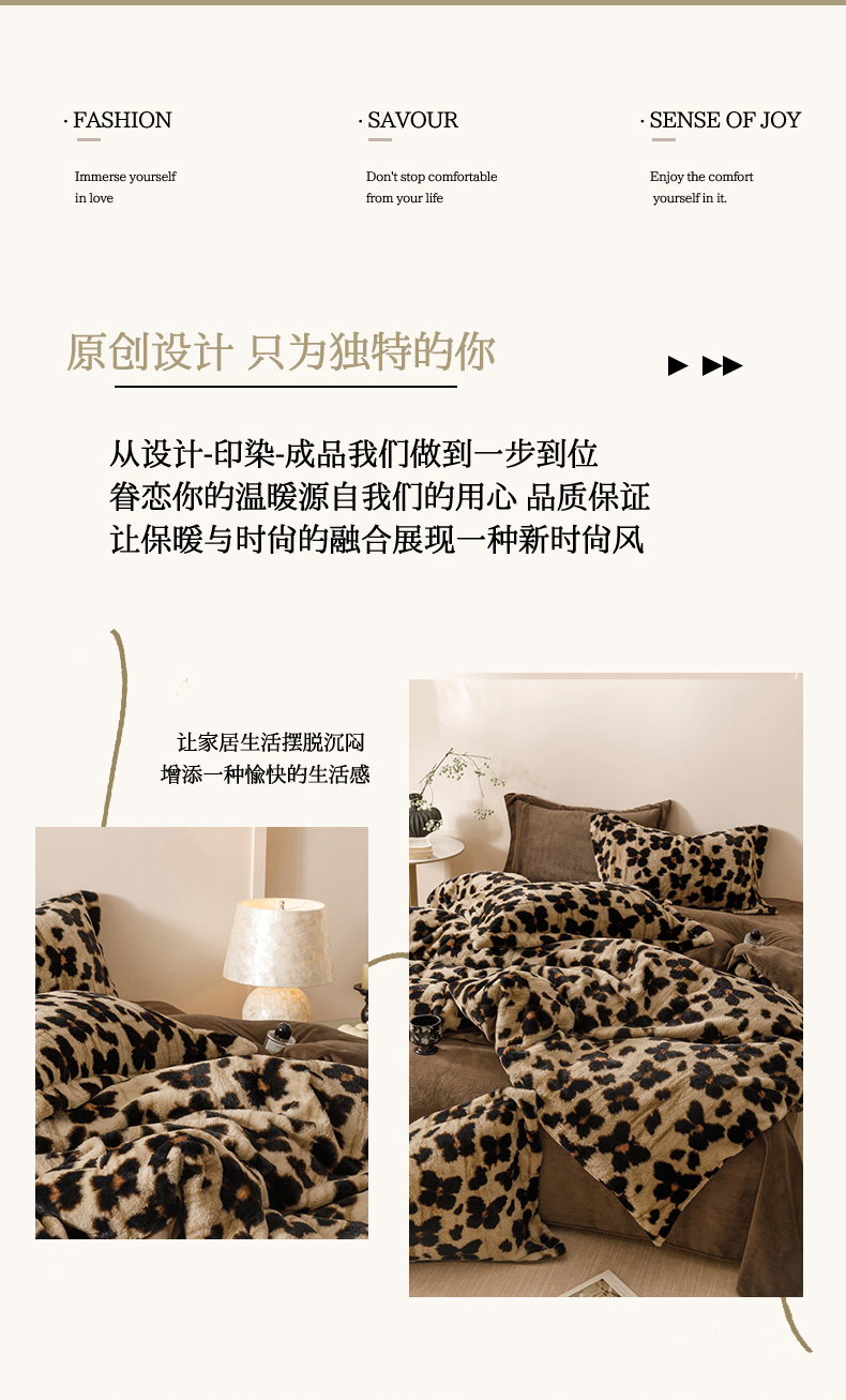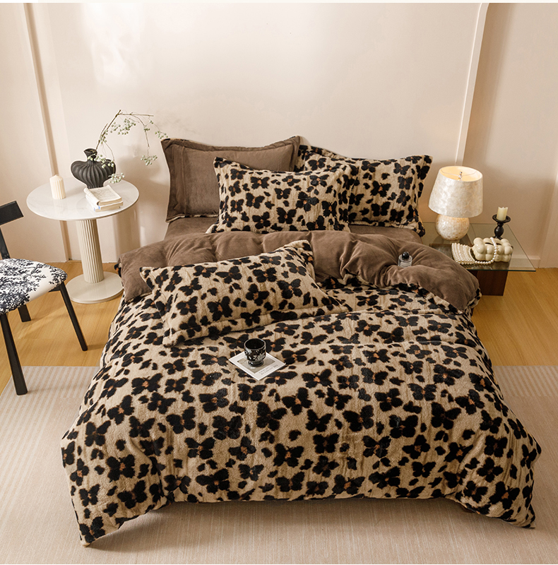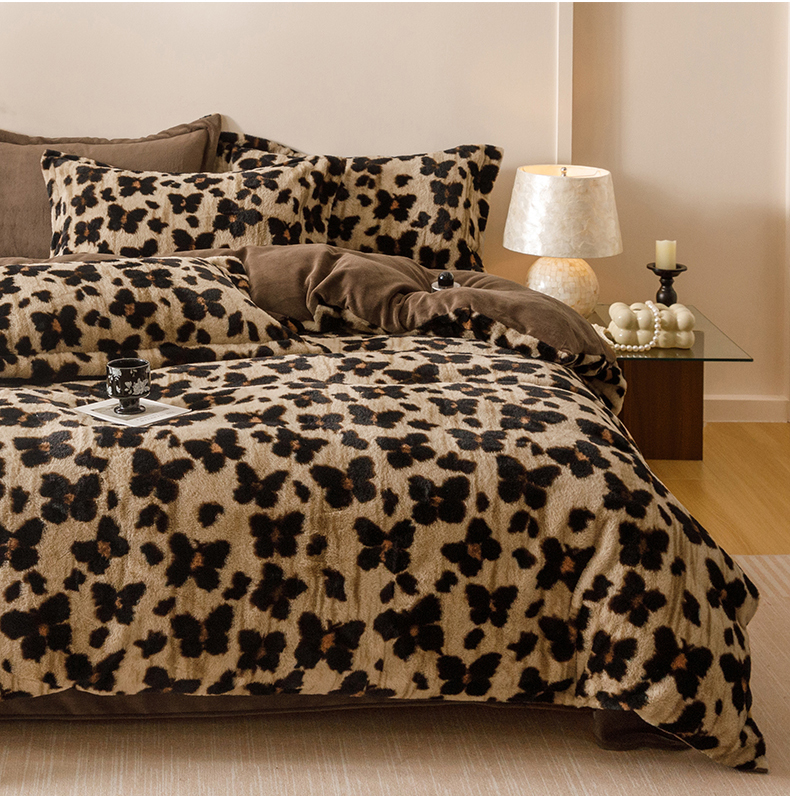 商品名称:艾莱家纺 2025新款A类美拉德系兔绒超柔保暖四件套 蝶豹-咖棕