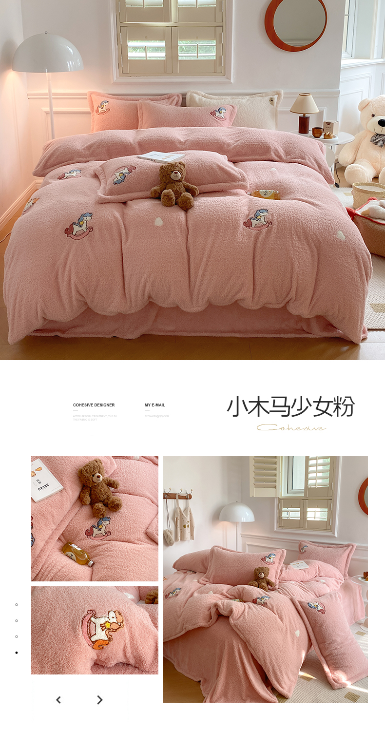 (总)萝莉家纺 2023新款230克高克重软绵绵的泰迪绒四件套,小免蓝,小木马少女粉,小木马水兰,小兔茶粉,小熊奶白,熊豆绿