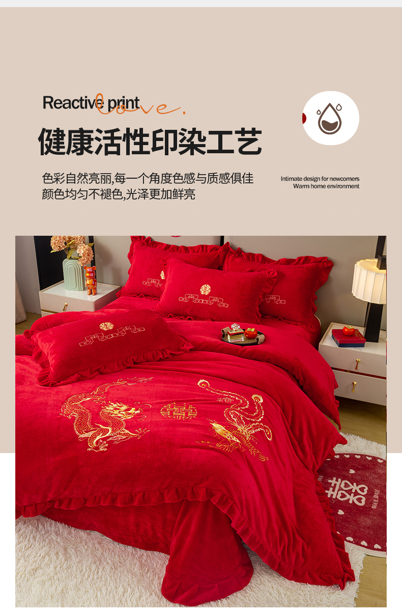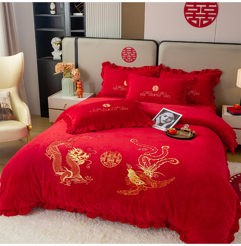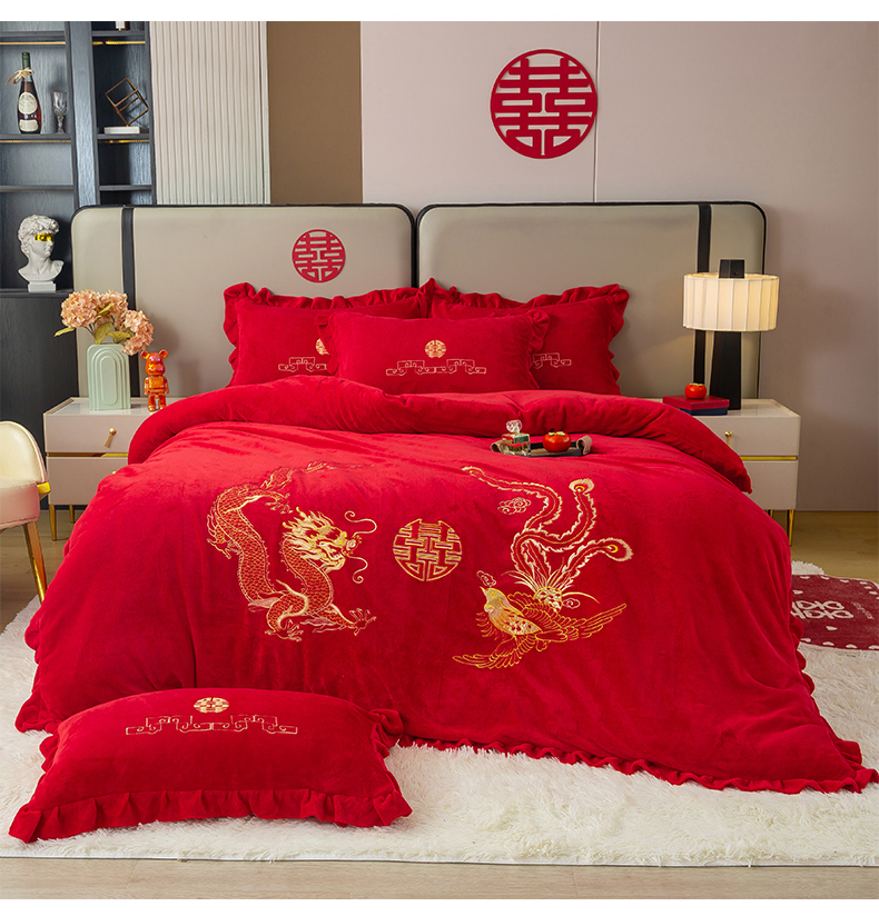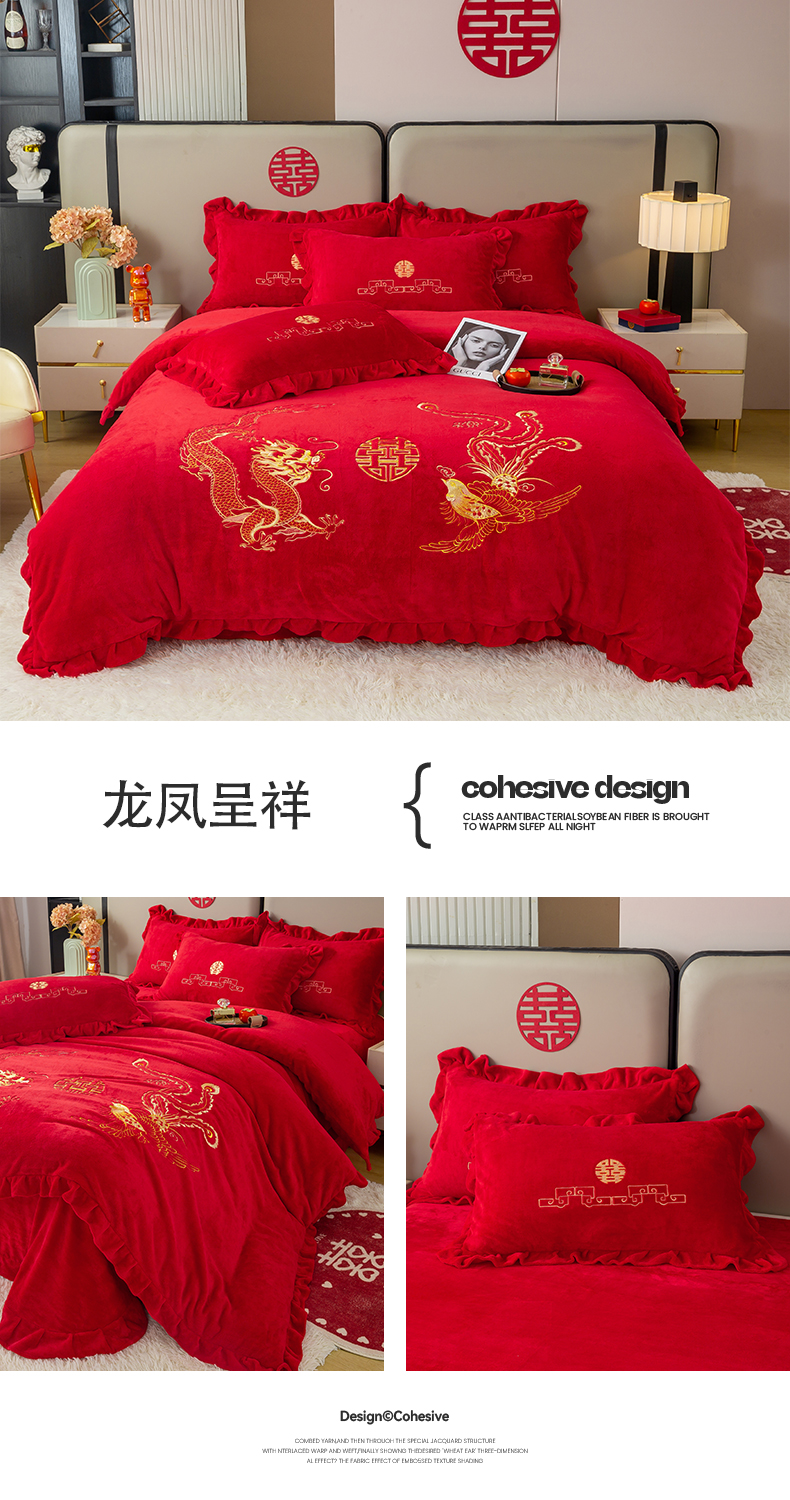 商品名称:银石 2025新款230克全消光牛奶绒婚庆大红高克重四件套 龙凤呈祥