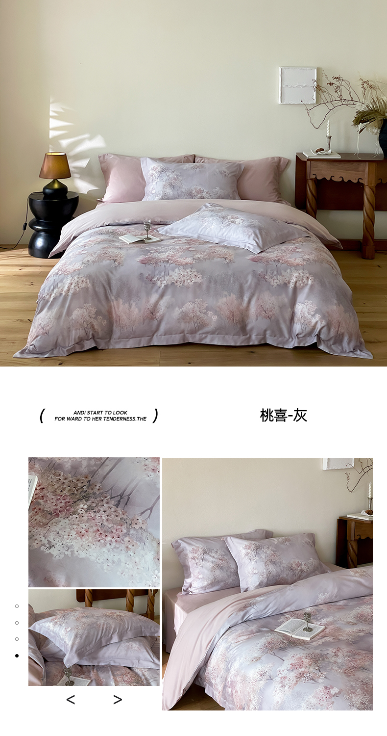 商品名称:禾时 2025新款天丝棉磨毛数码印花四件套 桃喜-灰