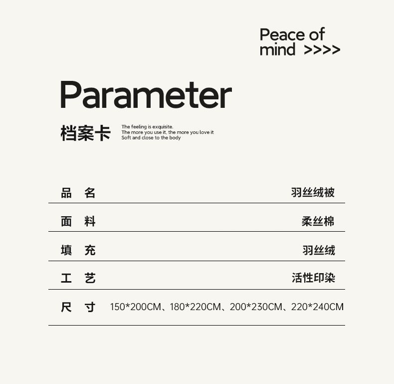 [{"sp_id":11,"sp_name":"\u989c\u8272","sp_format":2,"sp_list":[{"sp_value_id":1662,"sp_value_name":"\u7fbd\u767d","sp_value_image":{"id":999,"path":"https:\/\/img3.91jf.com\/ghelp\/2025\/20250919\/20250919124219_581911.jpeg"},"sp_value_video":{"id":0,"img":"","path":"","time":0,"download_num":0,"play_num":0},"price":"33.00","storage":12000,"weight":"1.500","is_check_weight":0,"plus_price":"","sp_sort":0},{"sp_value_id":1663,"sp_value_name":"\u7fbd\u7c89","sp_value_image":{"id":999,"path":"https:\/\/img3.91jf.com\/ghelp\/2025\/20250919\/20250919124221_474434.jpeg"},"sp_value_video":{"id":0,"img":"","path":"","time":0,"download_num":0,"play_num":0},"price":"33.00","storage":12000,"weight":"1.500","is_check_weight":0,"plus_price":"","sp_sort":0},{"sp_value_id":1664,"sp_value_name":"\u7fbd\u7070","sp_value_image":{"id":999,"path":"https:\/\/img3.91jf.com\/ghelp\/2025\/20250919\/20250919124223_221352.jpeg"},"sp_value_video":{"id":0,"img":"","path":"","time":0,"download_num":0,"play_num":0},"price":"33.00","storage":12000,"weight":"1.500","is_check_weight":0,"plus_price":"","sp_sort":0},{"sp_value_id":1665,"sp_value_name":"\u7fbd\u5170\u7070","sp_value_image":{"id":999,"path":"https:\/\/img3.91jf.com\/ghelp\/2025\/20250919\/20250919124225_417551.jpeg"},"sp_value_video":{"id":0,"img":"","path":"","time":0,"download_num":0,"play_num":0},"price":"33.00","storage":12000,"weight":"1.500","is_check_weight":0,"plus_price":"","sp_sort":0},{"sp_value_id":1666,"sp_value_name":"\u7fbd\u84dd","sp_value_image":{"id":999,"path":"https:\/\/img3.91jf.com\/ghelp\/2025\/20250919\/20250919124227_474897.jpeg"},"sp_value_video":{"id":0,"img":"","path":"","time":0,"download_num":0,"play_num":0},"price":"33.00","storage":12000,"weight":"1.500","is_check_weight":0,"plus_price":"","sp_sort":0},{"sp_value_id":1667,"sp_value_name":"\u7fbd\u9a7c","sp_value_image":{"id":999,"path":"https:\/\/img3.91jf.com\/ghelp\/2025\/20250919\/20250919124229_147506.jpeg"},"sp_value_video":{"id":0,"img":"","path":"","time":0,"download_num":0,"play_num":0},"price":"33.00","storage":12000,"weight":"1.500","is_check_weight":0,"plus_price":"","sp_sort":0}]},{"sp_id":27,"sp_name":"\u5c3a\u5bf8","sp_format":1,"sp_list":[{"sp_value_id":302,"sp_value_name":"150x200cm(3\u65a4)","sp_value_image":{"id":0,"path":""},"sp_value_video":{"id":0,"img":"","path":"","time":0,"download_num":0,"play_num":0},"price":"33.00","storage":500,"weight":"1.500","is_check_weight":0,"plus_price":"","sp_sort":5},{"sp_value_id":303,"sp_value_name":"150x200cm(4\u65a4)","sp_value_image":{"id":0,"path":""},"sp_value_video":{"id":0,"img":"","path":"","time":0,"download_num":0,"play_num":0},"price":"41.00","storage":500,"weight":"2.000","is_check_weight":0,"plus_price":"","sp_sort":6},{"sp_value_id":304,"sp_value_name":"150x200cm(5\u65a4\uff09","sp_value_image":{"id":0,"path":""},"sp_value_video":{"id":0,"img":"","path":"","time":0,"download_num":0,"play_num":0},"price":"49.00","storage":500,"weight":"2.500","is_check_weight":0,"plus_price":"","sp_sort":7},{"sp_value_id":305,"sp_value_name":"150x200cm(6\u65a4)","sp_value_image":{"id":0,"path":""},"sp_value_video":{"id":0,"img":"","path":"","time":0,"download_num":0,"play_num":0},"price":"57.00","storage":500,"weight":"3.000","is_check_weight":0,"plus_price":"","sp_sort":8},{"sp_value_id":306,"sp_value_name":"150x200cm(7\u65a4)","sp_value_image":{"id":0,"path":""},"sp_value_video":{"id":0,"img":"","path":"","time":0,"download_num":0,"play_num":0},"price":"65.00","storage":500,"weight":"3.500","is_check_weight":0,"plus_price":"","sp_sort":9},{"sp_value_id":307,"sp_value_name":"150x200cm(8\u65a4)","sp_value_image":{"id":0,"path":""},"sp_value_video":{"id":0,"img":"","path":"","time":0,"download_num":0,"play_num":0},"price":"73.00","storage":500,"weight":"4.000","is_check_weight":0,"plus_price":"","sp_sort":10},{"sp_value_id":308,"sp_value_name":"150x200cm(9\u65a4)","sp_value_image":{"id":0,"path":""},"sp_value_video":{"id":0,"img":"","path":"","time":0,"download_num":0,"play_num":0},"price":"81.00","storage":500,"weight":"4.500","is_check_weight":0,"plus_price":"","sp_sort":11},{"sp_value_id":309,"sp_value_name":"180x220cm(4\u65a4)","sp_value_image":{"id":0,"path":""},"sp_value_video":{"id":0,"img":"","path":"","time":0,"download_num":0,"play_num":0},"price":"45.00","storage":500,"weight":"2.000","is_check_weight":0,"plus_price":"","sp_sort":12},{"sp_value_id":310,"sp_value_name":"180x220cm(5\u65a4)","sp_value_image":{"id":0,"path":""},"sp_value_video":{"id":0,"img":"","path":"","time":0,"download_num":0,"play_num":0},"price":"53.00","storage":500,"weight":"2.500","is_check_weight":0,"plus_price":"","sp_sort":13},{"sp_value_id":311,"sp_value_name":"180x220cm(6\u65a4)","sp_value_image":{"id":0,"path":""},"sp_value_video":{"id":0,"img":"","path":"","time":0,"download_num":0,"play_num":0},"price":"61.00","storage":500,"weight":"3.000","is_check_weight":0,"plus_price":"","sp_sort":14},{"sp_value_id":312,"sp_value_name":"180x220cm(7\u65a4)","sp_value_image":{"id":0,"path":""},"sp_value_video":{"id":0,"img":"","path":"","time":0,"download_num":0,"play_num":0},"price":"69.00","storage":500,"weight":"3.500","is_check_weight":0,"plus_price":"","sp_sort":15},{"sp_value_id":313,"sp_value_name":"180x220cm(8\u65a4)","sp_value_image":{"id":0,"path":""},"sp_value_video":{"id":0,"img":"","path":"","time":0,"download_num":0,"play_num":0},"price":"77.00","storage":500,"weight":"4.000","is_check_weight":0,"plus_price":"","sp_sort":16},{"sp_value_id":314,"sp_value_name":"200x230cm(4\u65a4)","sp_value_image":{"id":0,"path":""},"sp_value_video":{"id":0,"img":"","path":"","time":0,"download_num":0,"play_num":0},"price":"49.00","storage":500,"weight":"2.000","is_check_weight":0,"plus_price":"","sp_sort":17},{"sp_value_id":315,"sp_value_name":"200x230cm(5\u65a4)","sp_value_image":{"id":0,"path":""},"sp_value_video":{"id":0,"img":"","path":"","time":0,"download_num":0,"play_num":0},"price":"57.00","storage":500,"weight":"2.500","is_check_weight":0,"plus