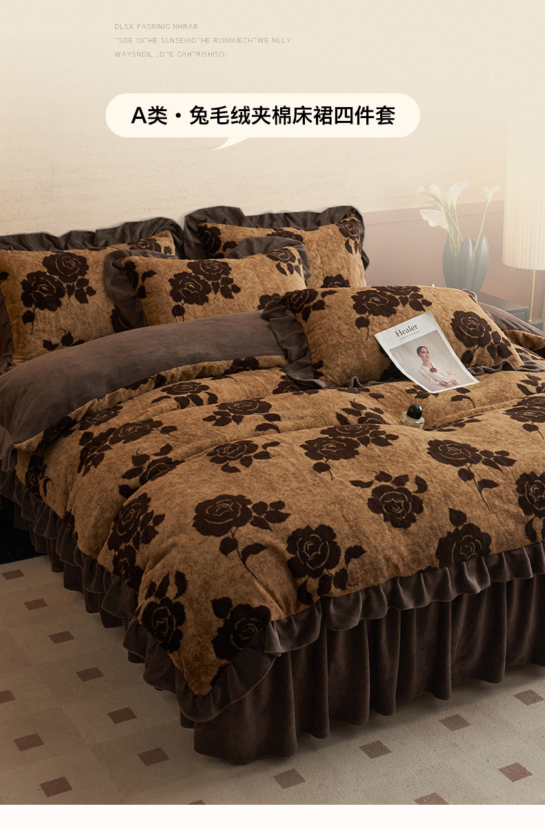 商品名称:金鹰 2025新款A类兔毛绒夹棉床裙四件套加厚牛奶绒四件套 梦幻蝴蝶-驼