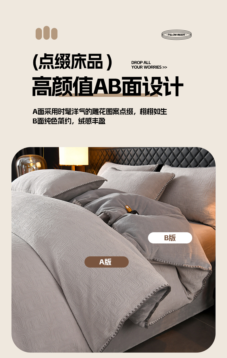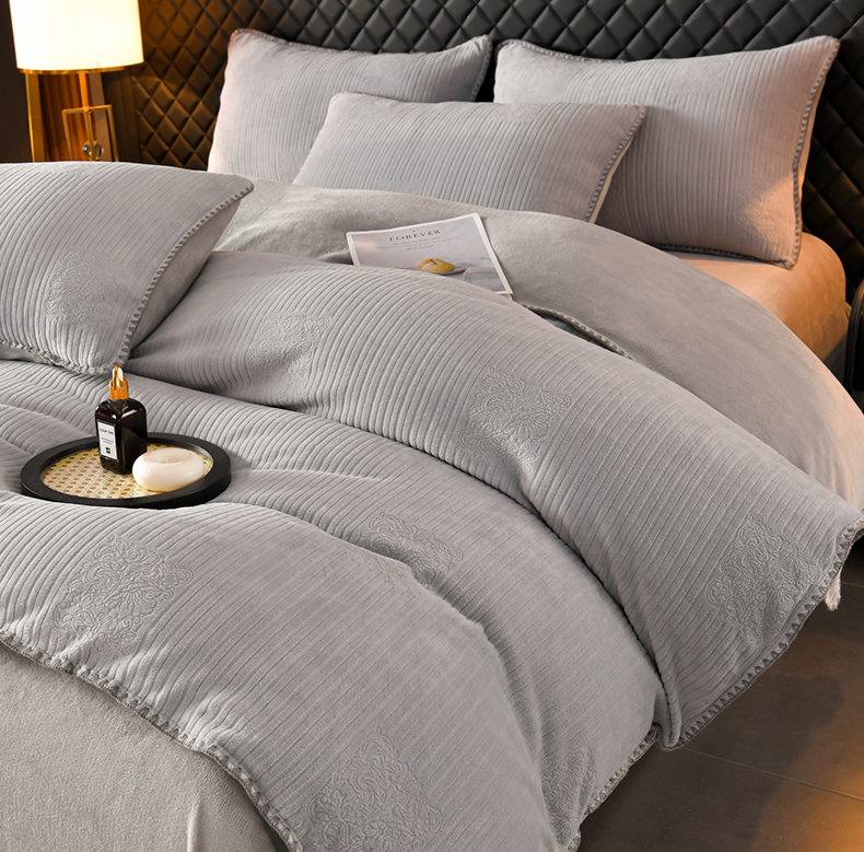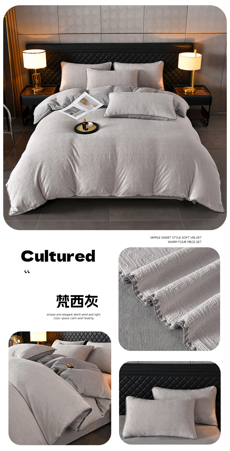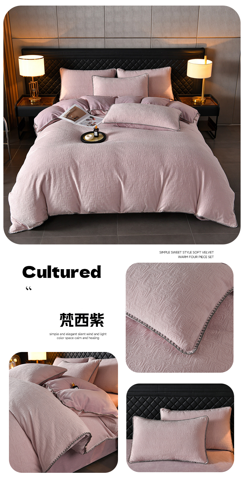 (总)菡宝2025新款工艺款贝壳边雕花绒简约良品风牛奶绒四件套-梵西系列 支持定做定制尺寸,梵西灰,梵西紫,米娅灰,米娅粉,洛璃灰,洛璃紫