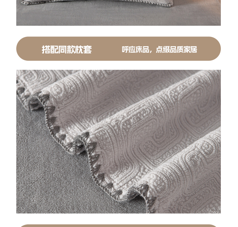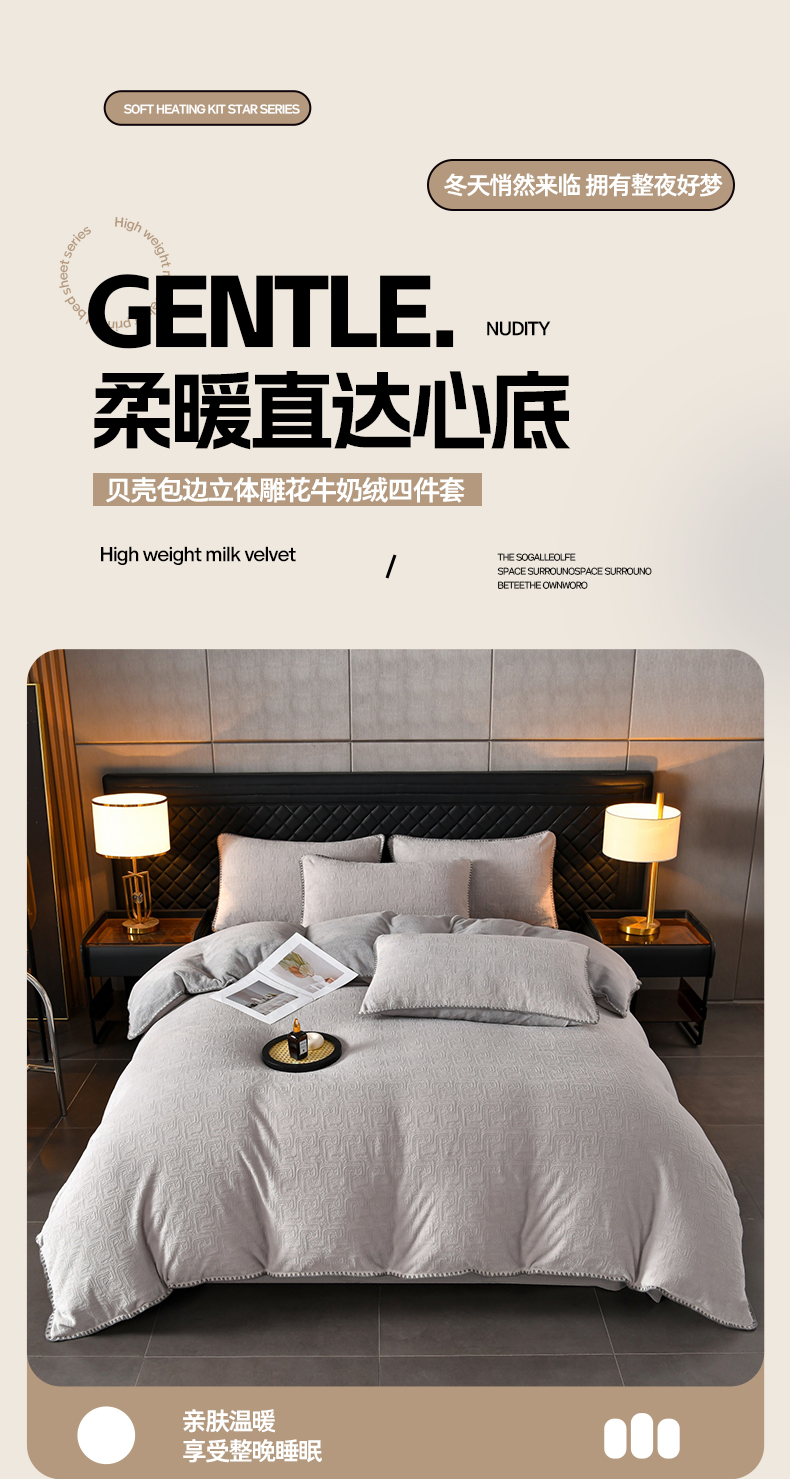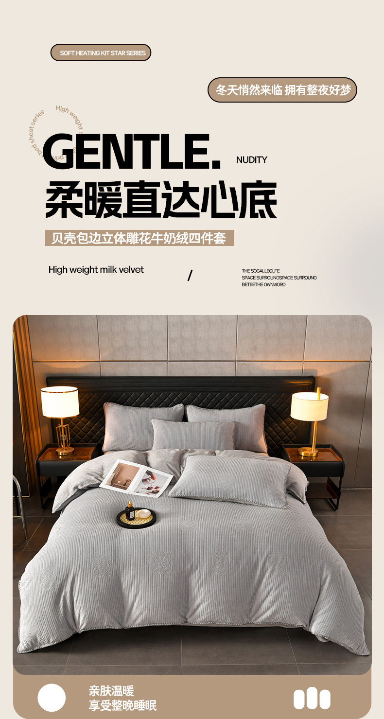 商品名称:(总)菡宝2025新款工艺款贝壳边雕花绒简约良品风牛奶绒四件套-梵西系列 支持定做定制尺寸