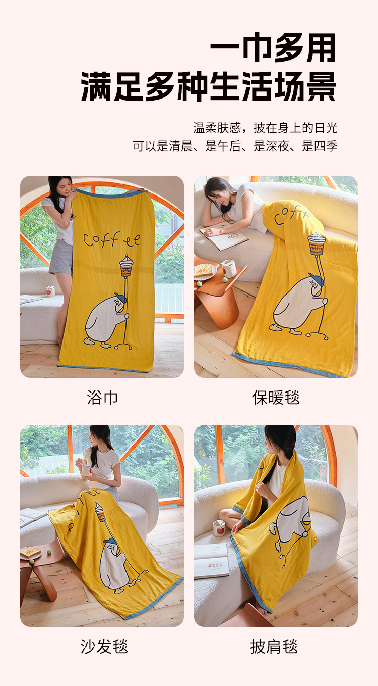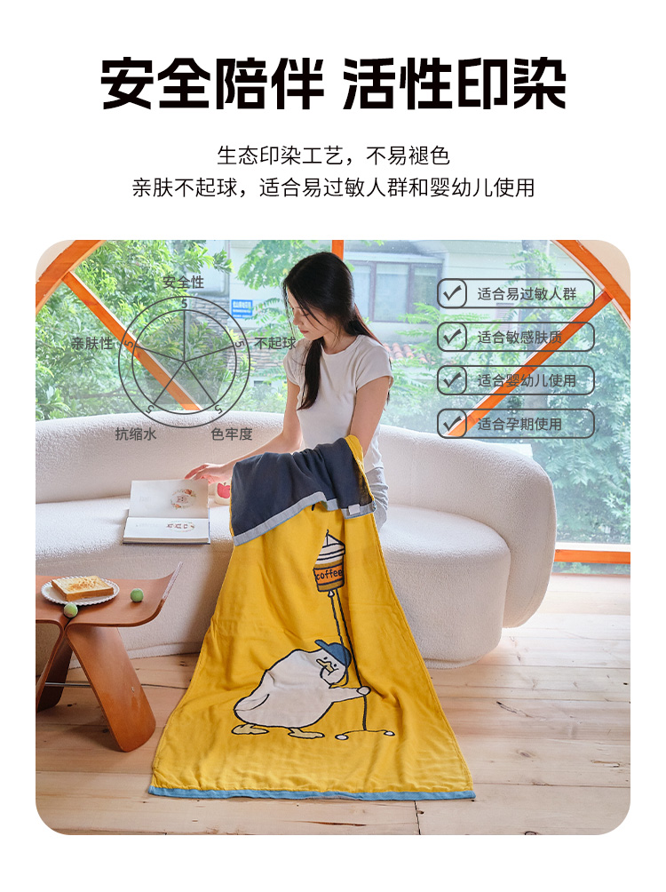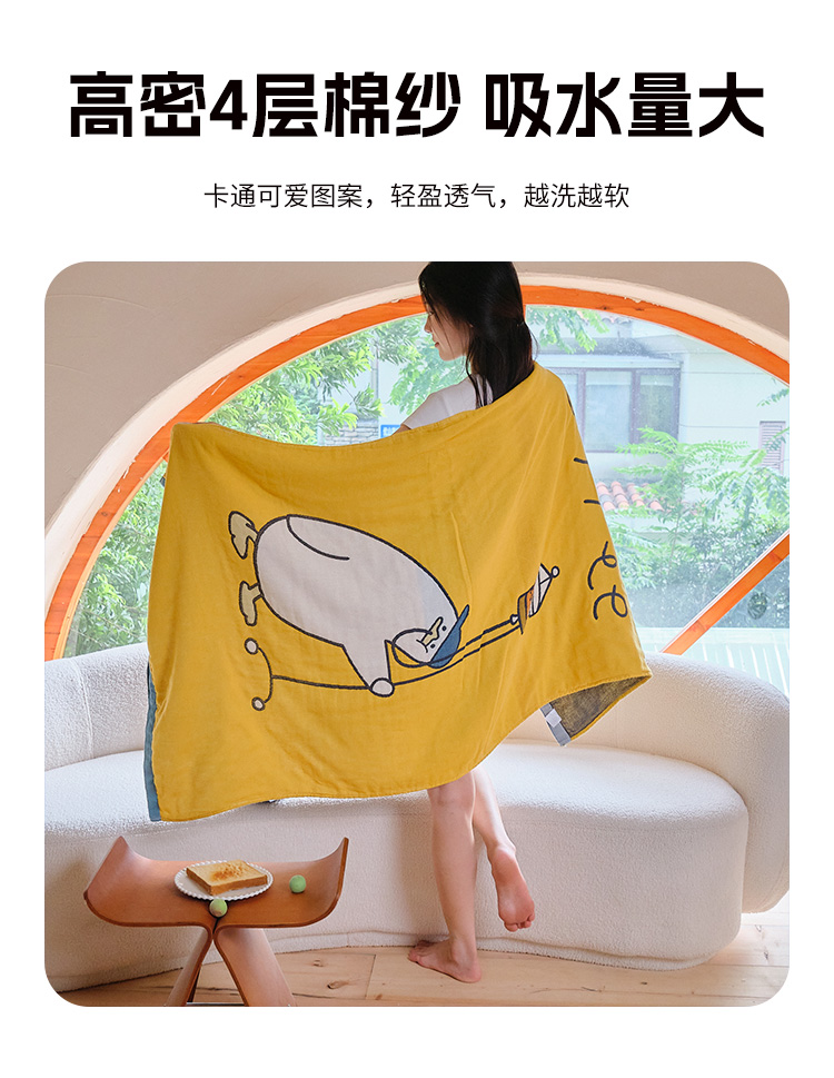 当前位置: 91家纺网 > 商品网购 > 居家日用 > 毛巾/浴巾/浴袍 > 浴巾 > 沐瑟家纺 2025新款卡通A类全棉四层纱布浴巾加大毛巾-第一组 咖啡鸭 80*160cm