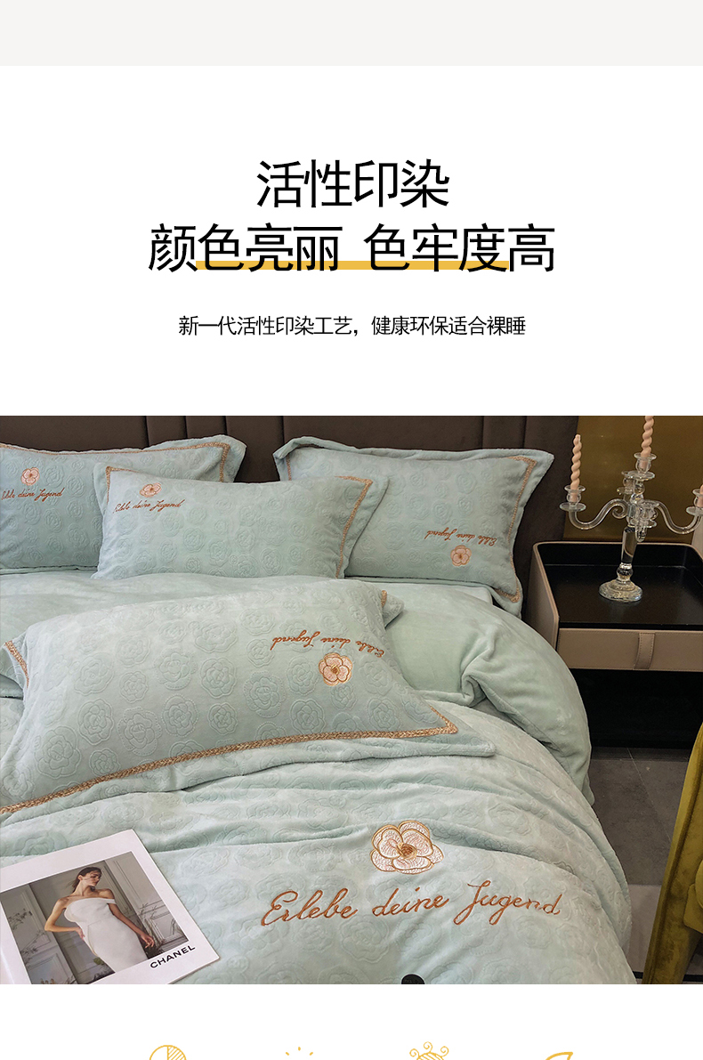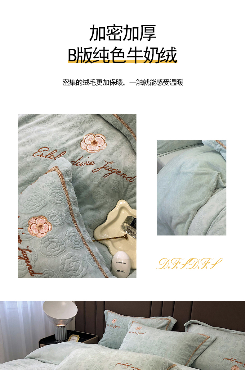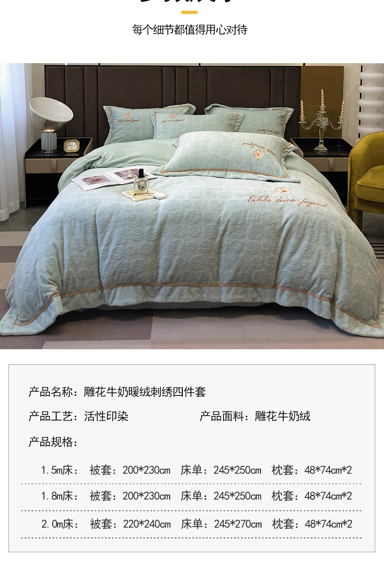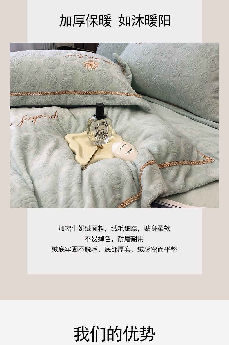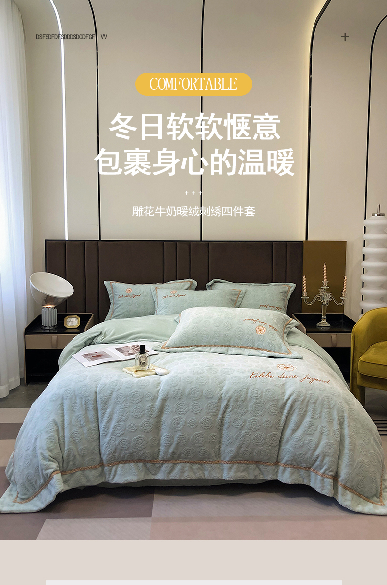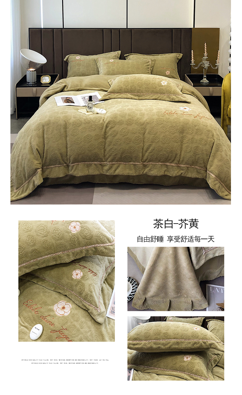 (总)娇逸家居 2025新款秋冬冰岛浮雕雕花牛奶暖绒刺绣四件套-茶白,茶白-海盐绿,茶白-芥黄,茶白-奶芙白,茶白-芝兰粉