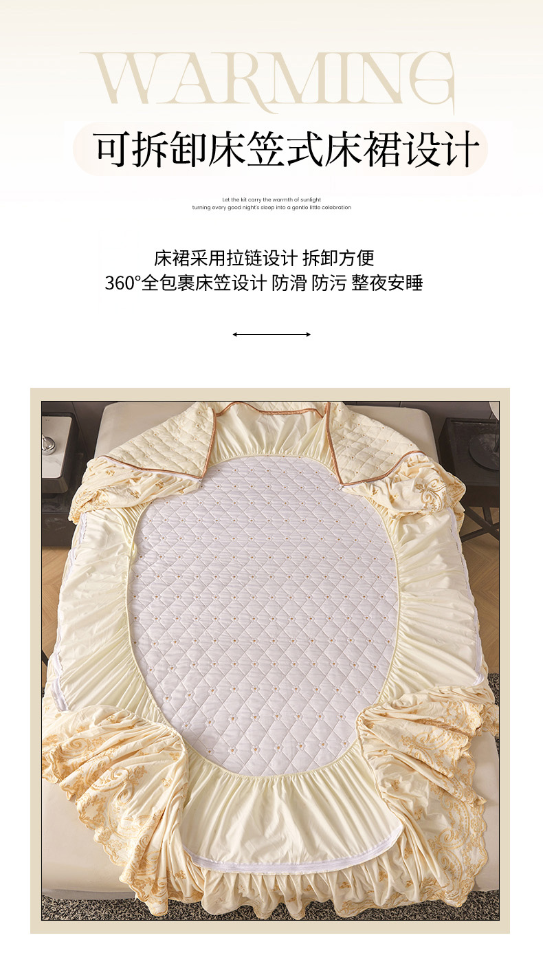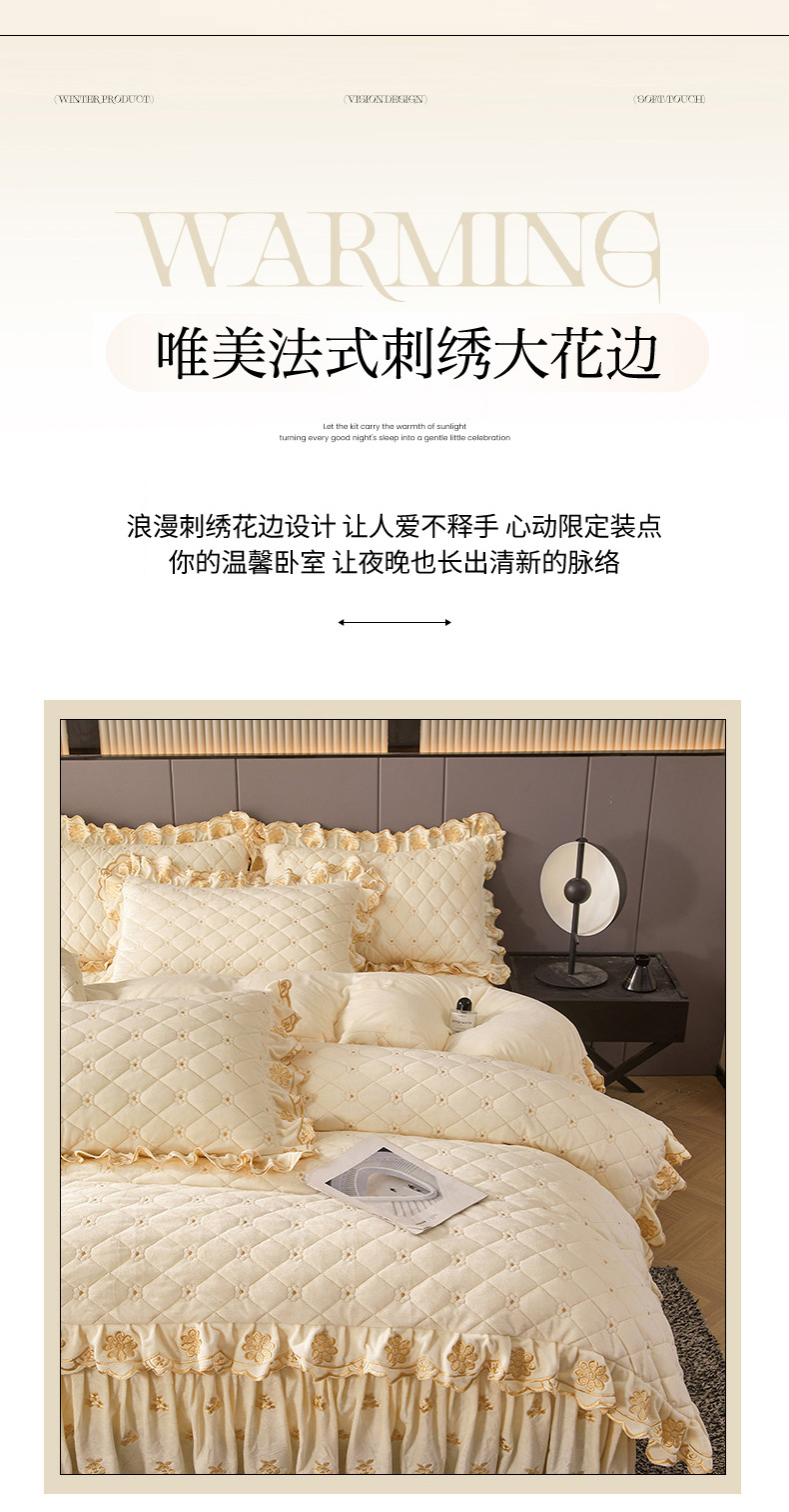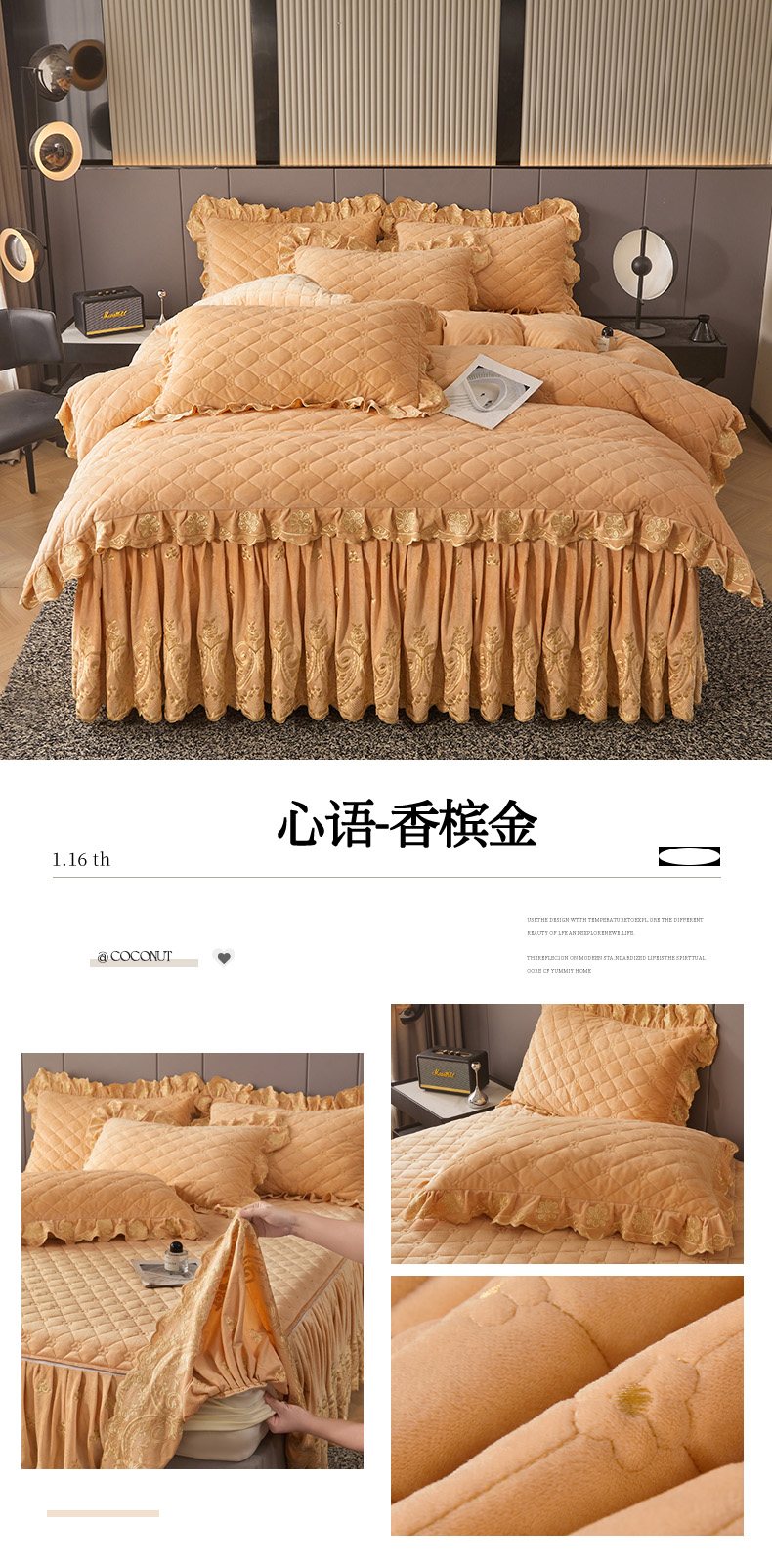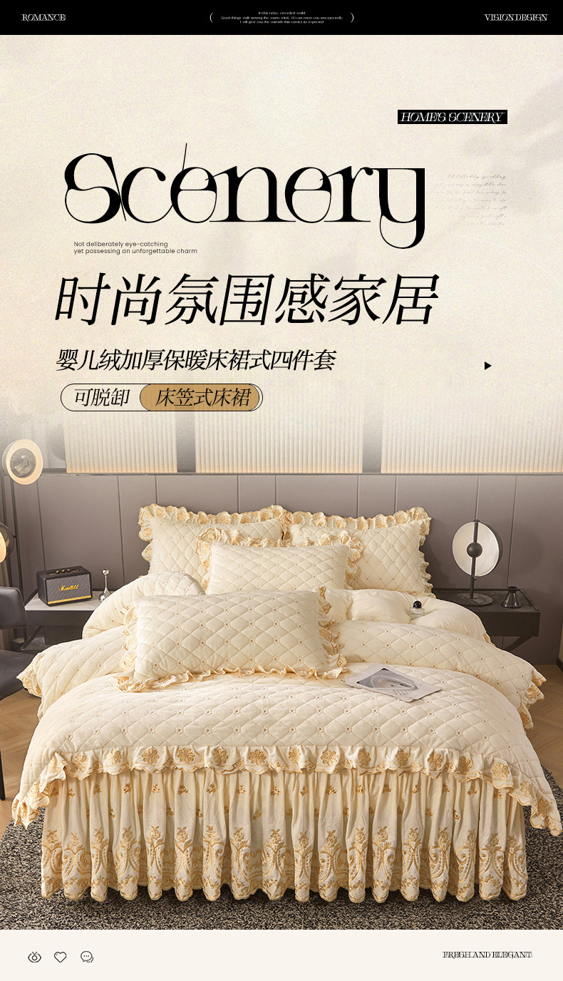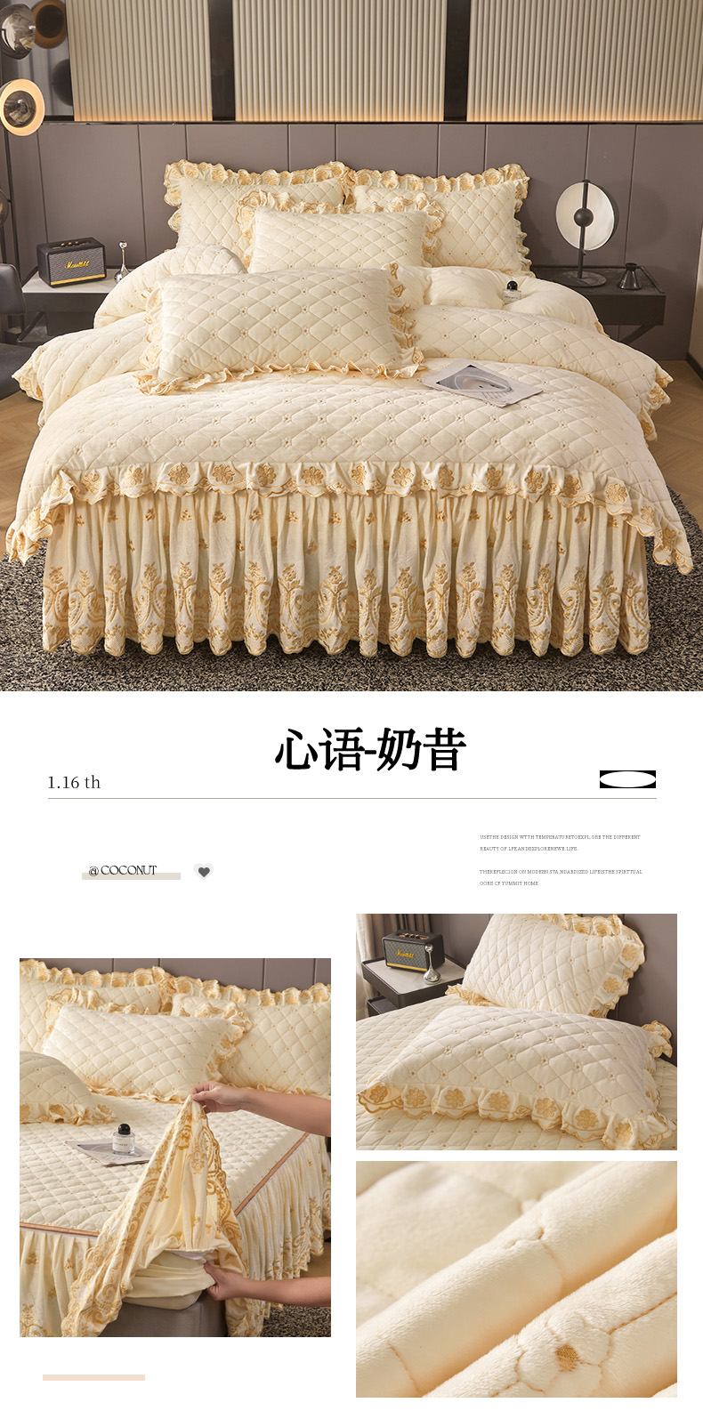 当前位置: 91家纺网 > 商品网购 > 床品套件 > 四件套 > 其它四件套 > 罗艺轩 2025新款婴儿绒加厚保暖床裙式四件套-心语 心语-奶昔
