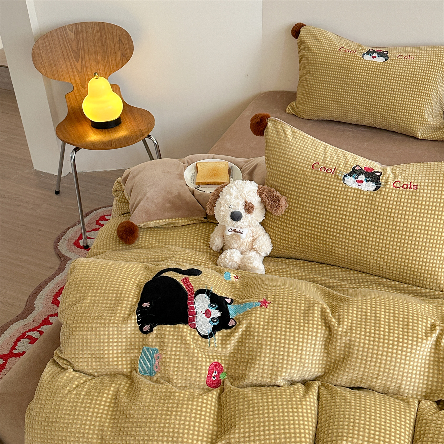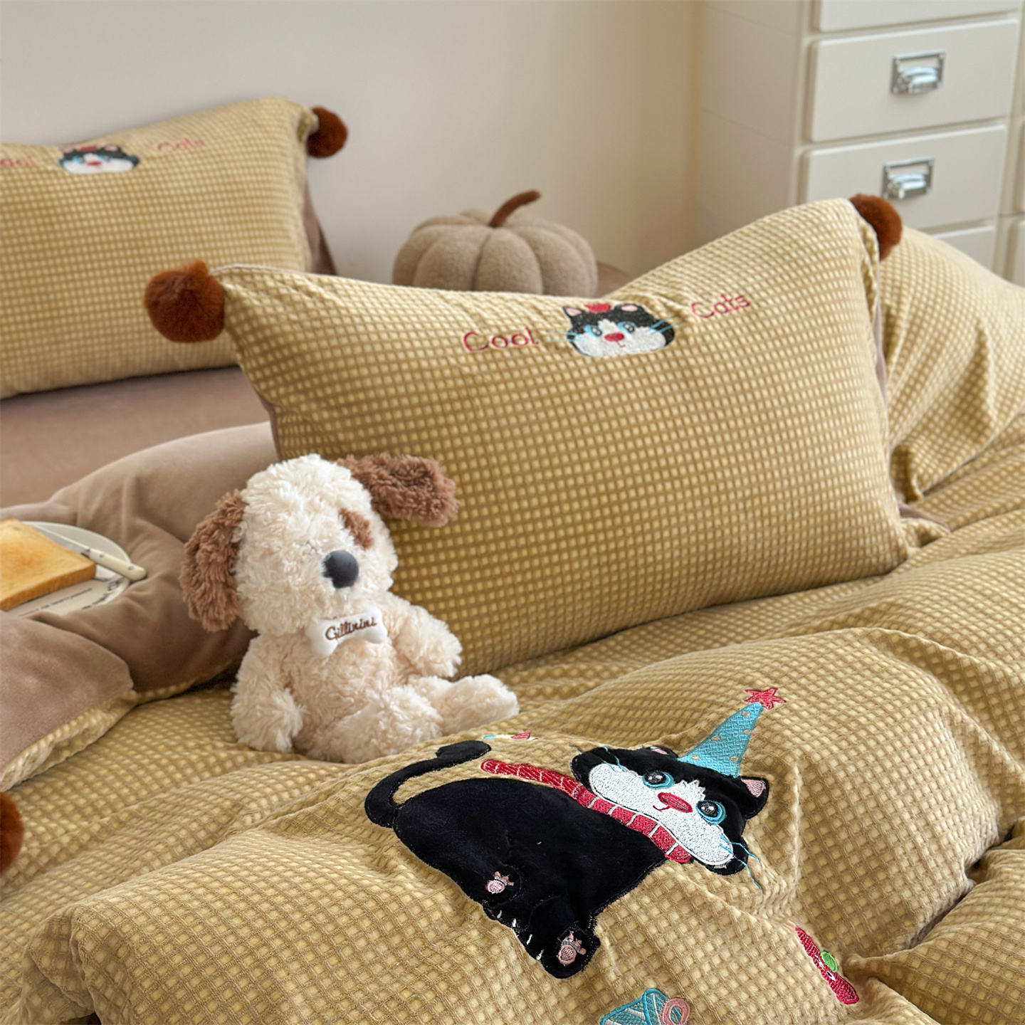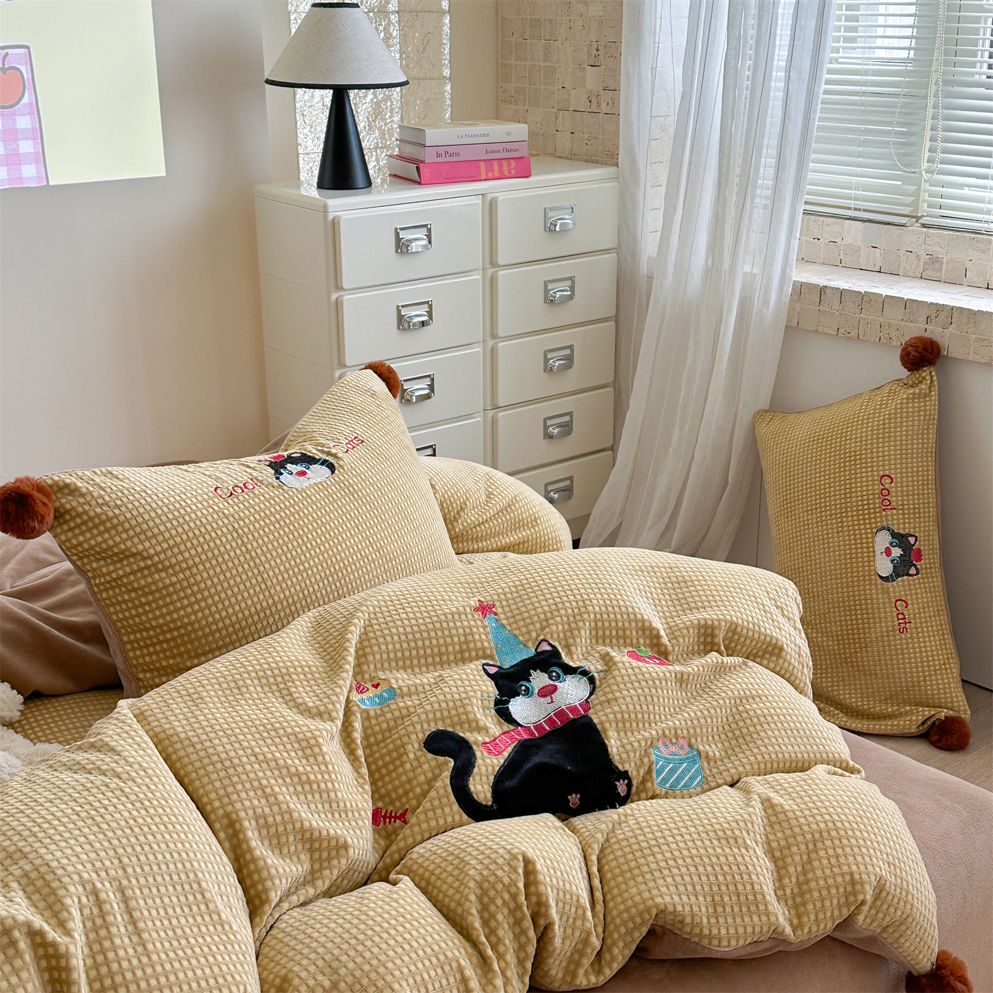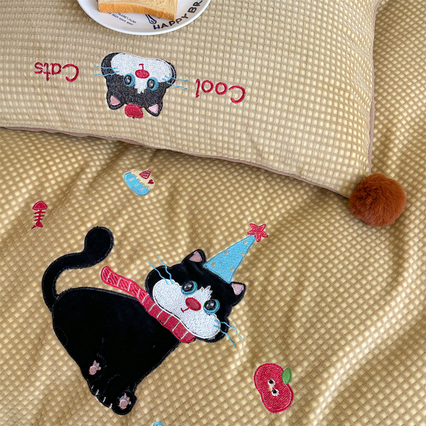柚子YOUTH 2025新款华夫格提花绒刺绣四件套 黑猫的礼物