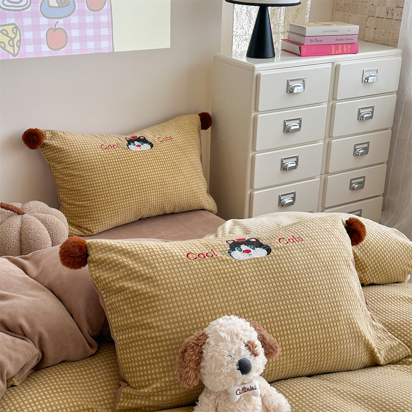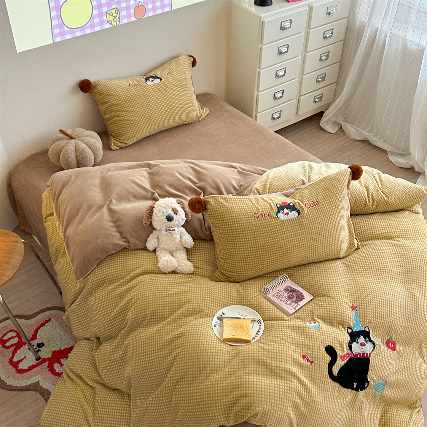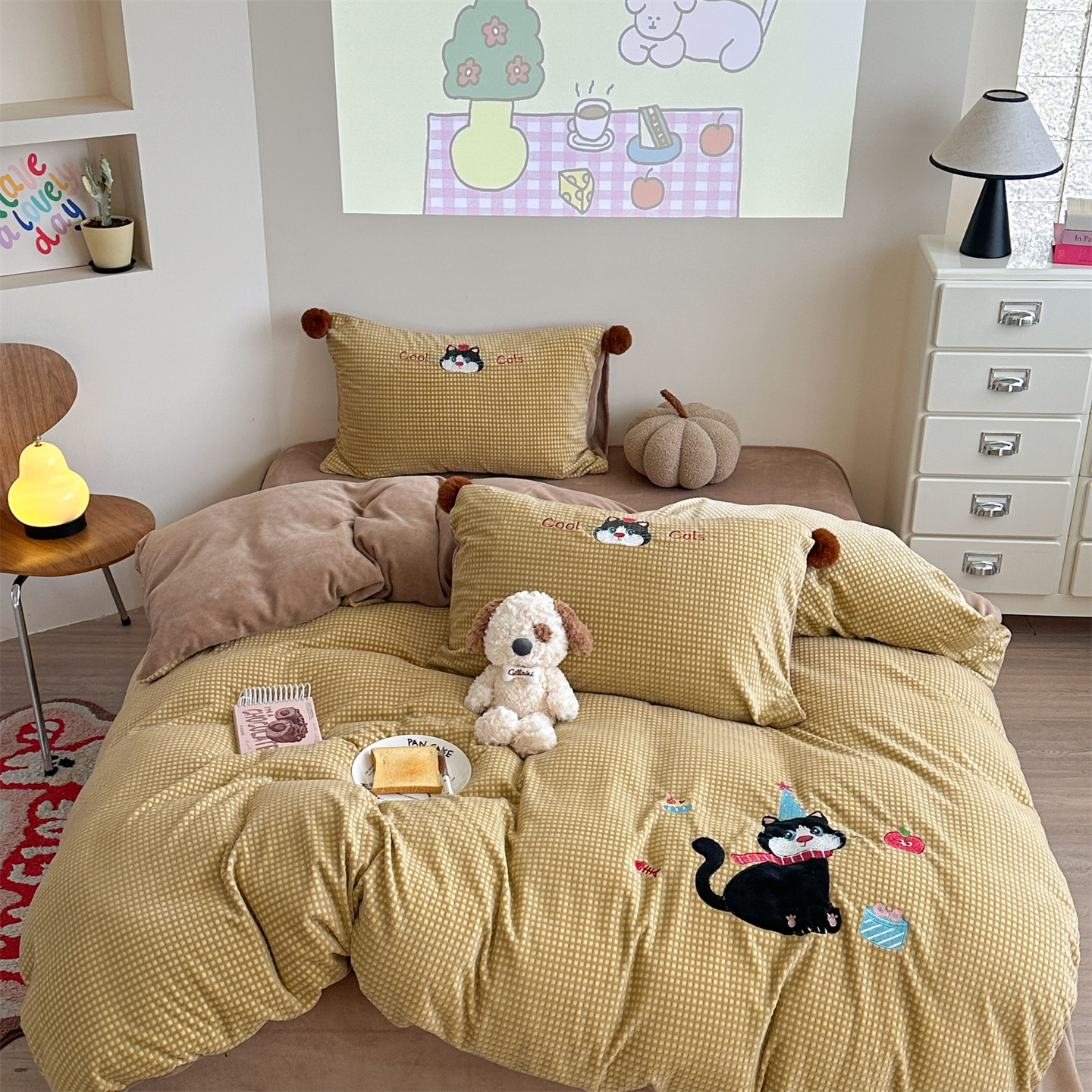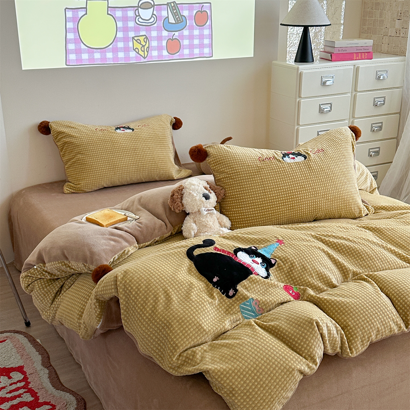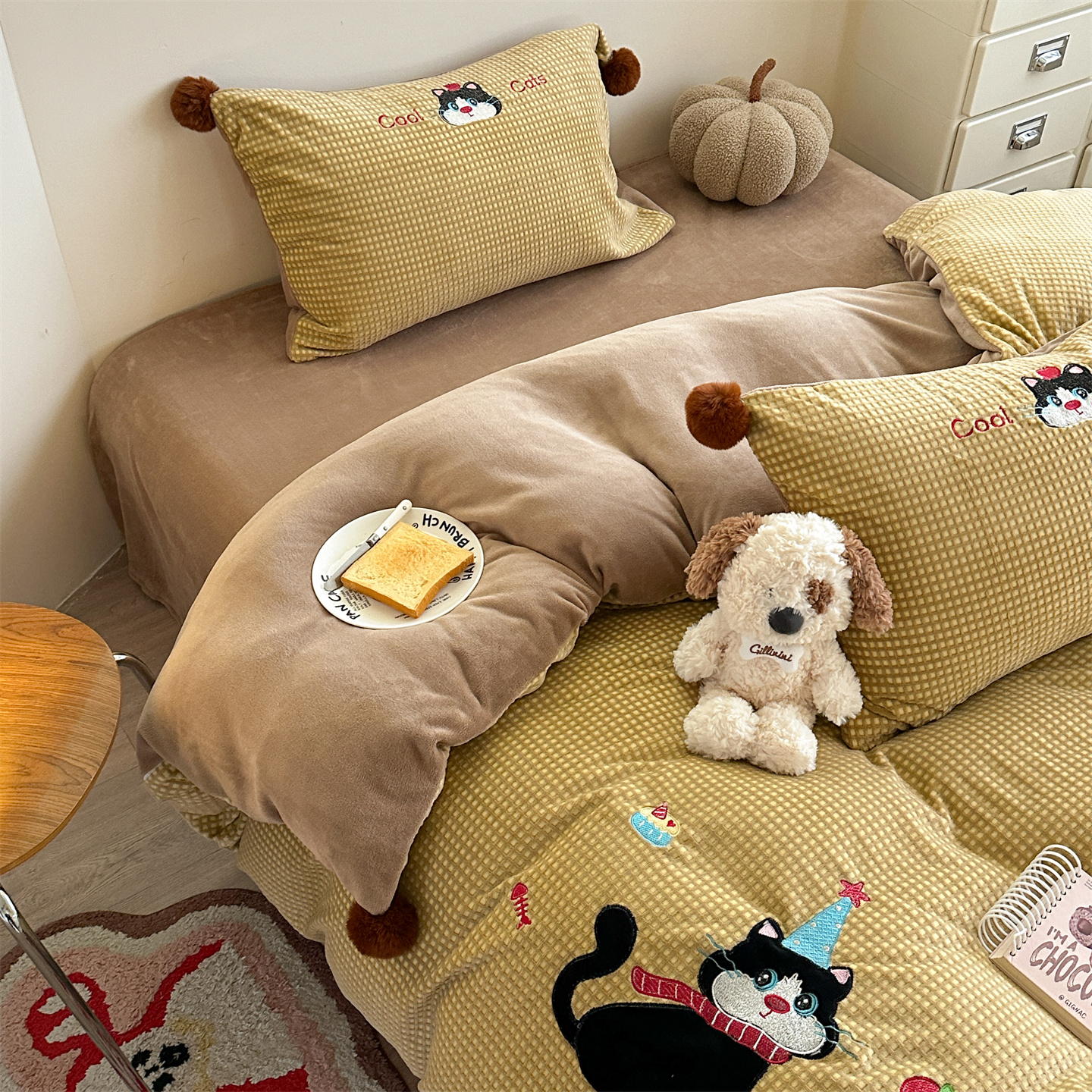 (总)柚子YOUTH 2025新款加厚牛奶绒卡通毛巾绣四件套-印加绣送同款毛毯,蛋糕小狗,公主猫,头套猫,兔兔花园,小伙伴,雪纳瑞