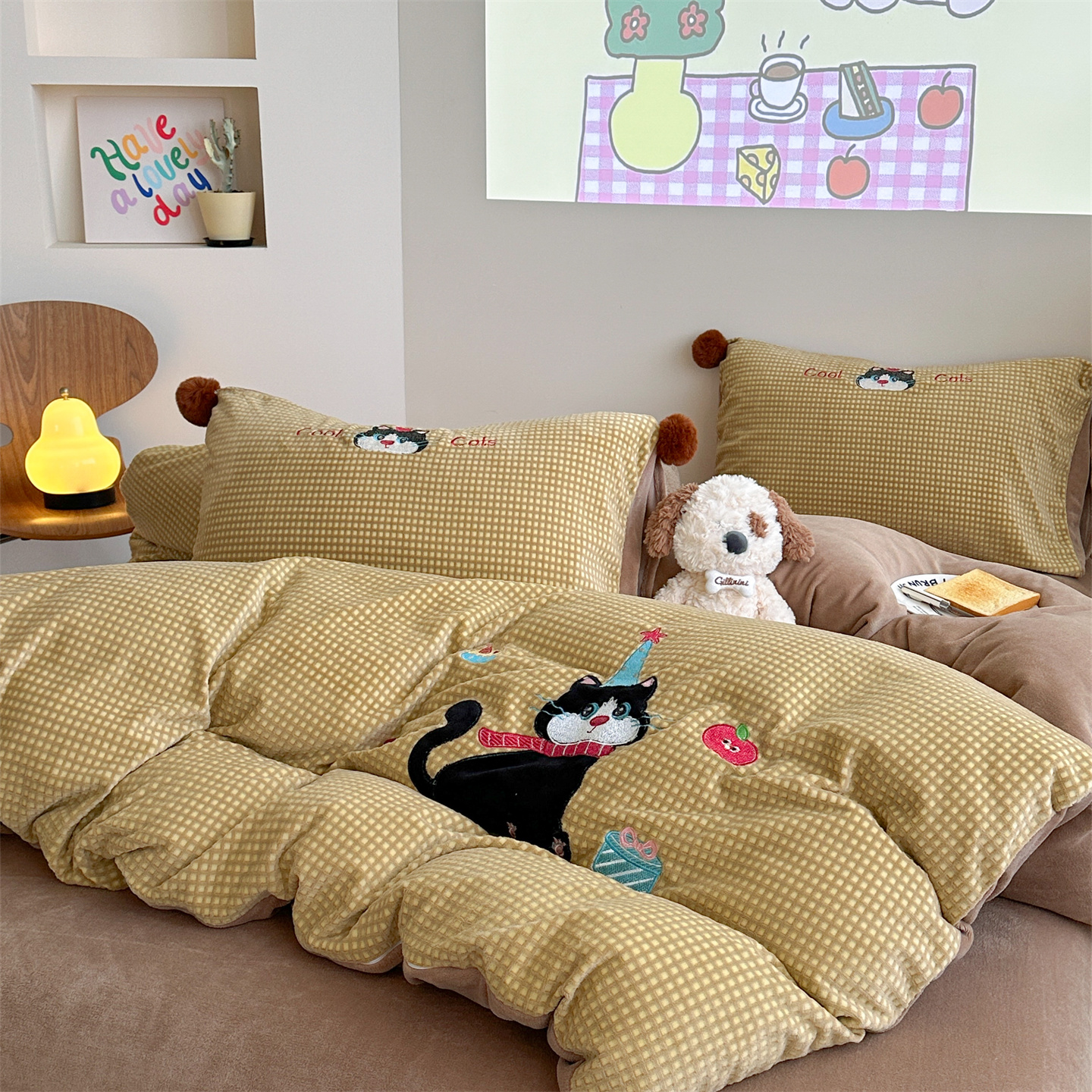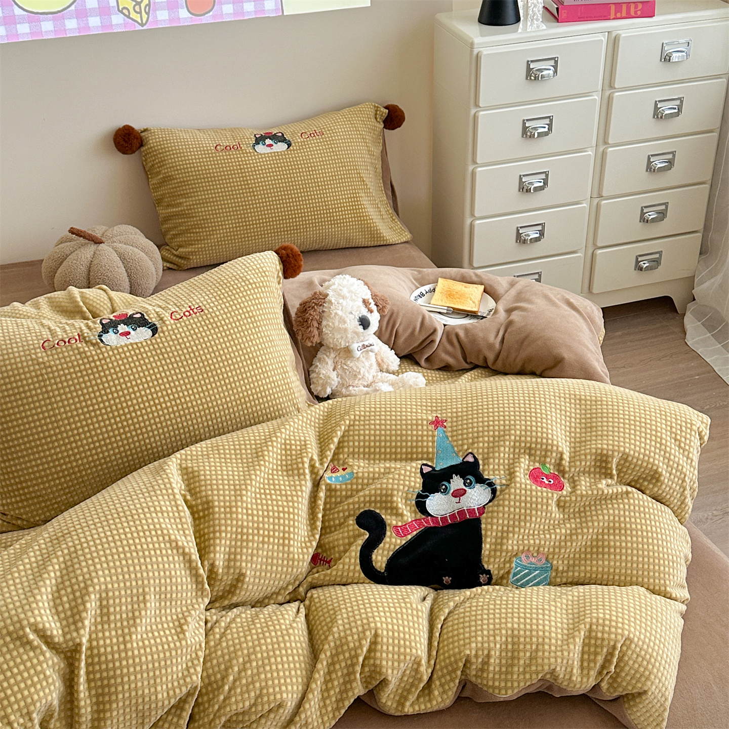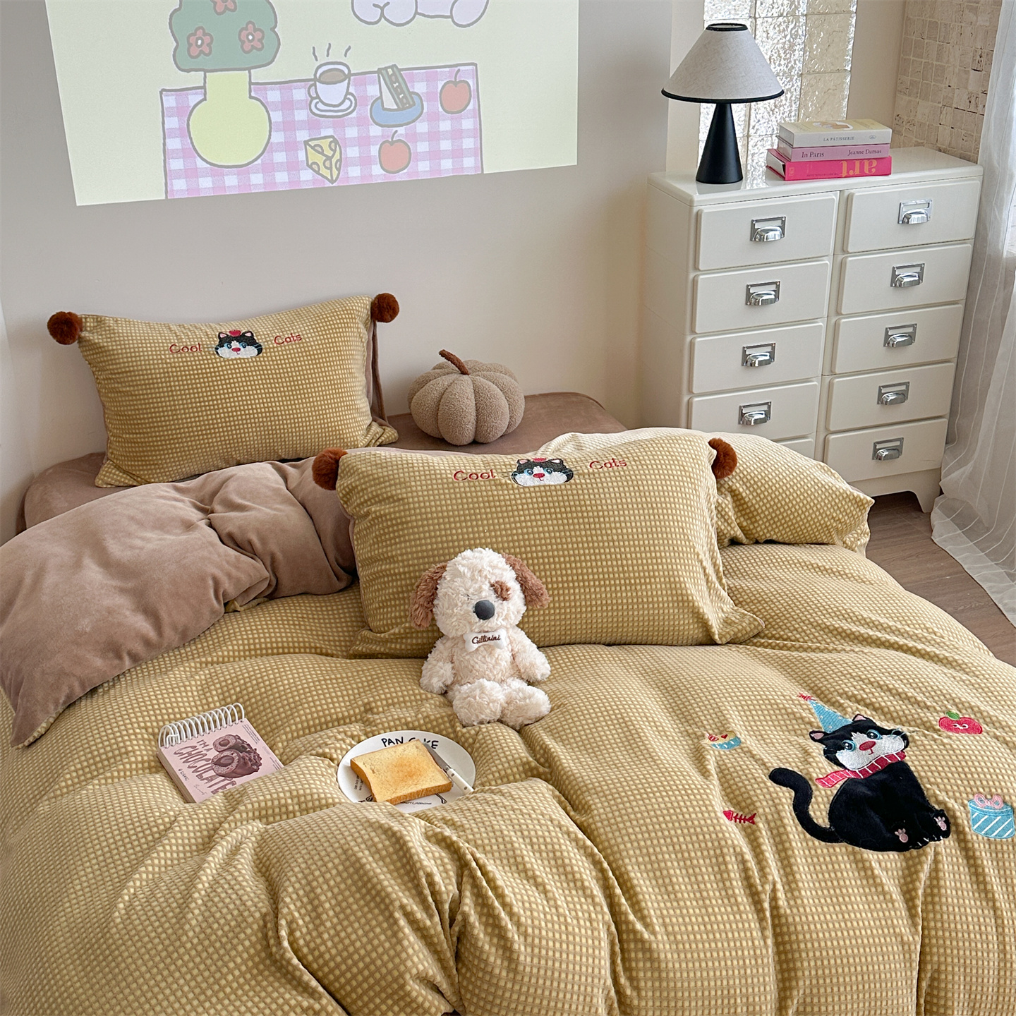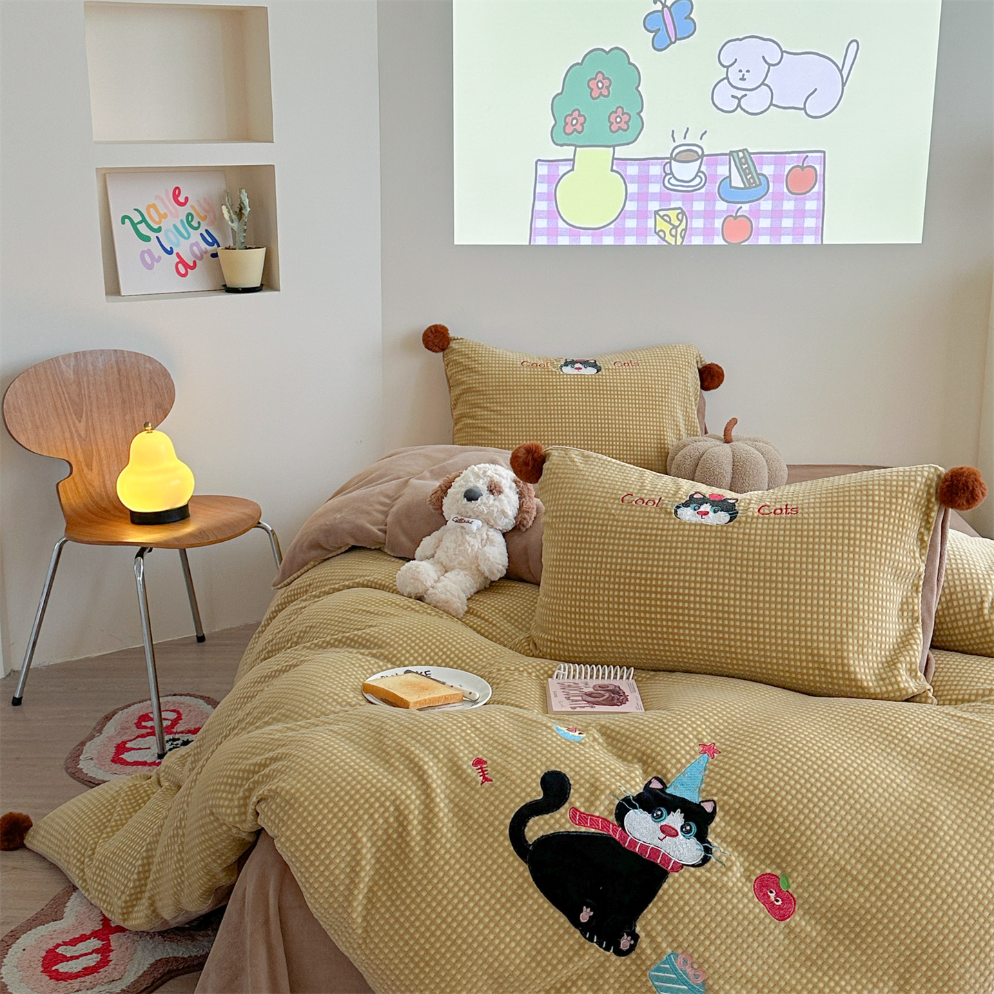 商品名称:柚子YOUTH 2025新款华夫格提花绒刺绣四件套 黑猫的礼物