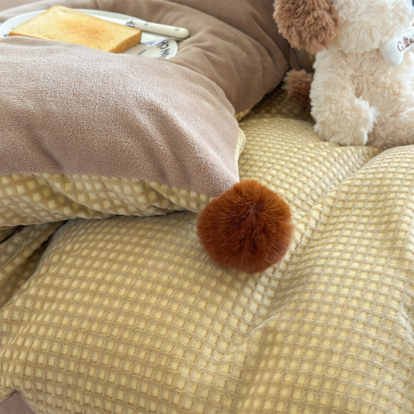 (总)柚子YOUTH 2025新款全棉双层纱华夫格提花暖绒四件套,馥郁花香,咖豹纹,兰格蜡笔画,玫瑰兔兔,拼图爱丽丝,ins咖格