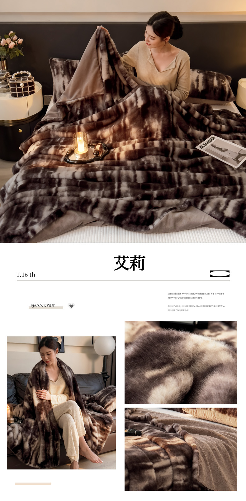 (总)九花鹿 2025新款丹麦皮草绒水貂绒盖毯毛毯毯子,玛丽娜-拿铁棕,艾莉,巴洛克,玛丽娜-气质灰,佩兹利,组合图