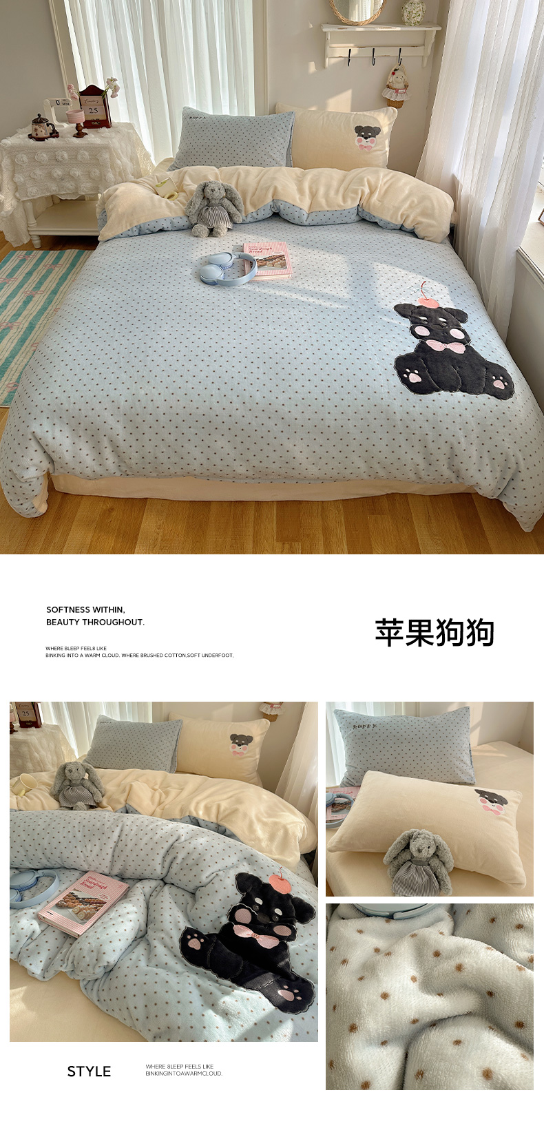 (总)韩都家居 2025新款高克重萌系牛奶绒毛巾绣四件套,可爱猫咪,帕帕狗,毛毛狗,欢乐仔仔