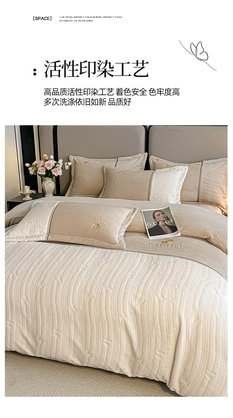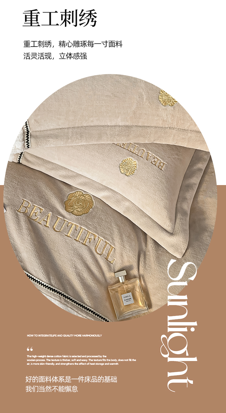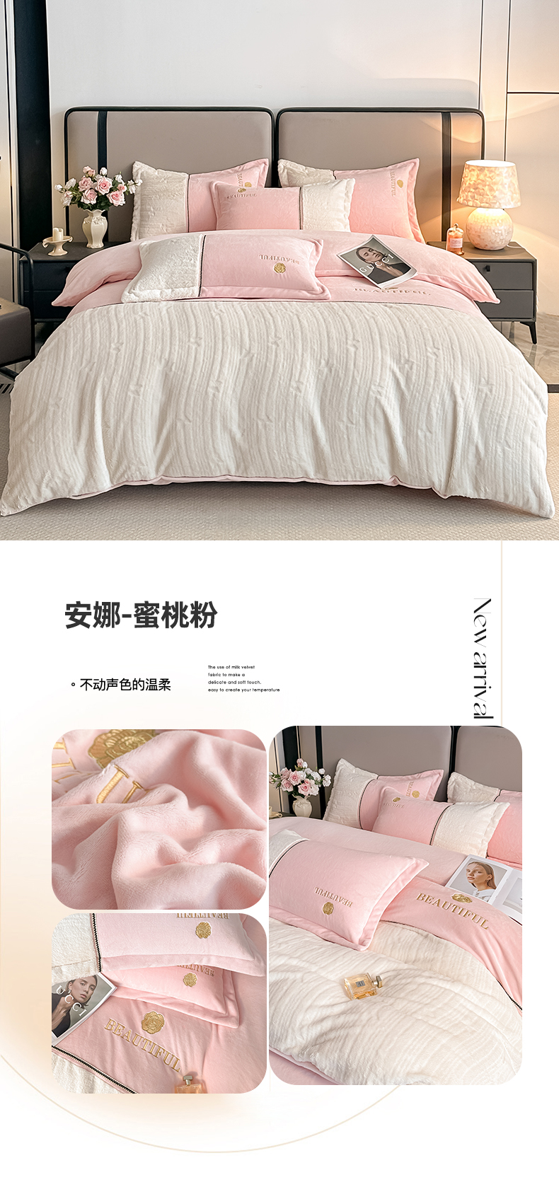 总金窝窝家纺2024重工刺绣280克A类婴儿牛奶绒刺绣四件套系列-美好生活,美好生活—粉