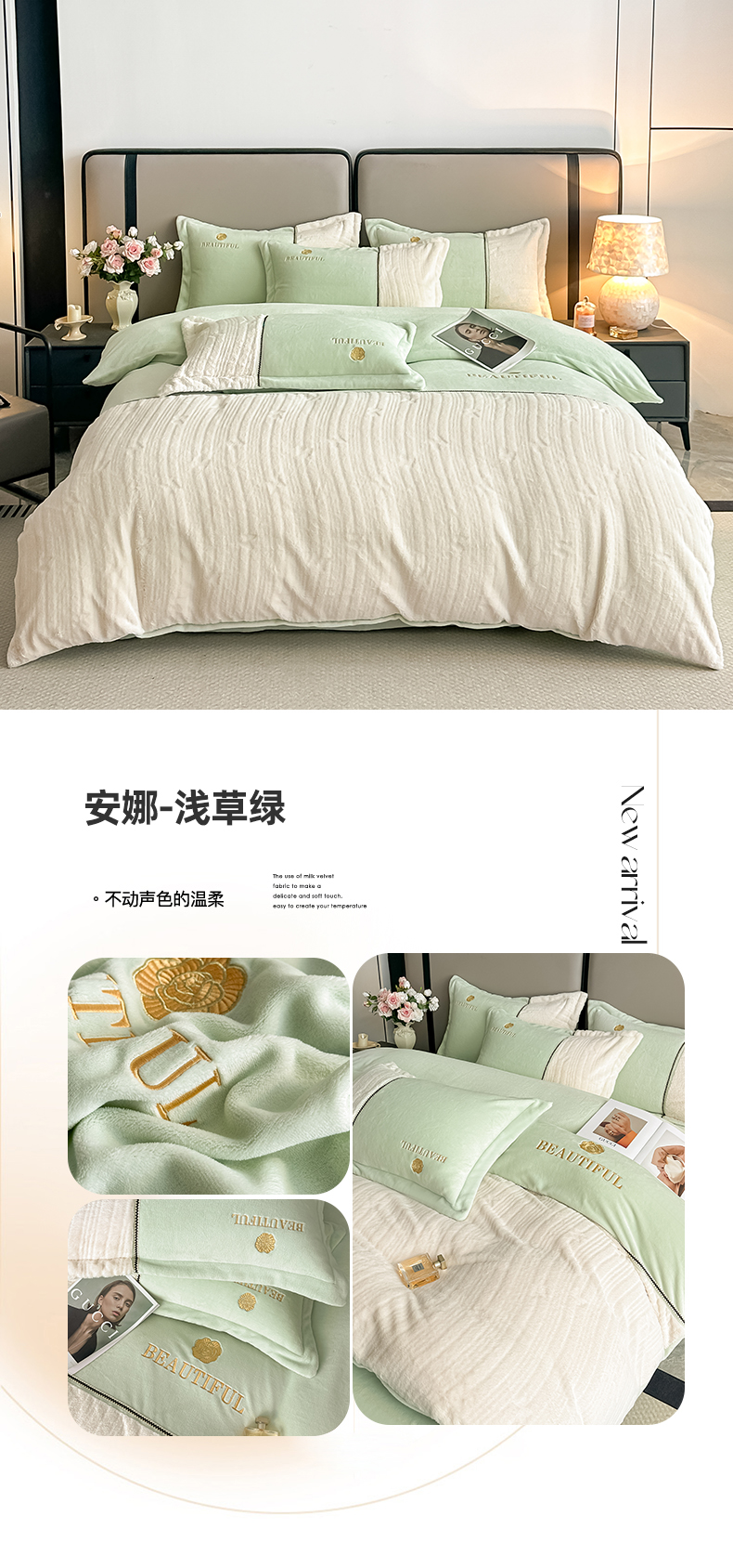 (总)金窝窝家纺 2024新款婴儿级牛奶绒拼接刺绣烂花雕花绒四件套--朱丽叶系列,朱丽叶-粉,朱丽叶-灰,朱丽叶-咖,朱丽叶-蓝,朱丽叶-绿