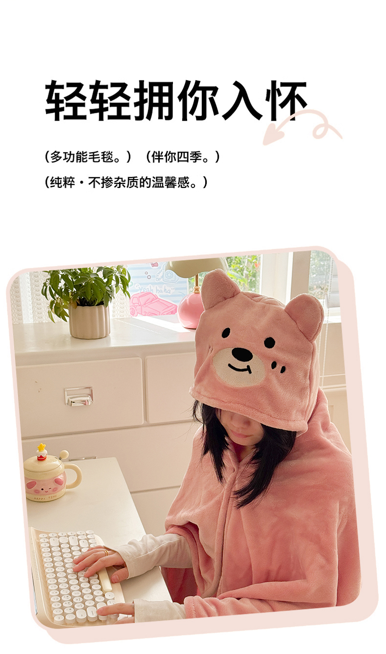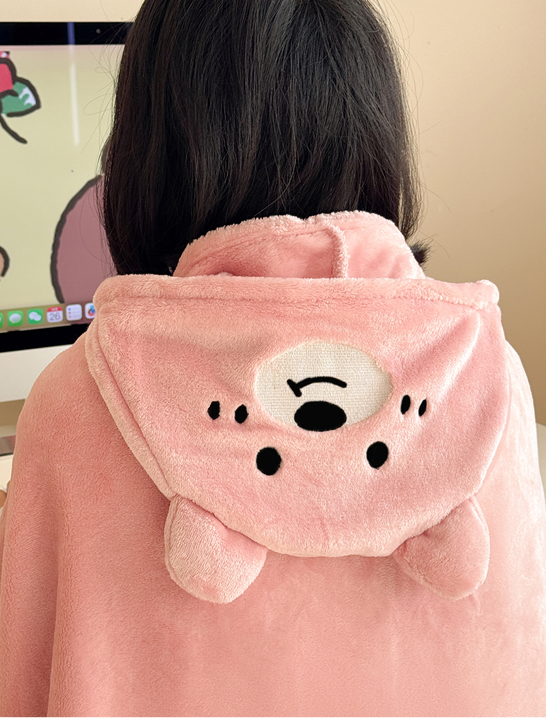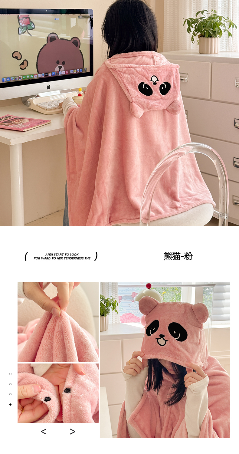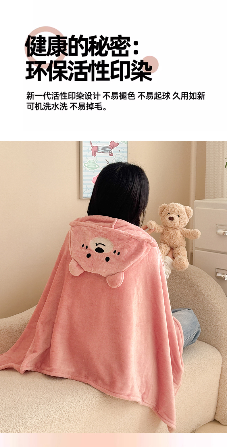 简宜家居(朝初家纺) 2025新款带帽披肩毯子熊猫和熊午休毯带帽毯 可爱熊-粉