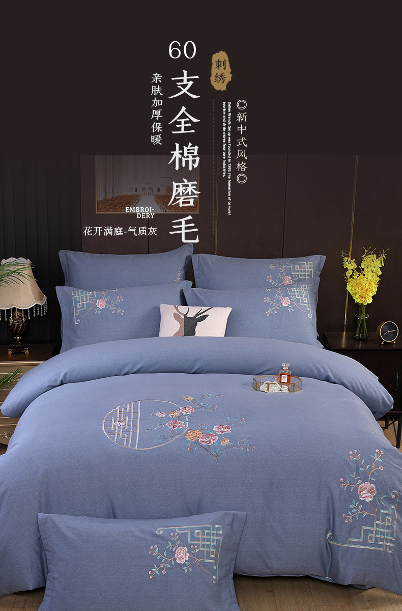 浩情国际婚庆供货中心 2026新款秋冬60S高端全棉刺绣磨毛系列 花开满庭-银灰