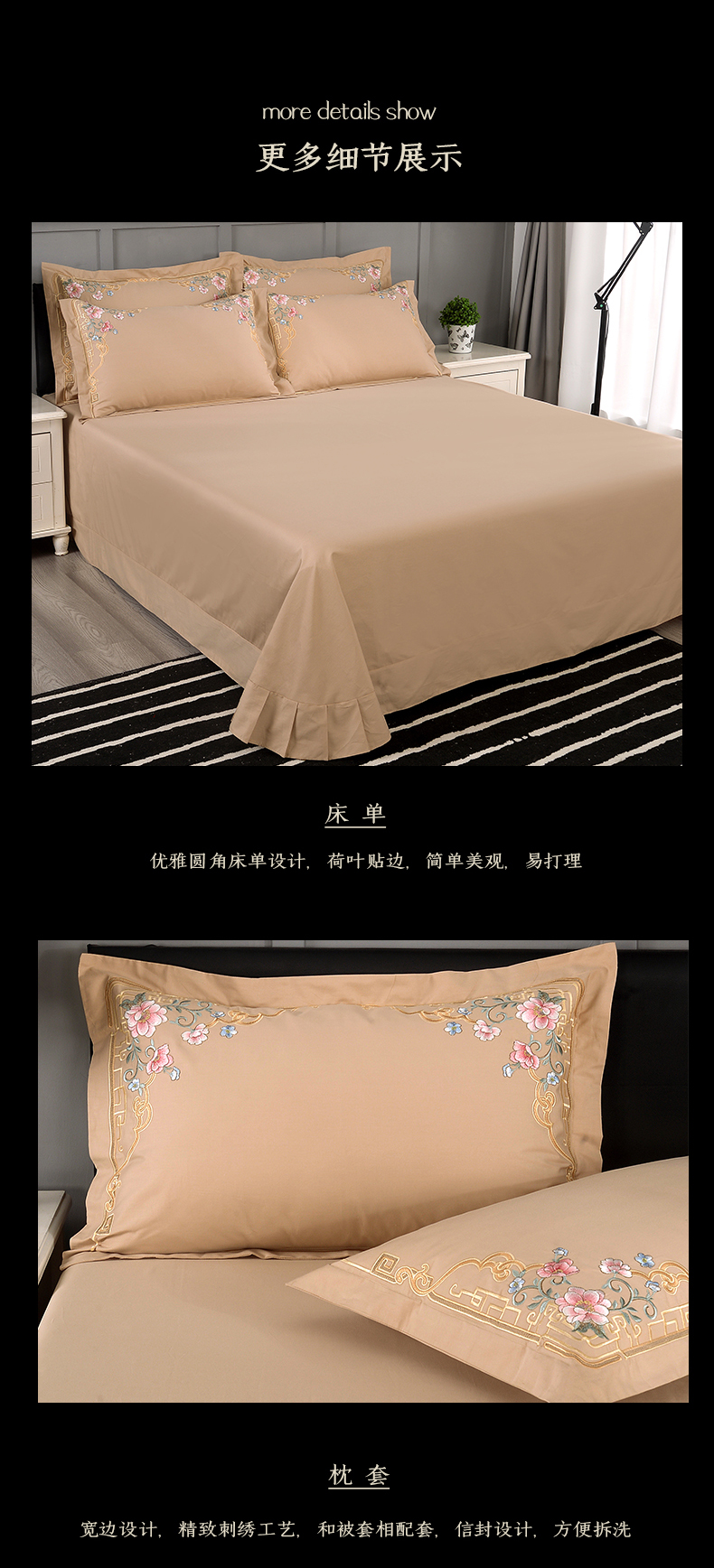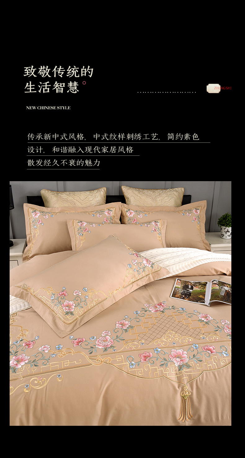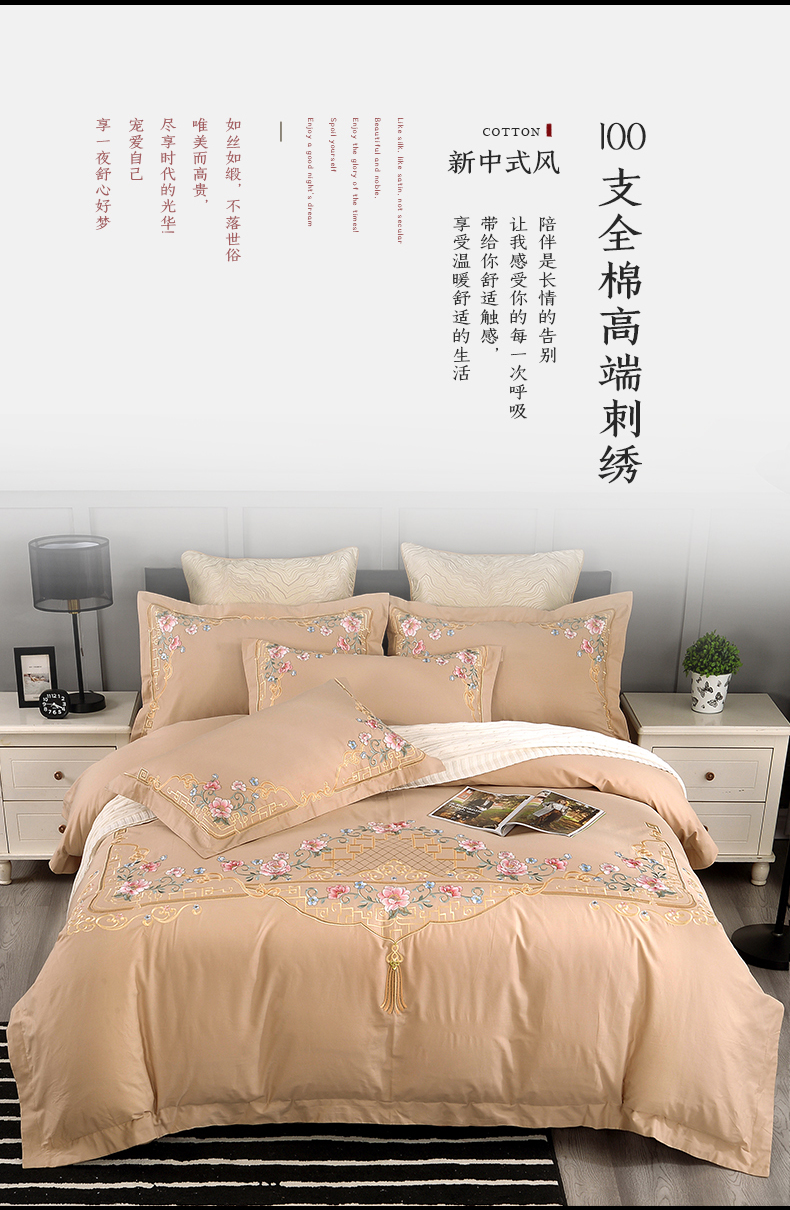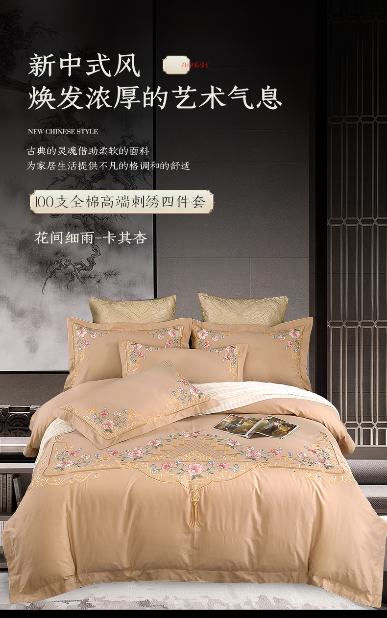 商品名称:浩情国际婚庆供货中心 2026新款新中式风100支全棉高端刺绣四件套 花间细雨-卡其杏
