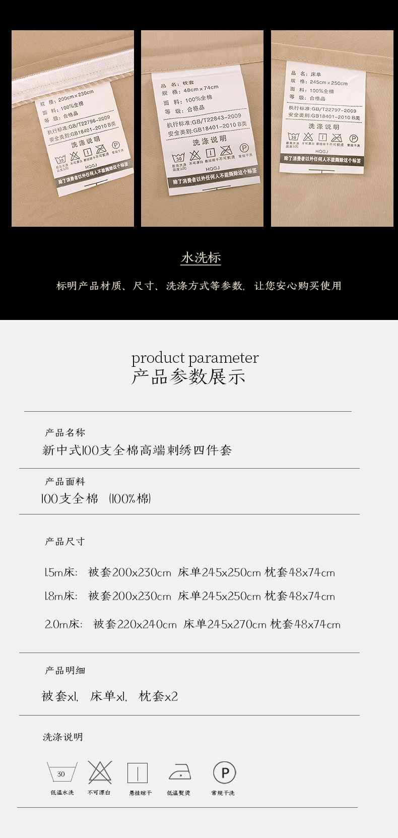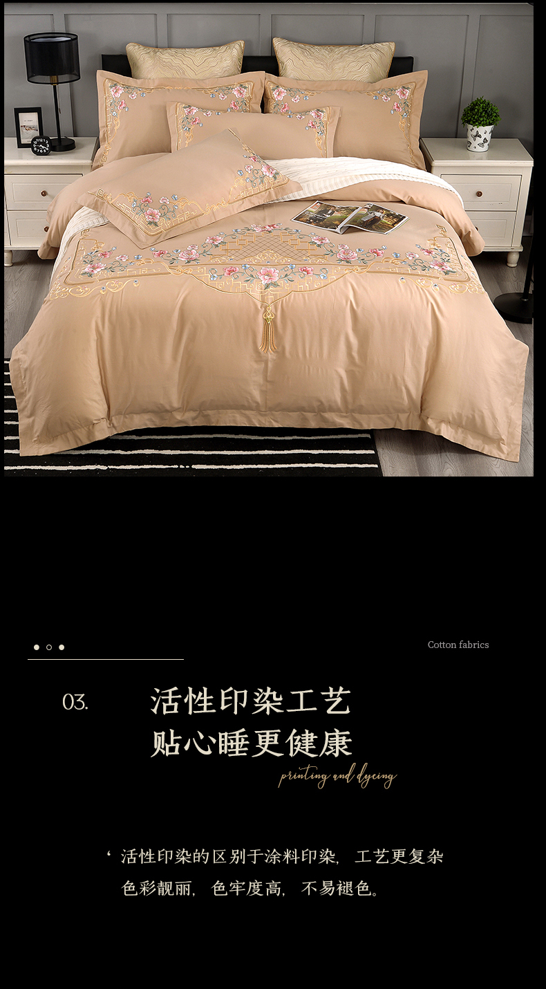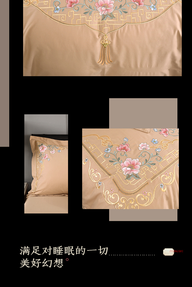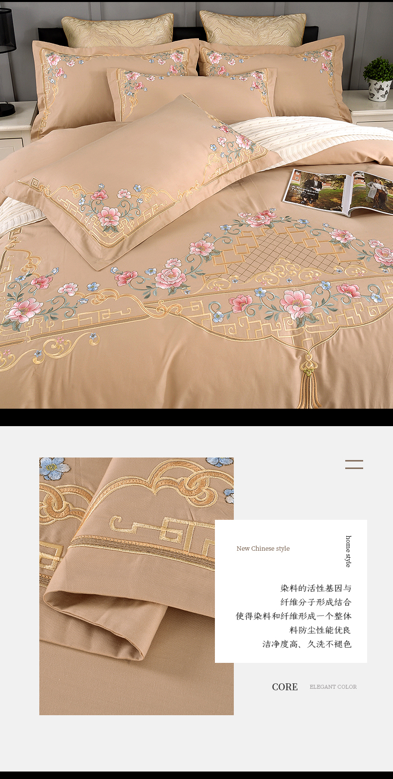 商品名称:浩情国际婚庆供货中心 2026新款新中式风100支全棉高端刺绣四件套 花间细雨-卡其杏