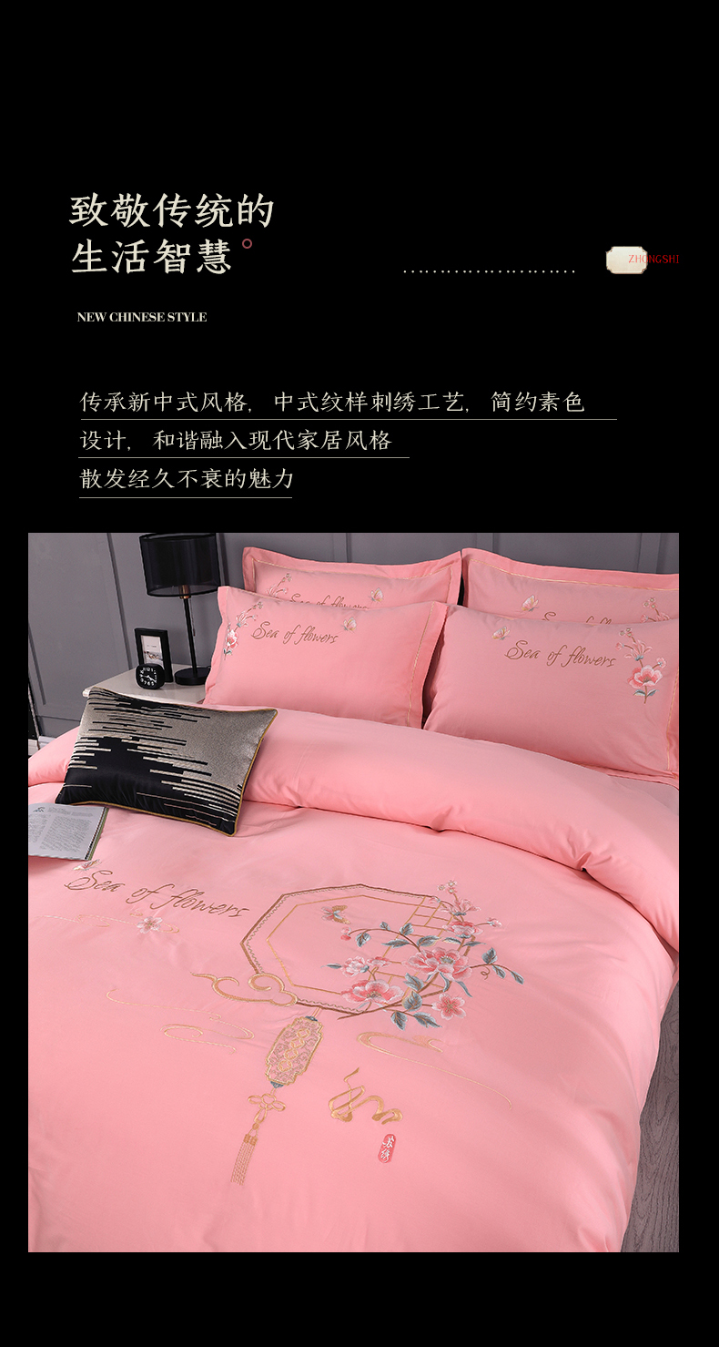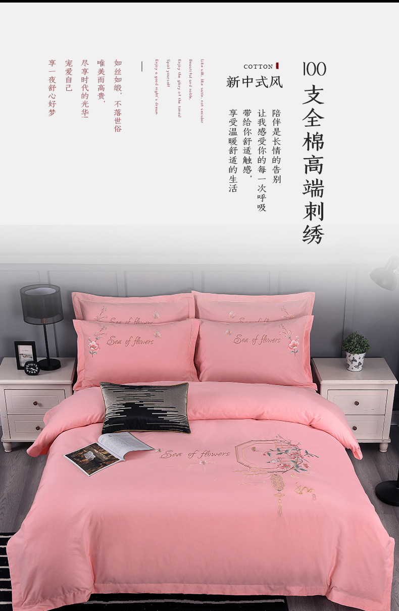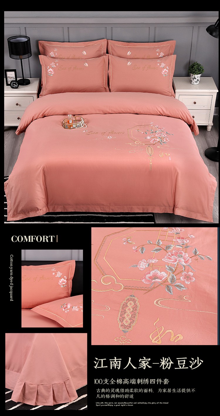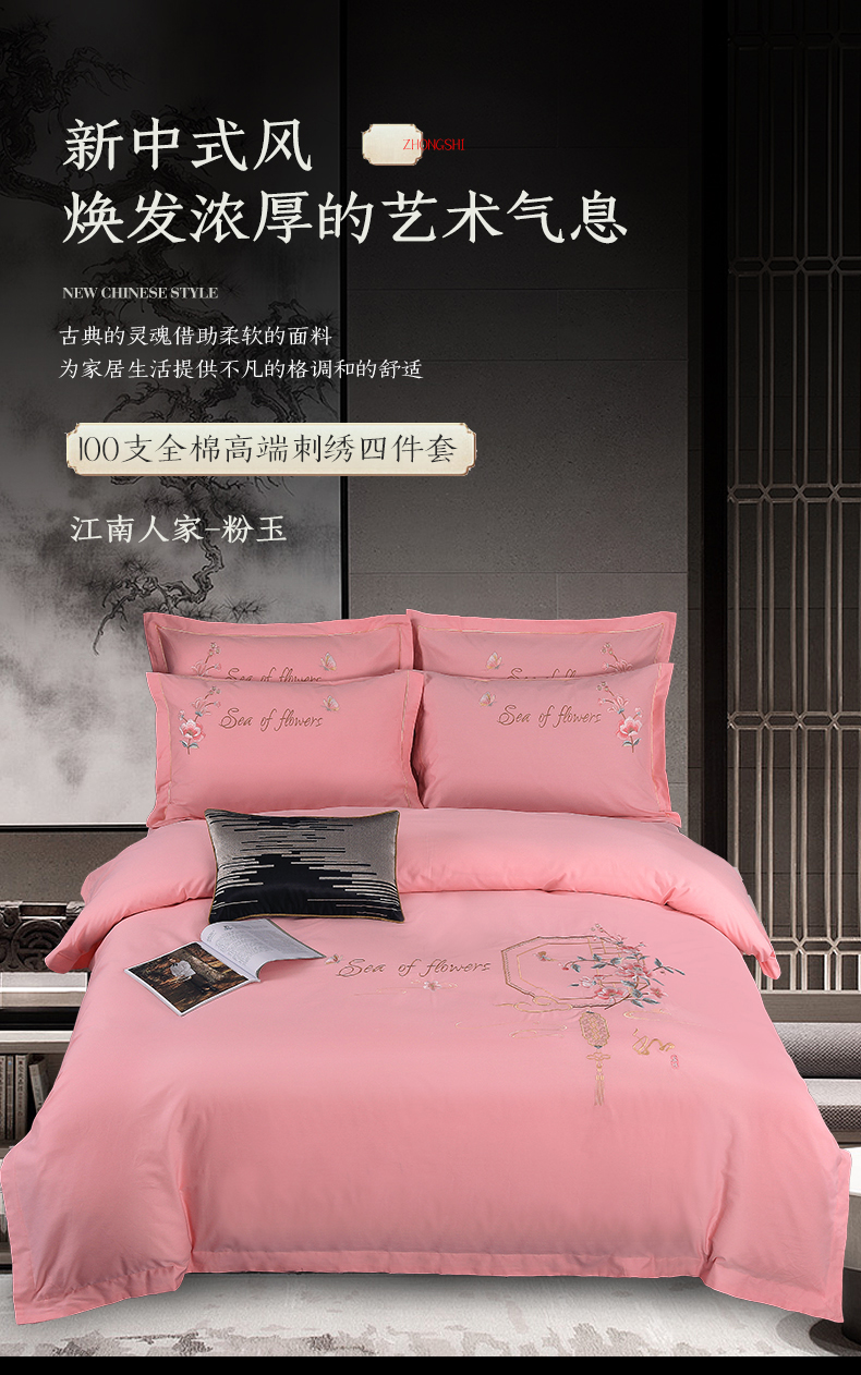 浩情国际婚庆供货中心 2026新款新中式风100支全棉高端刺绣四件套 江南人家-粉玉