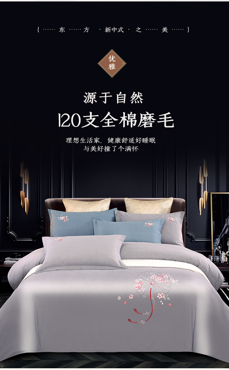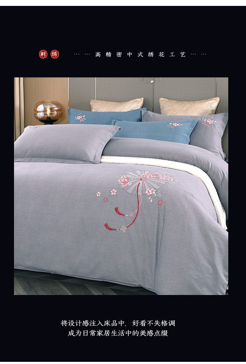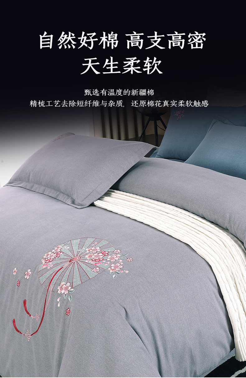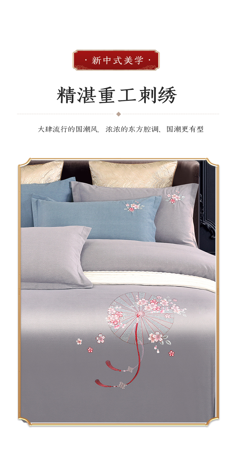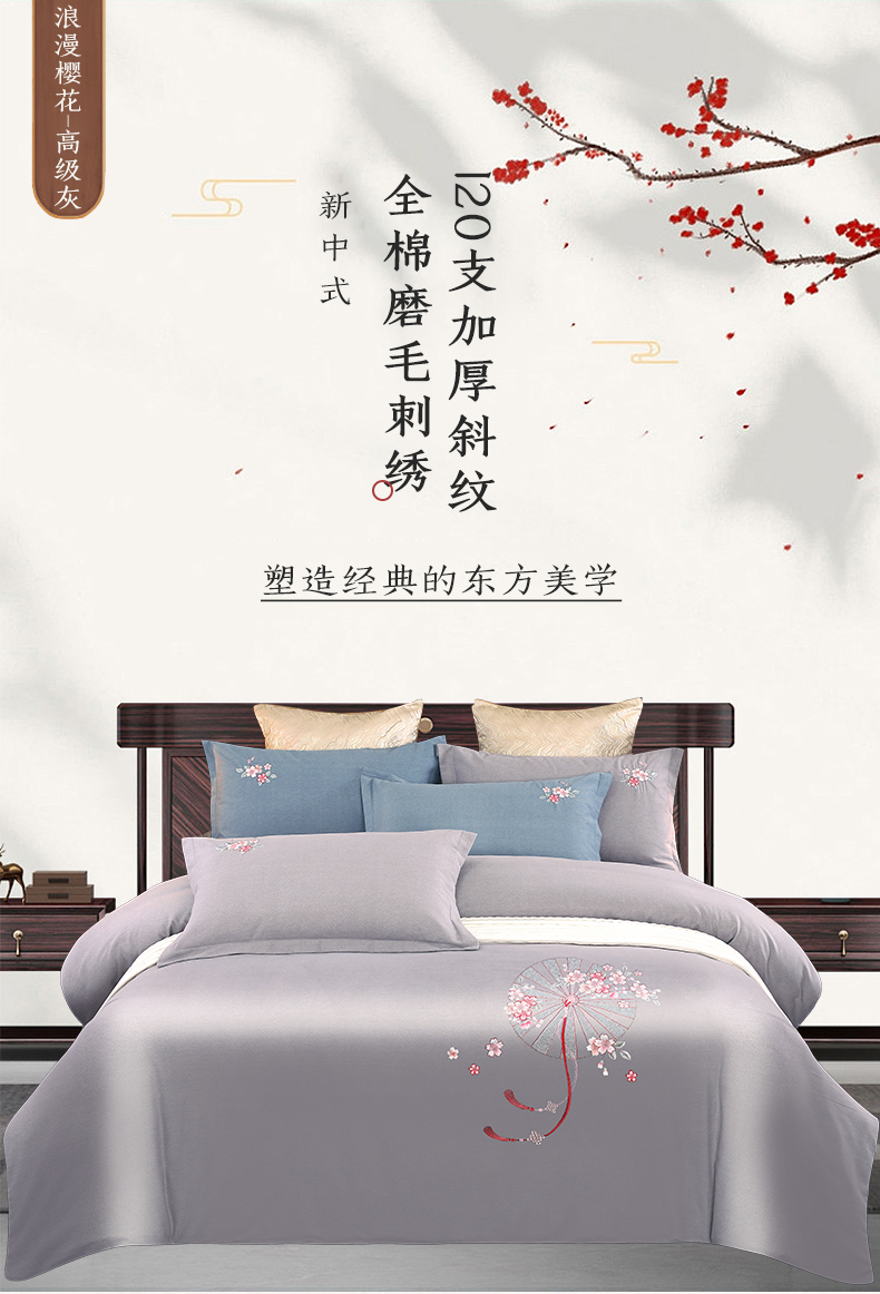 浩情国际婚庆供货中心 2026四季新品120S全棉斜纹加厚磨毛高端刺绣四件套 浪漫樱花-高级灰