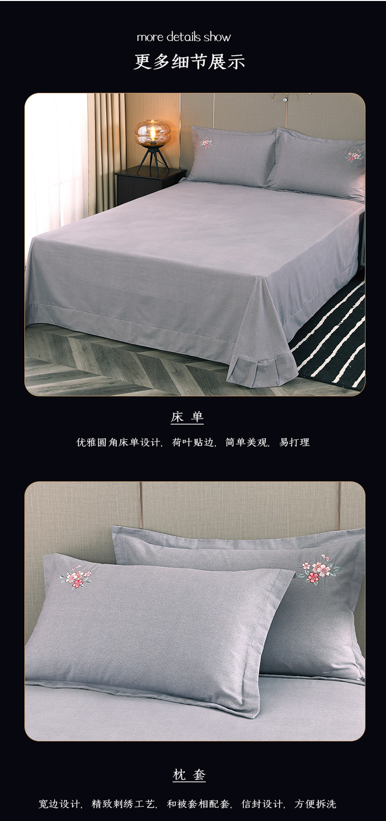 商品名称:浩情国际婚庆供货中心 2026四季新品120S全棉斜纹加厚磨毛高端刺绣四件套 浪漫樱花-高级灰