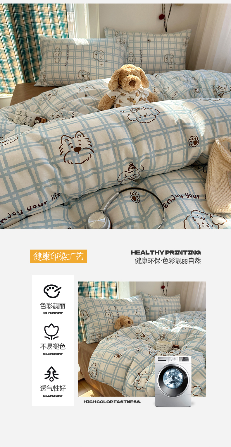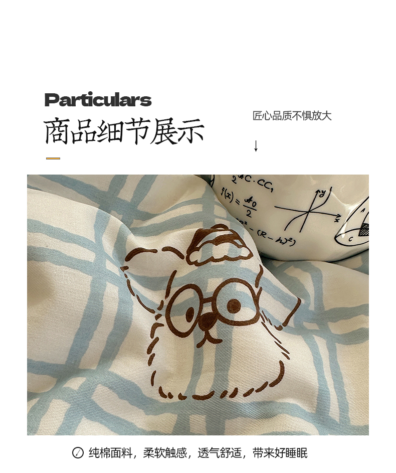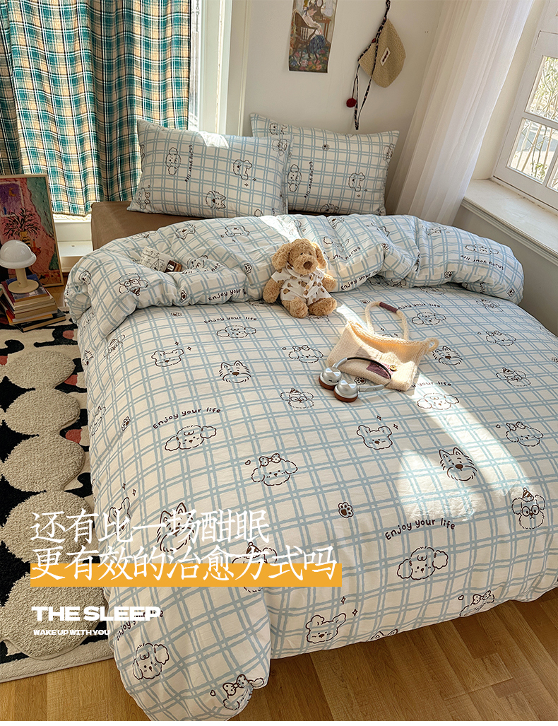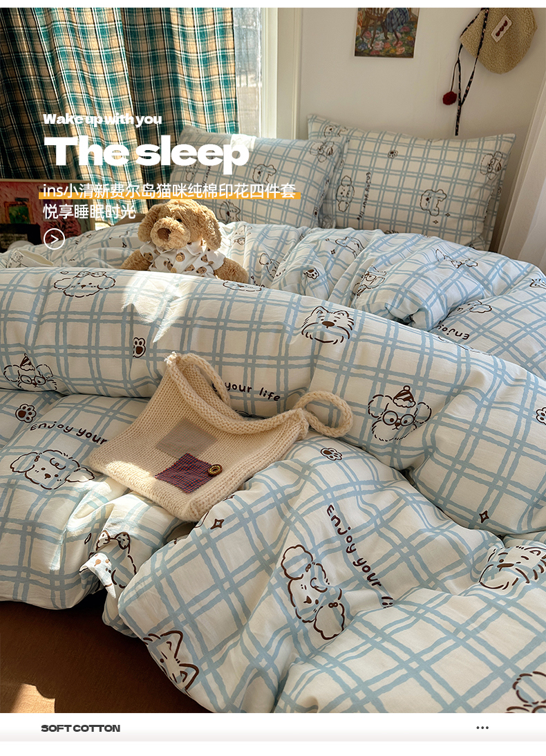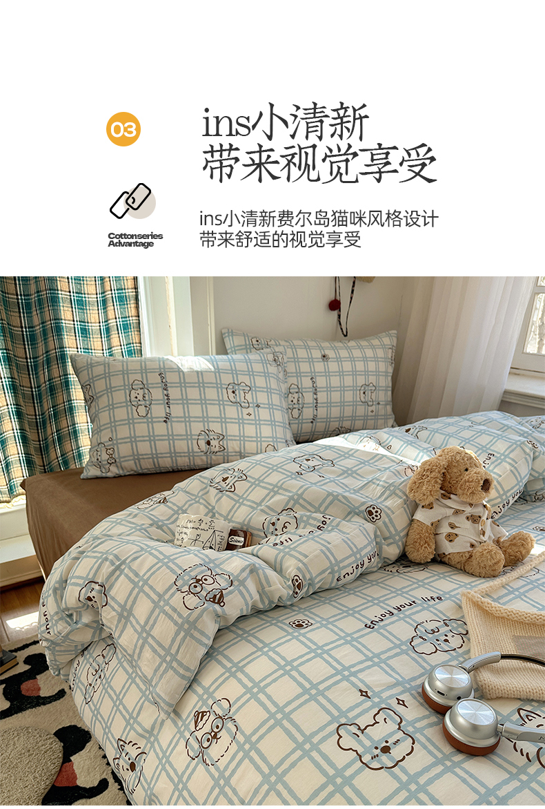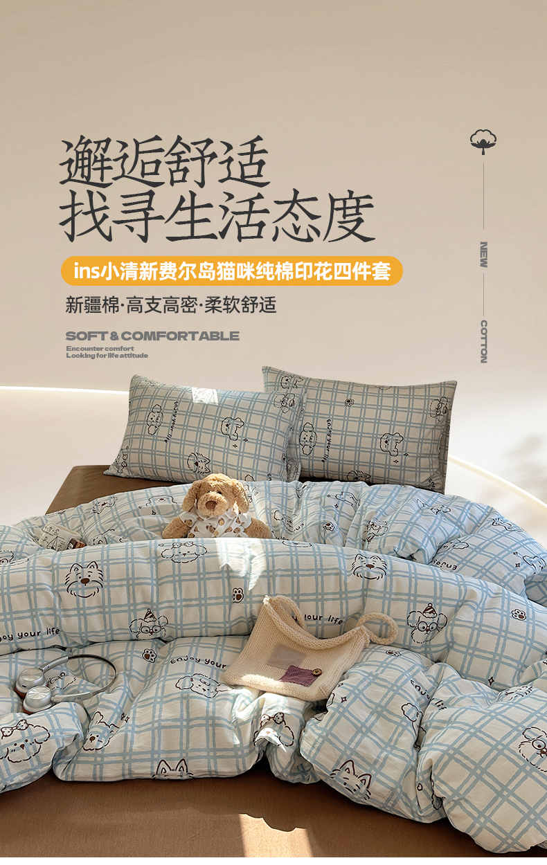 当前位置: 91家纺网 > 商品网购 > 床品套件 > 四件套 > 全棉普通四件套 > 桃子家居 2026新款ins小清新费尔岛猫咪全棉纯棉印花四件套 棉-蓝格线条狗