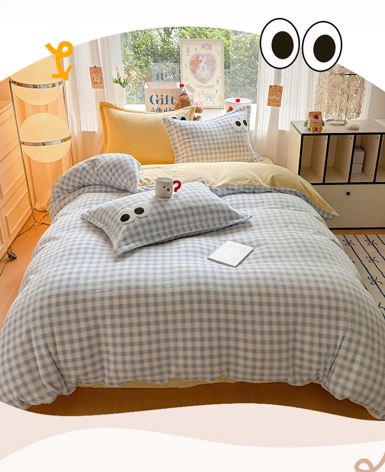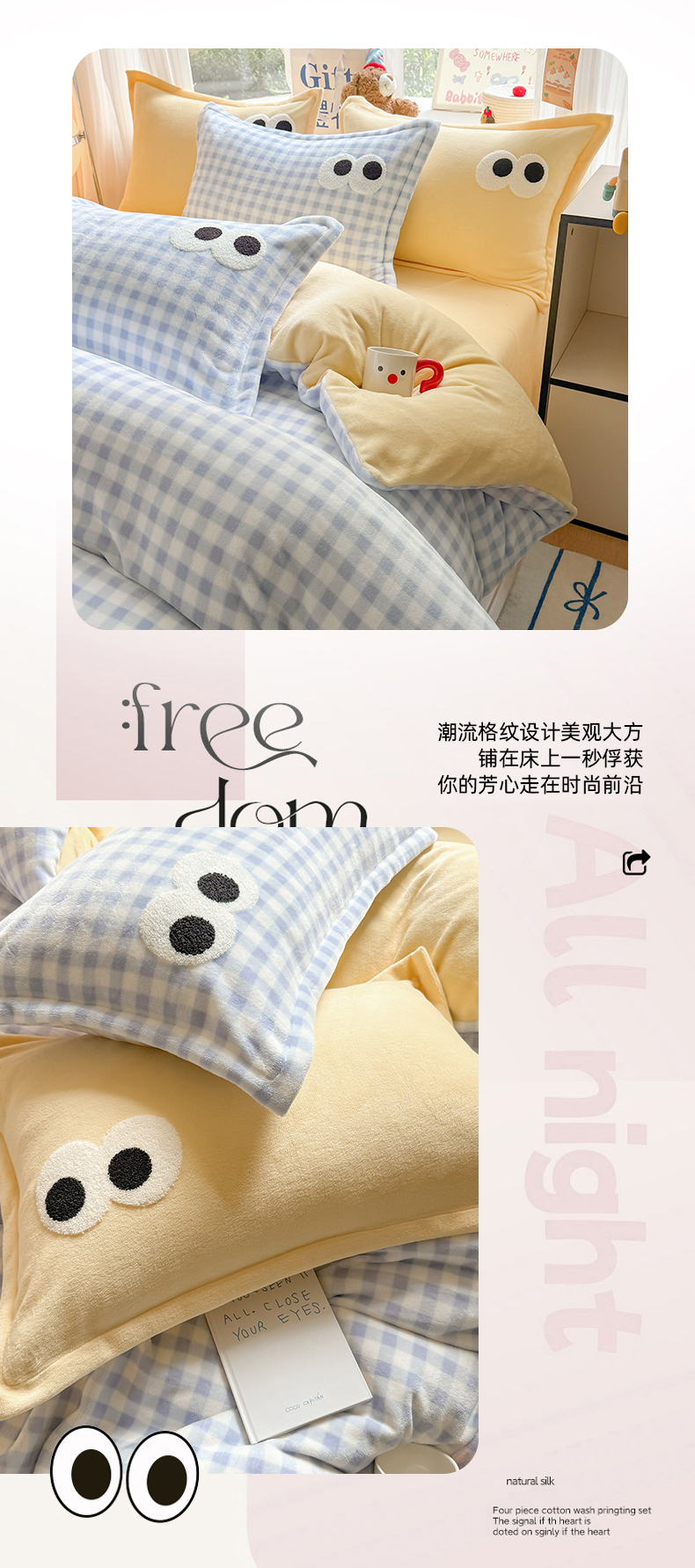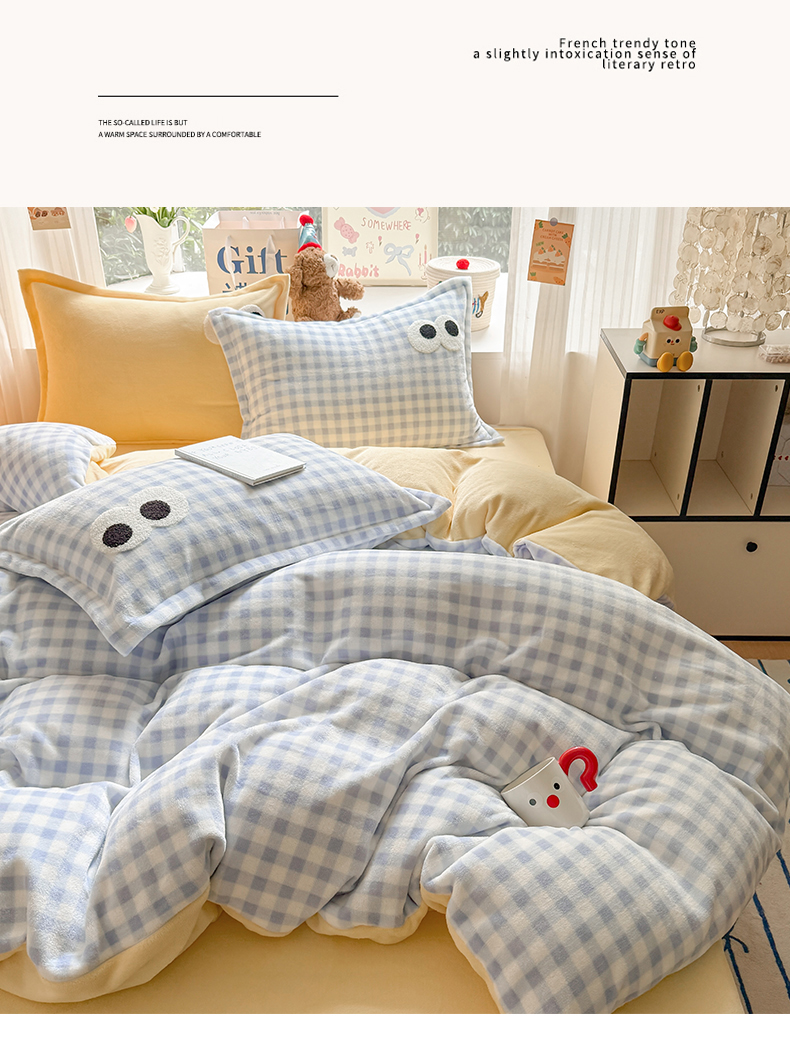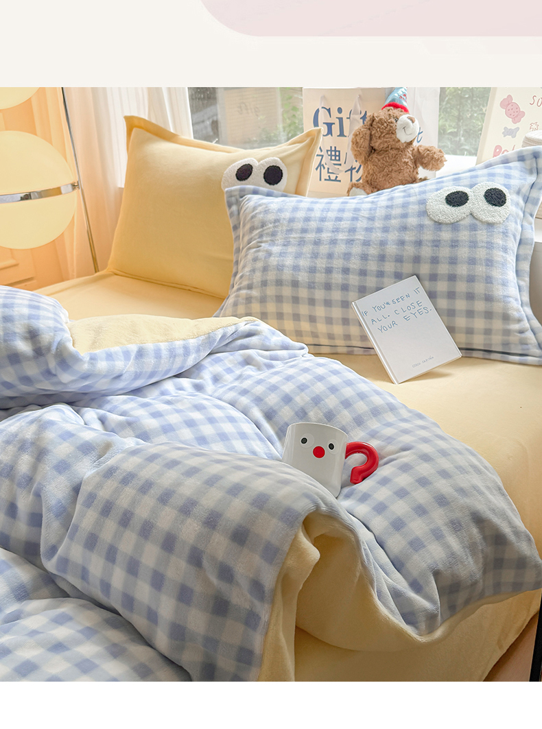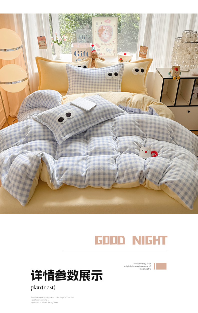 商品名称:温眠家纺 2025新款ins加厚毛巾绣大眼睛混搭撞色奶油格子牛奶绒四件套 绒-蓝格米黄