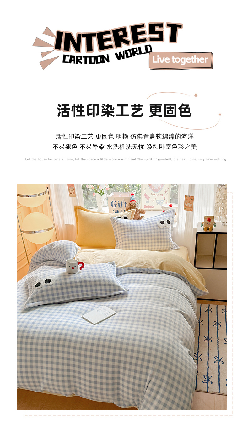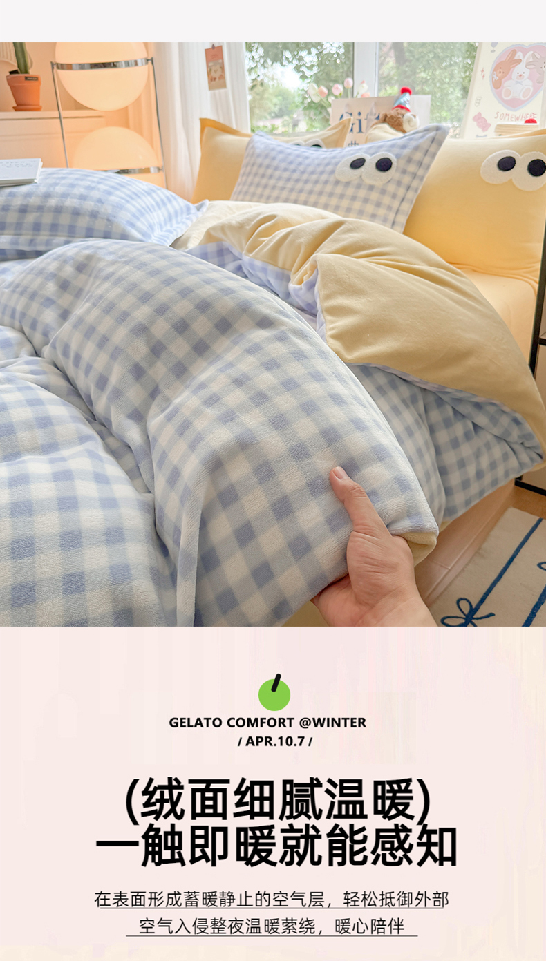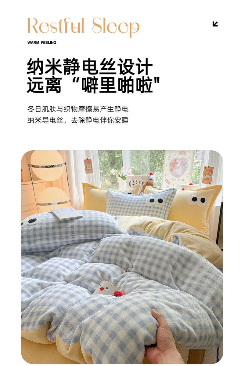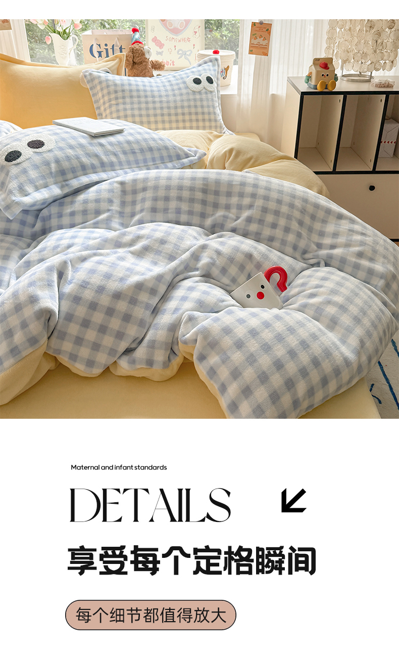 商品名称:温眠家纺 2025新款ins加厚毛巾绣大眼睛混搭撞色奶油格子牛奶绒四件套 绒-蓝格米黄