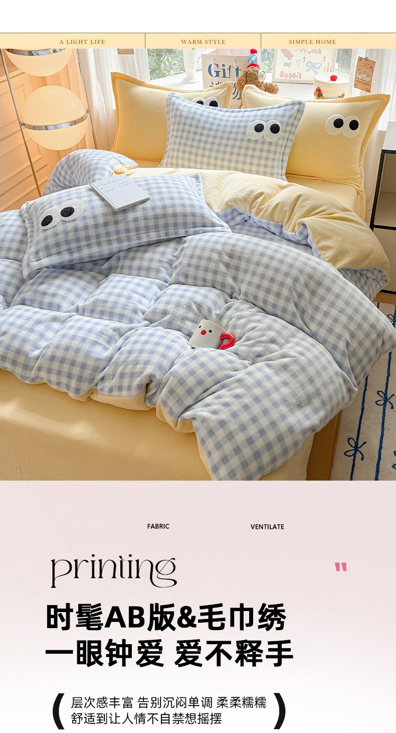 温眠家纺 2025新款ins加厚毛巾绣大眼睛混搭撞色奶油格子牛奶绒四件套 绒-蓝格米黄
