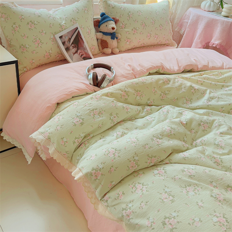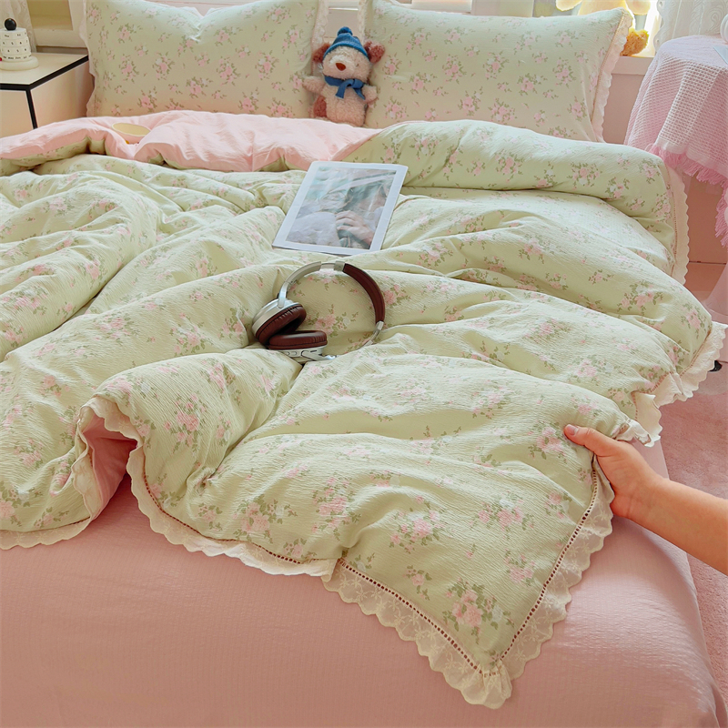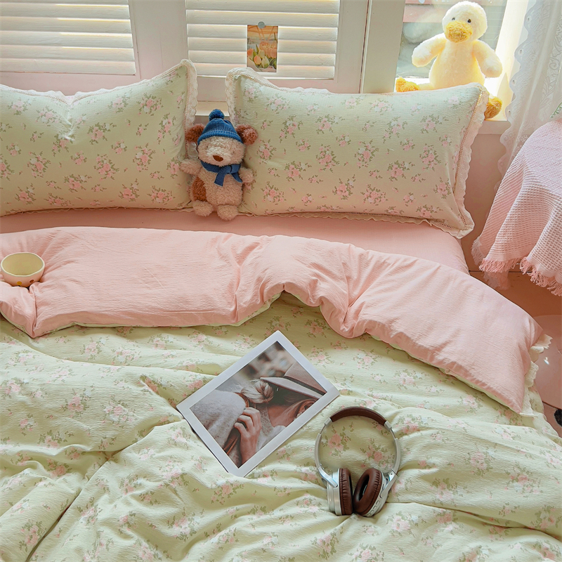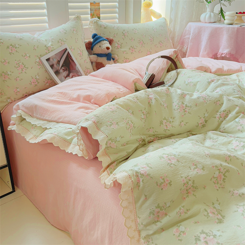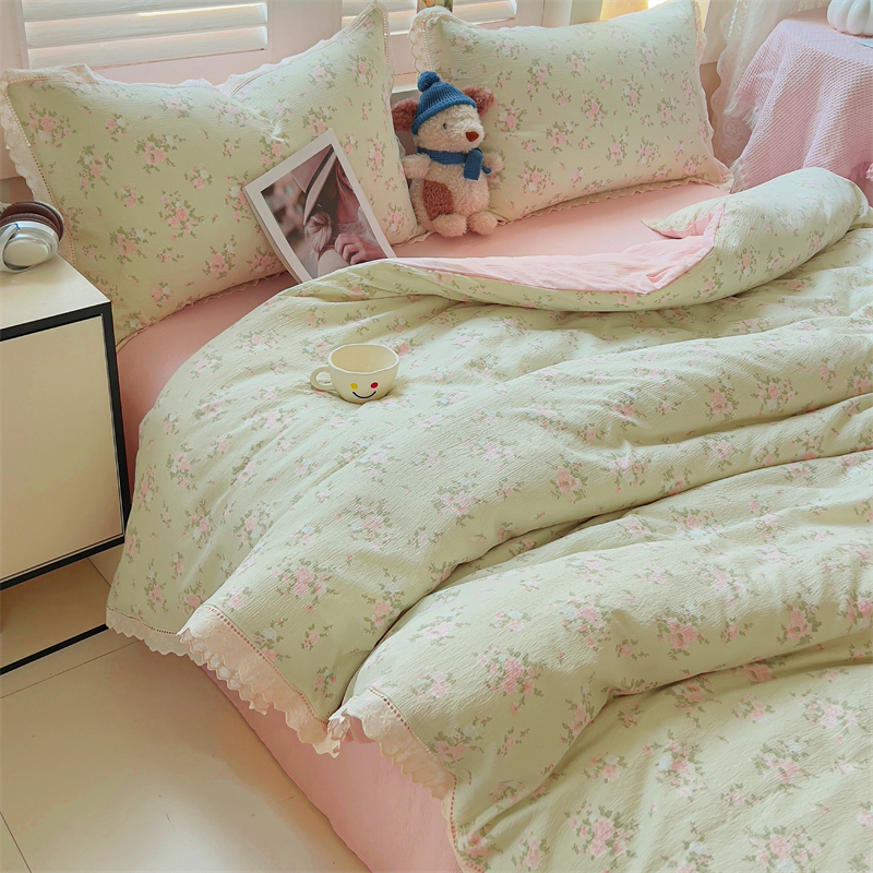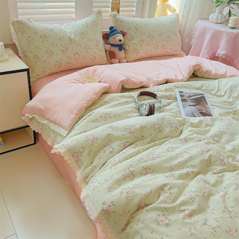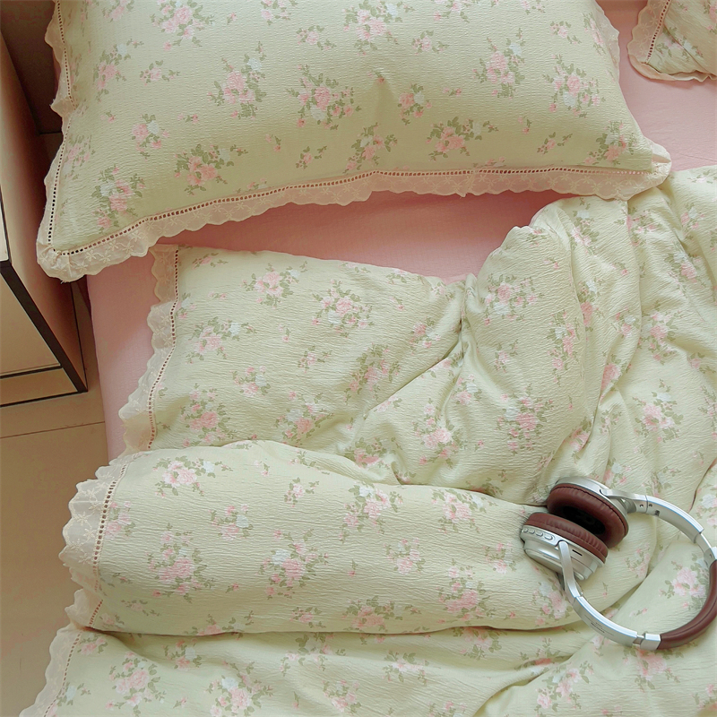 商品名称:壹号库家纺 2026新款云感木棉皱皱纱双层纱四件套-全棉花边款 甜茶