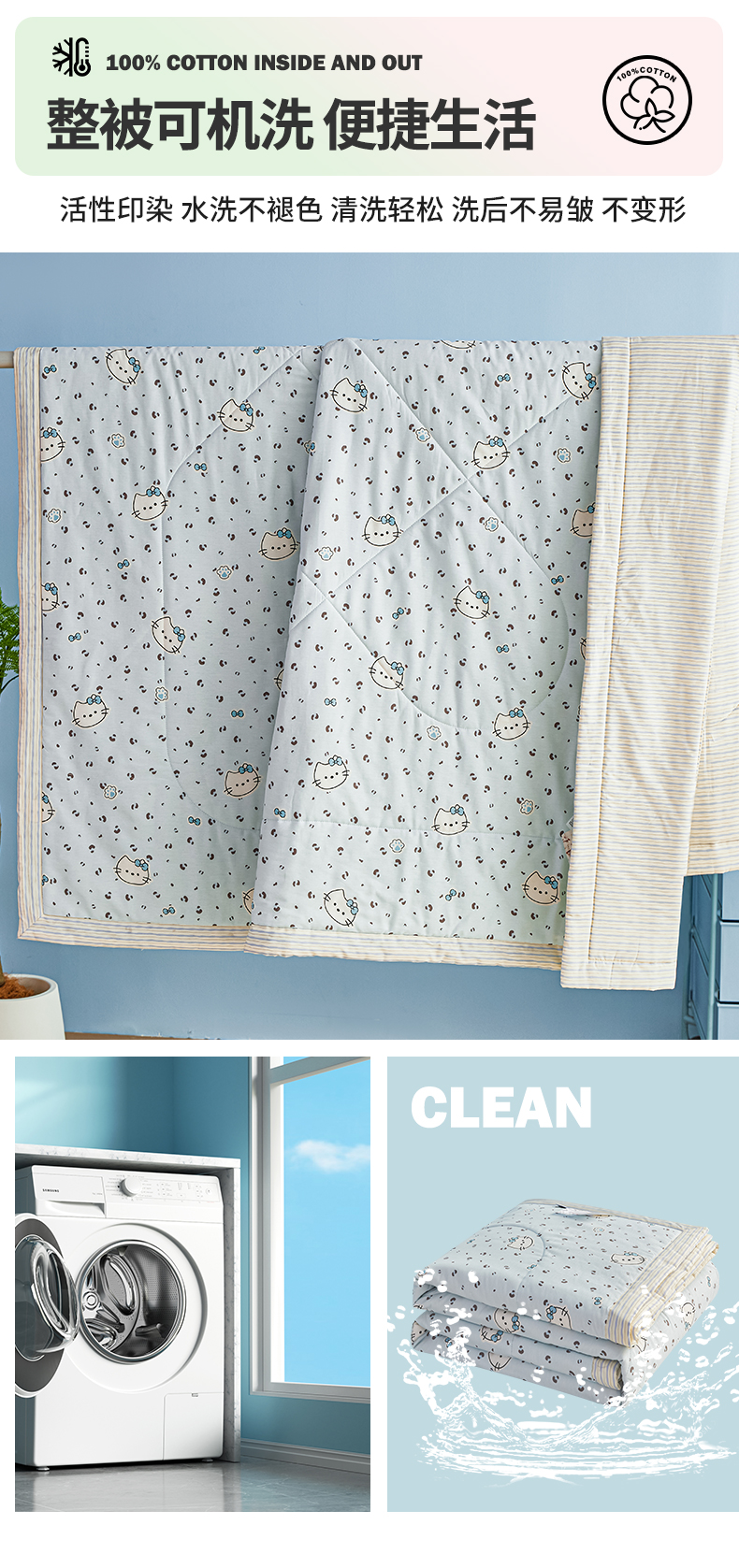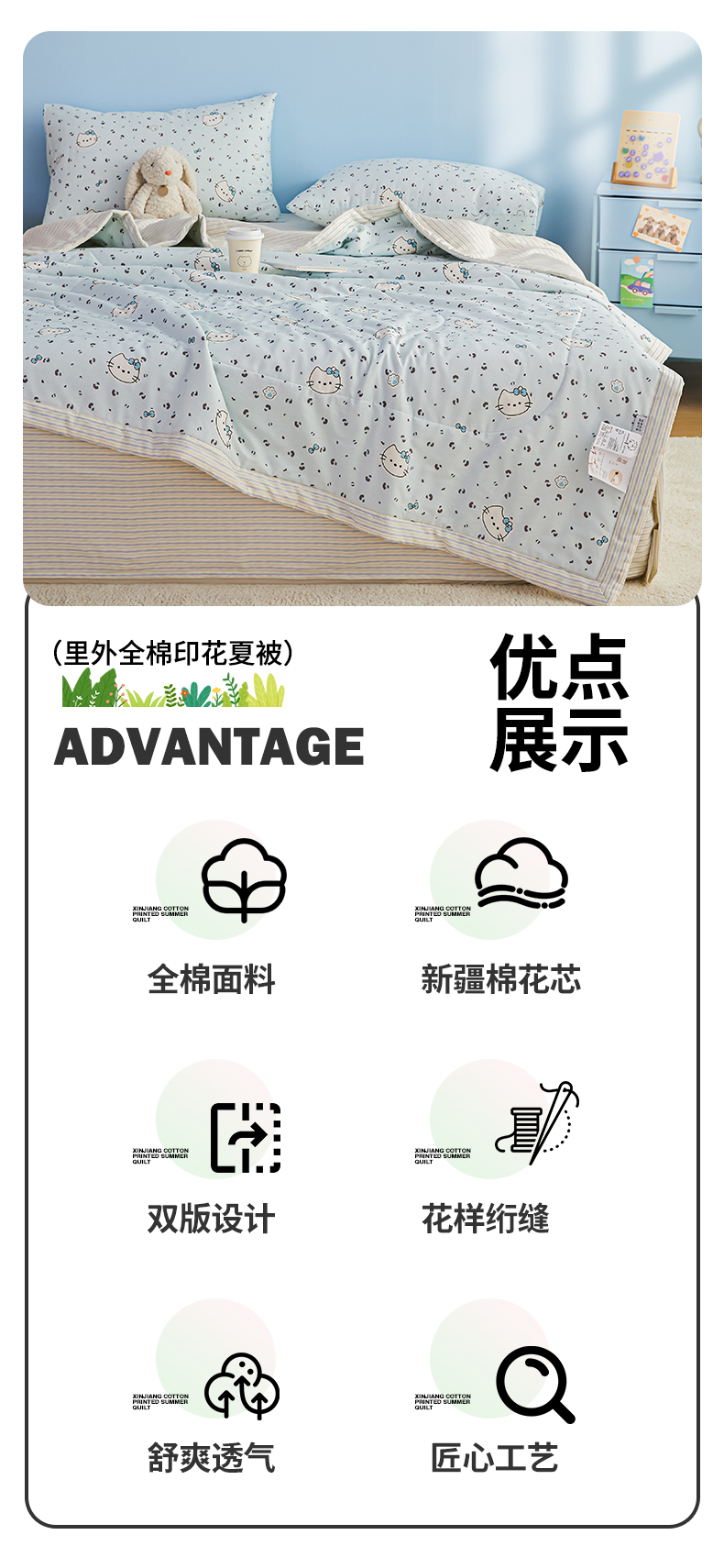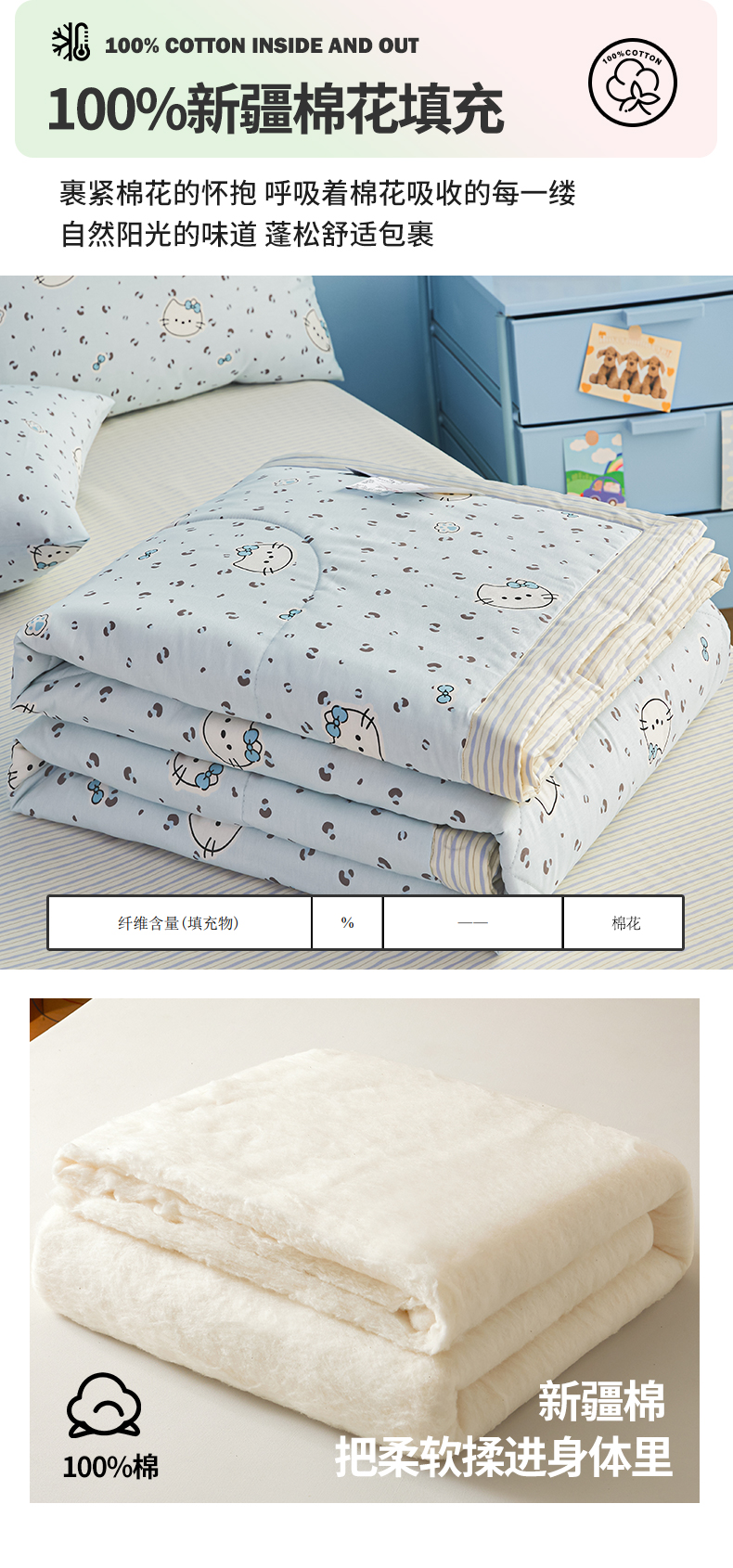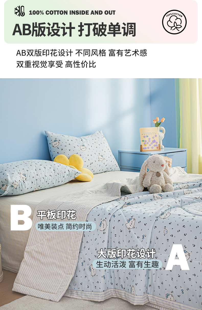 尊妙被业 2026年新款全棉纯棉印花100%棉花夏被四件套被子被芯-卡通风 凯蒂小姐-兰