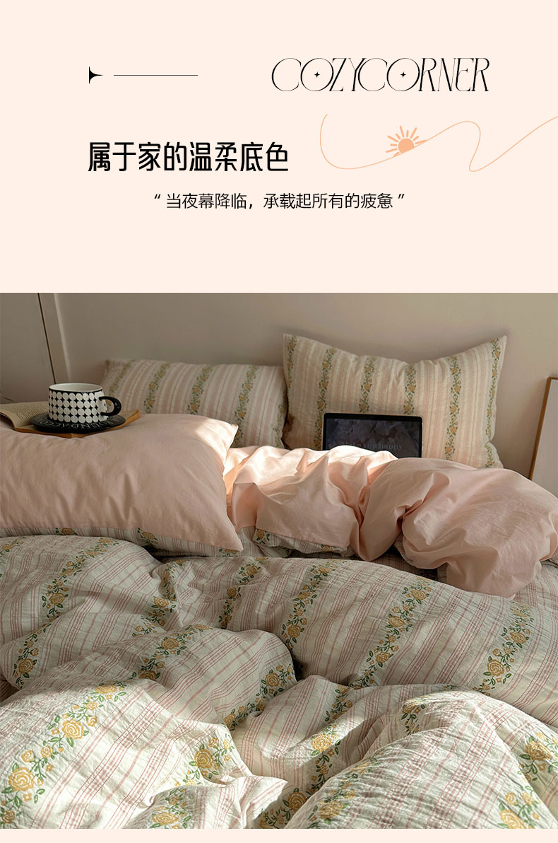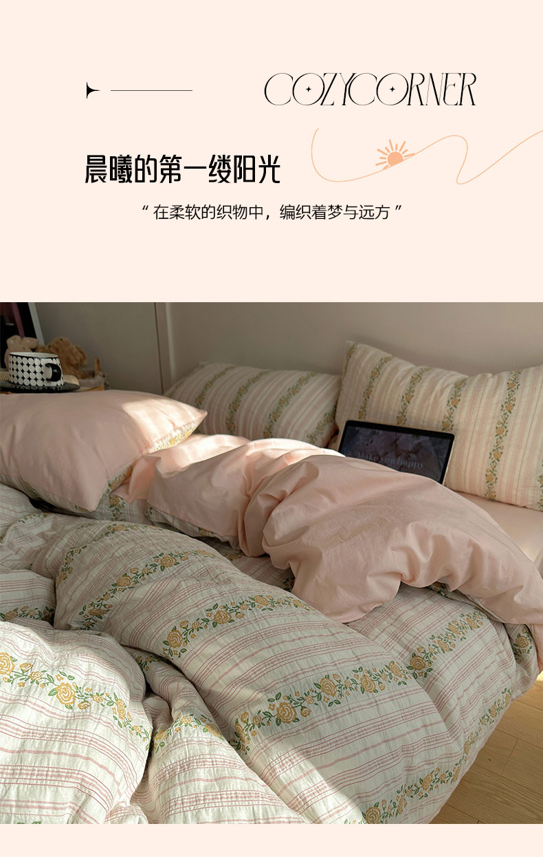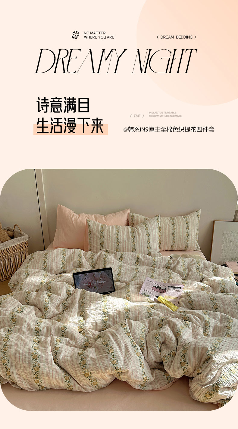 当前位置: 91家纺网 > 商品网购 > 床品套件 > 四件套 > 全棉普通四件套 > 六巷胡同 2026新款韩系INS博主风40S全棉色织提花四件套 弥花集-粉