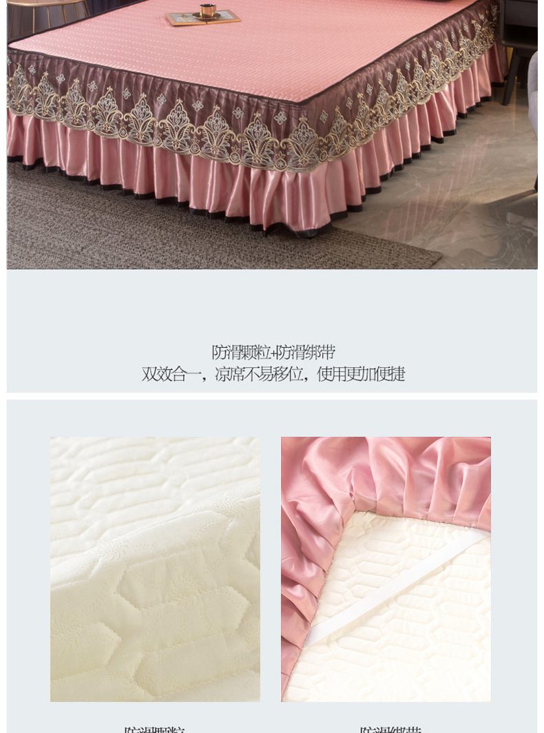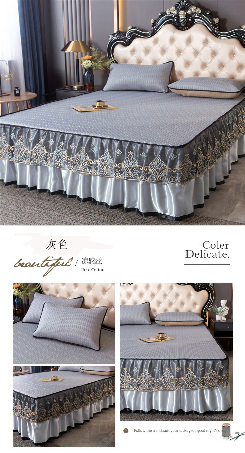 (总)能好家纺 2026春夏新款纯色+印花凉感丝乳胶凉席床裙款三件套,薄荷绿,豆沙,灰色,酒红,孔雀蓝,墨绿,雪青,棕色,古韵,小熊,雅韵,幽梦
