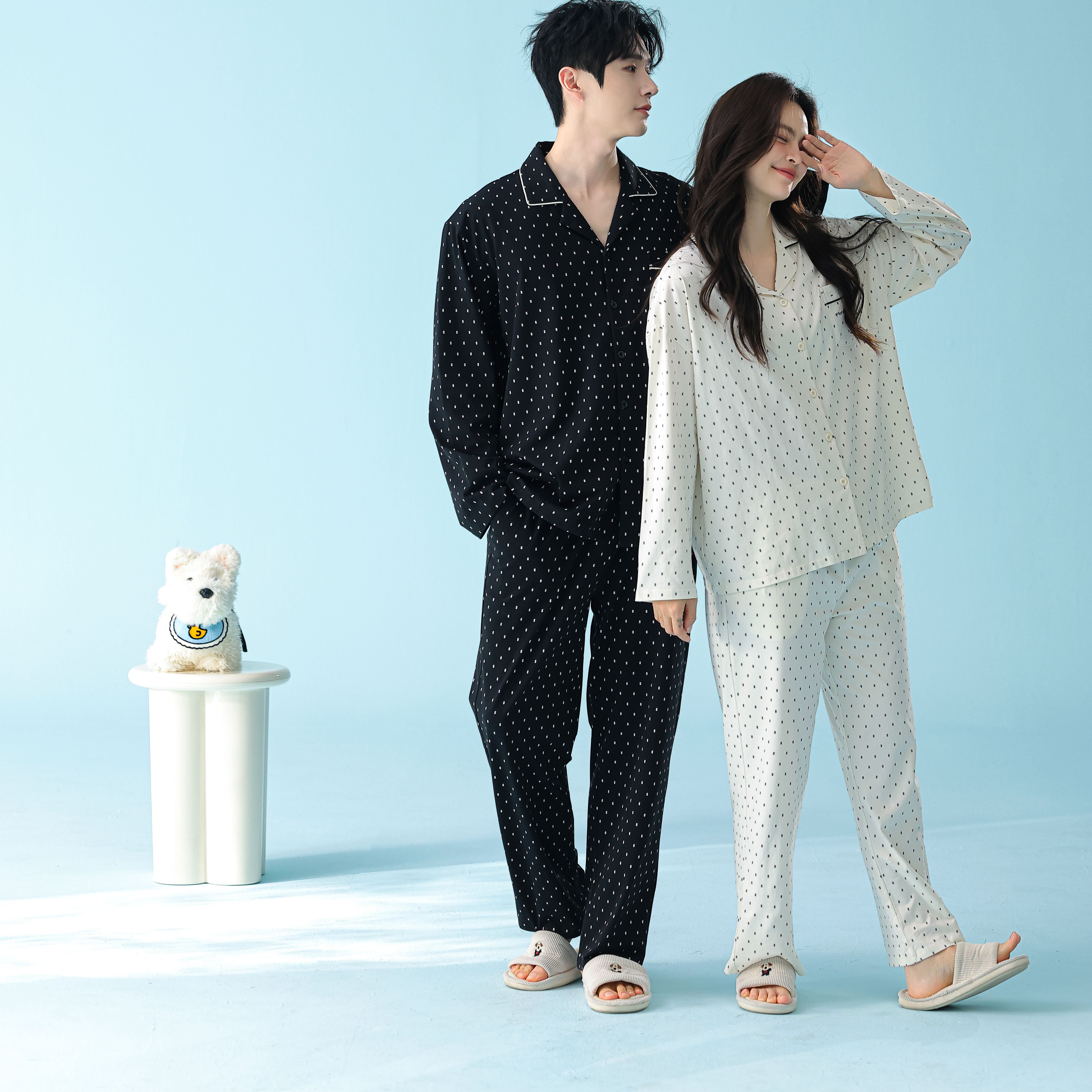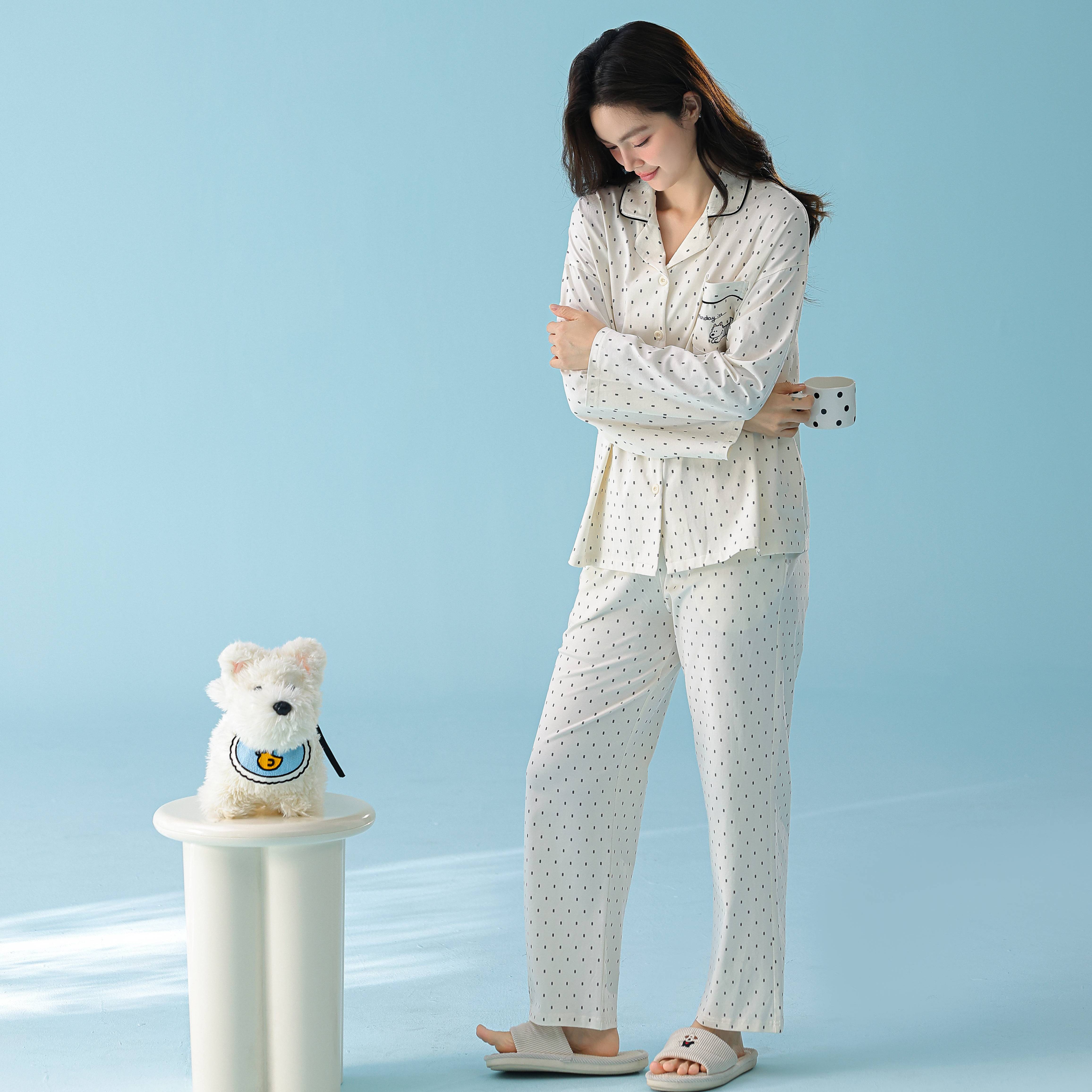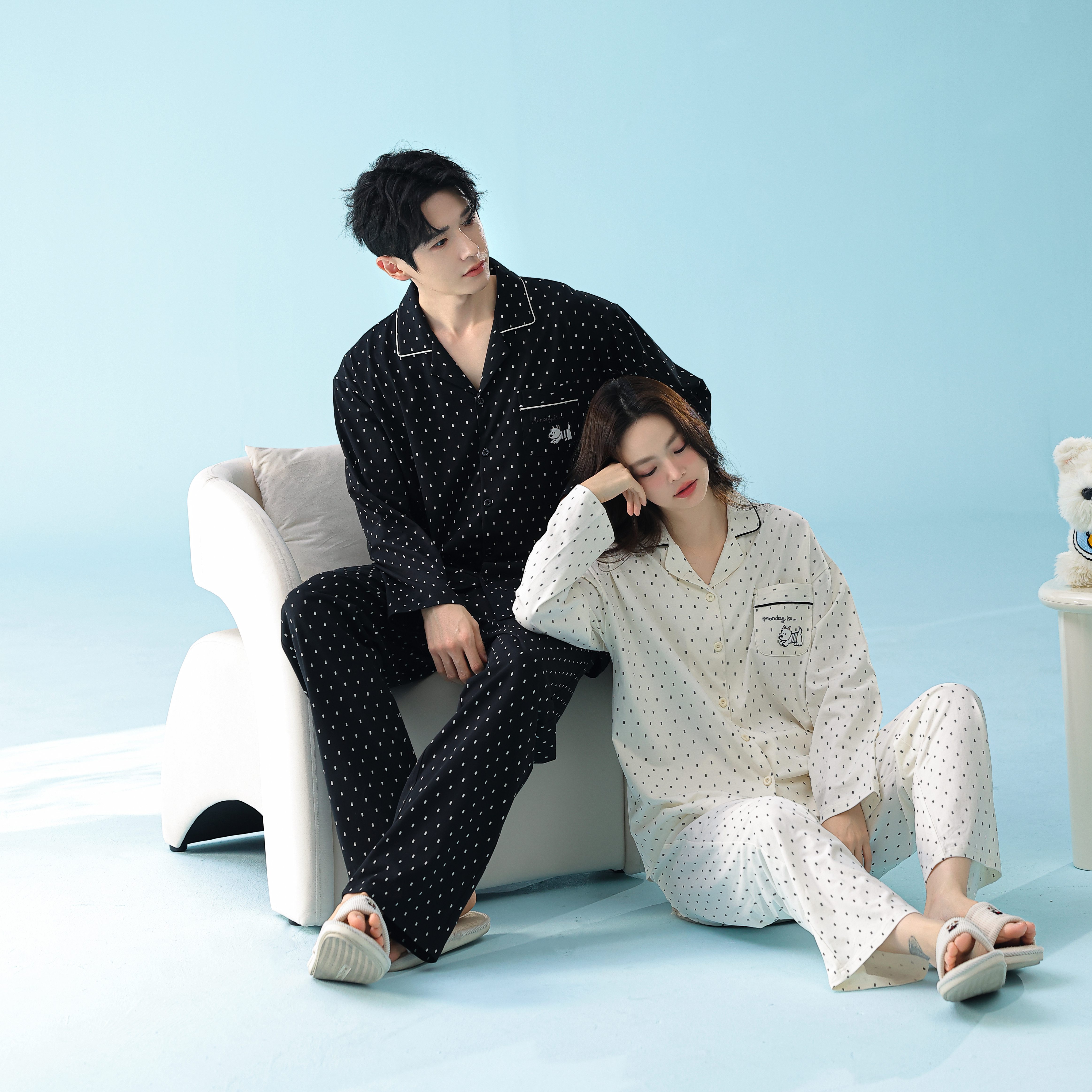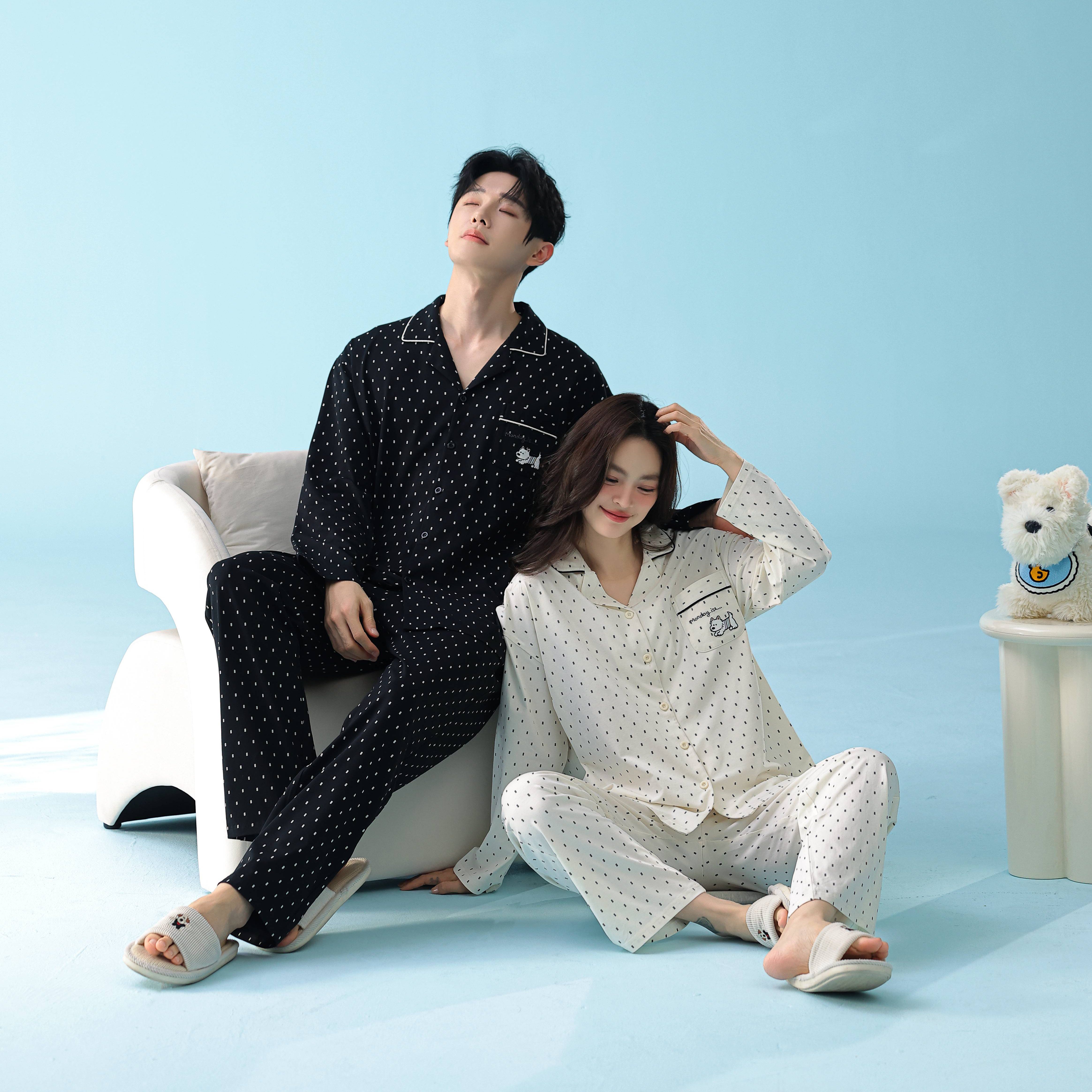 当前位置: 91家纺网 > 商品网购 > 居家日用 > 睡衣/家居服套装 > 妍景家居生活馆 2026新款新疆棉情侣款翻领黑白波点家居服 女款