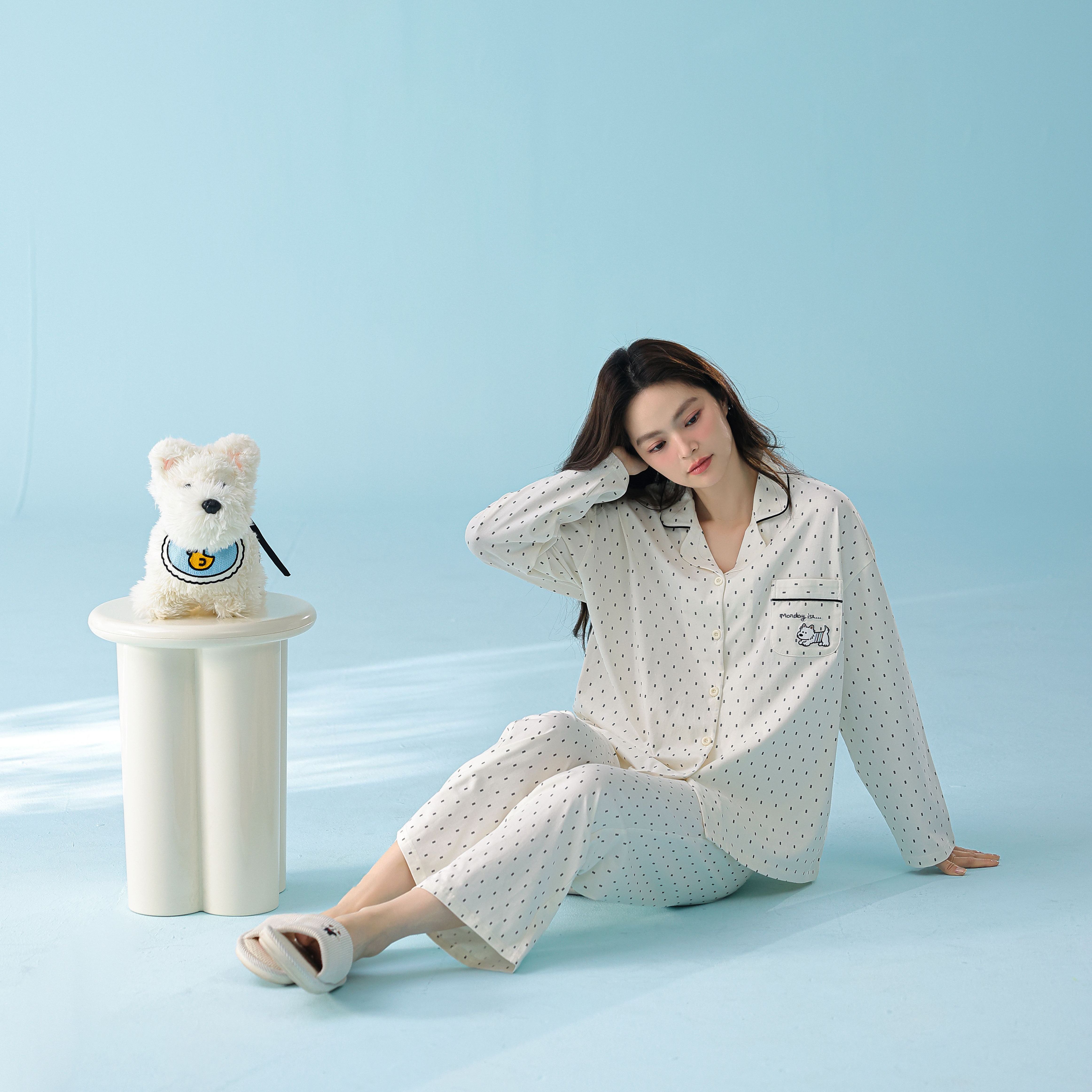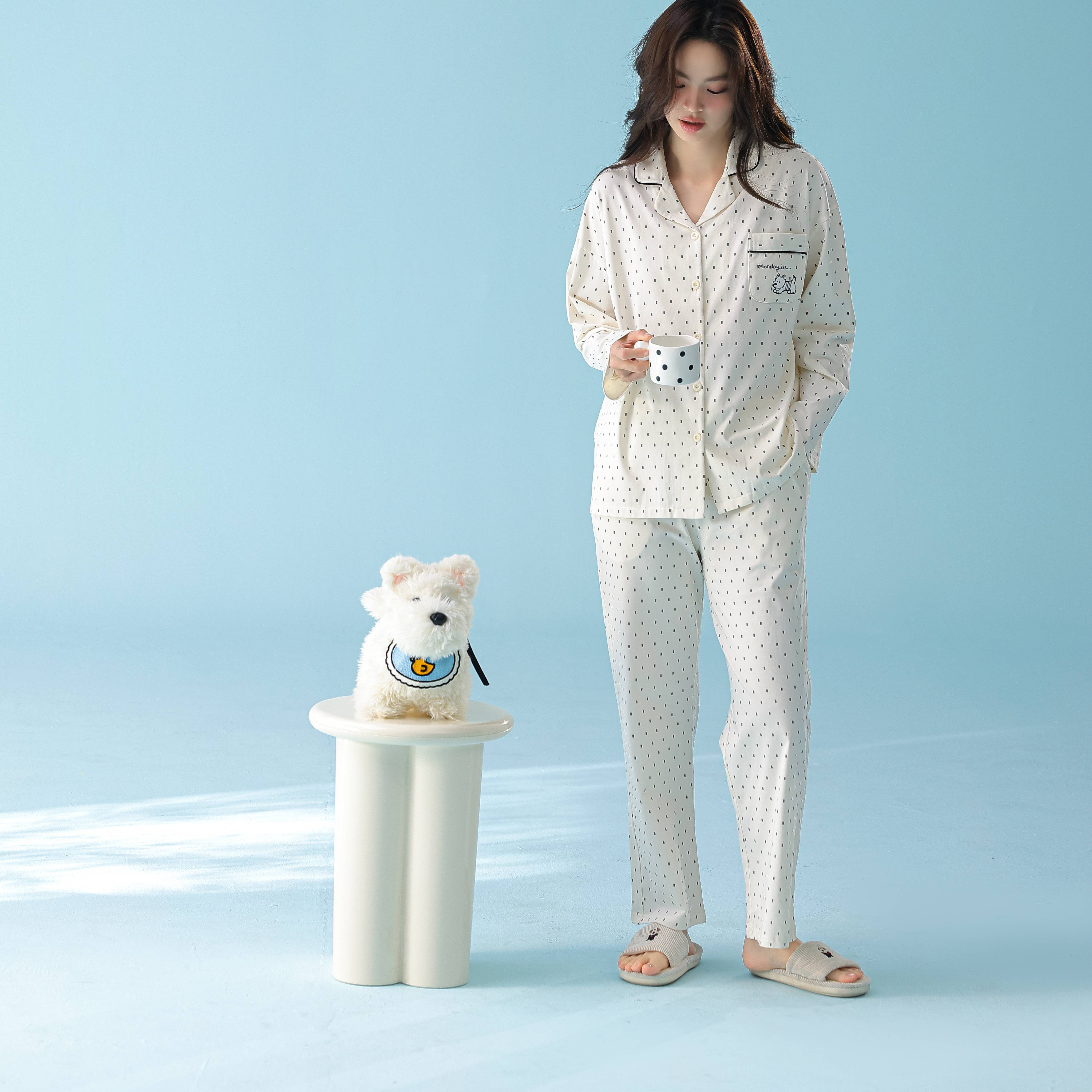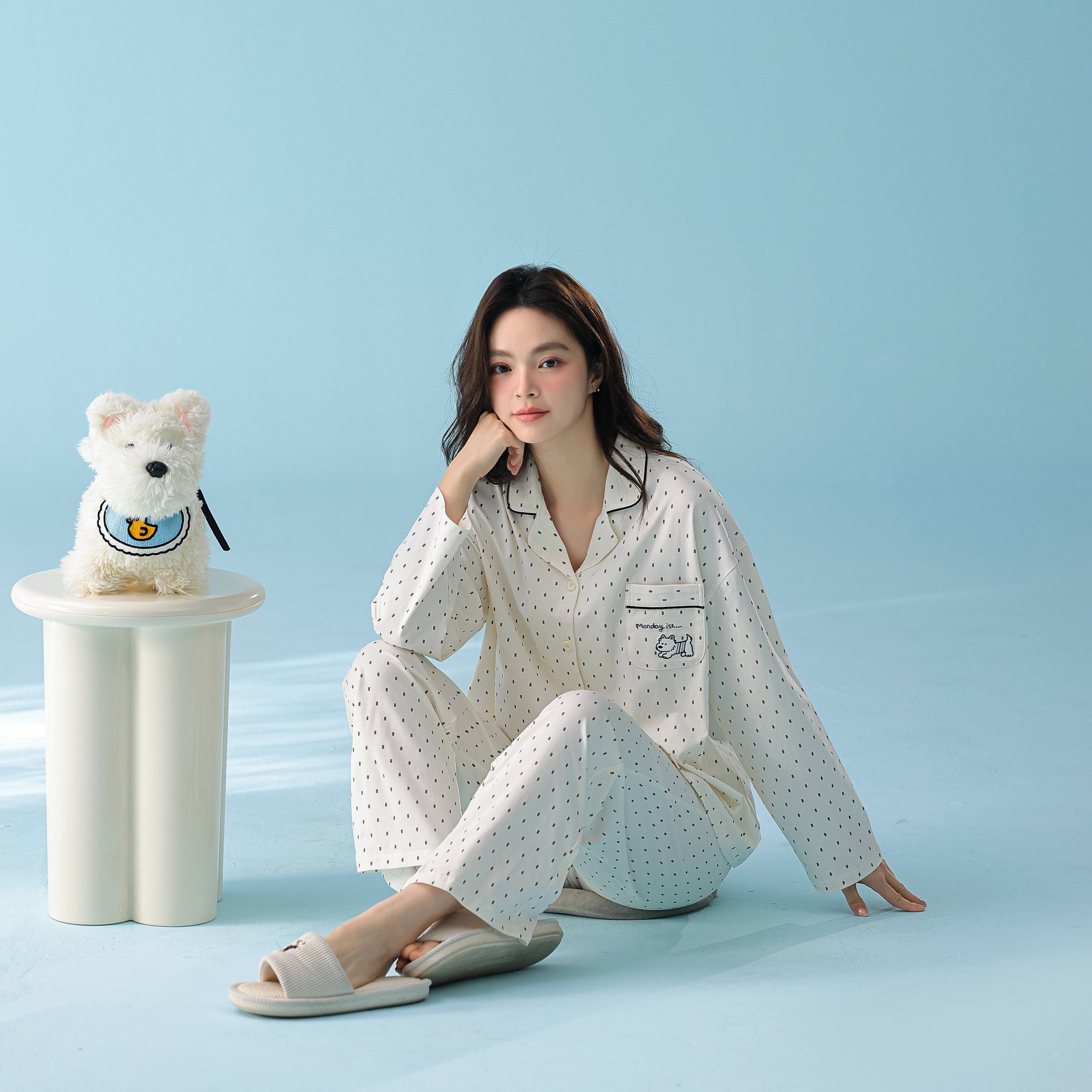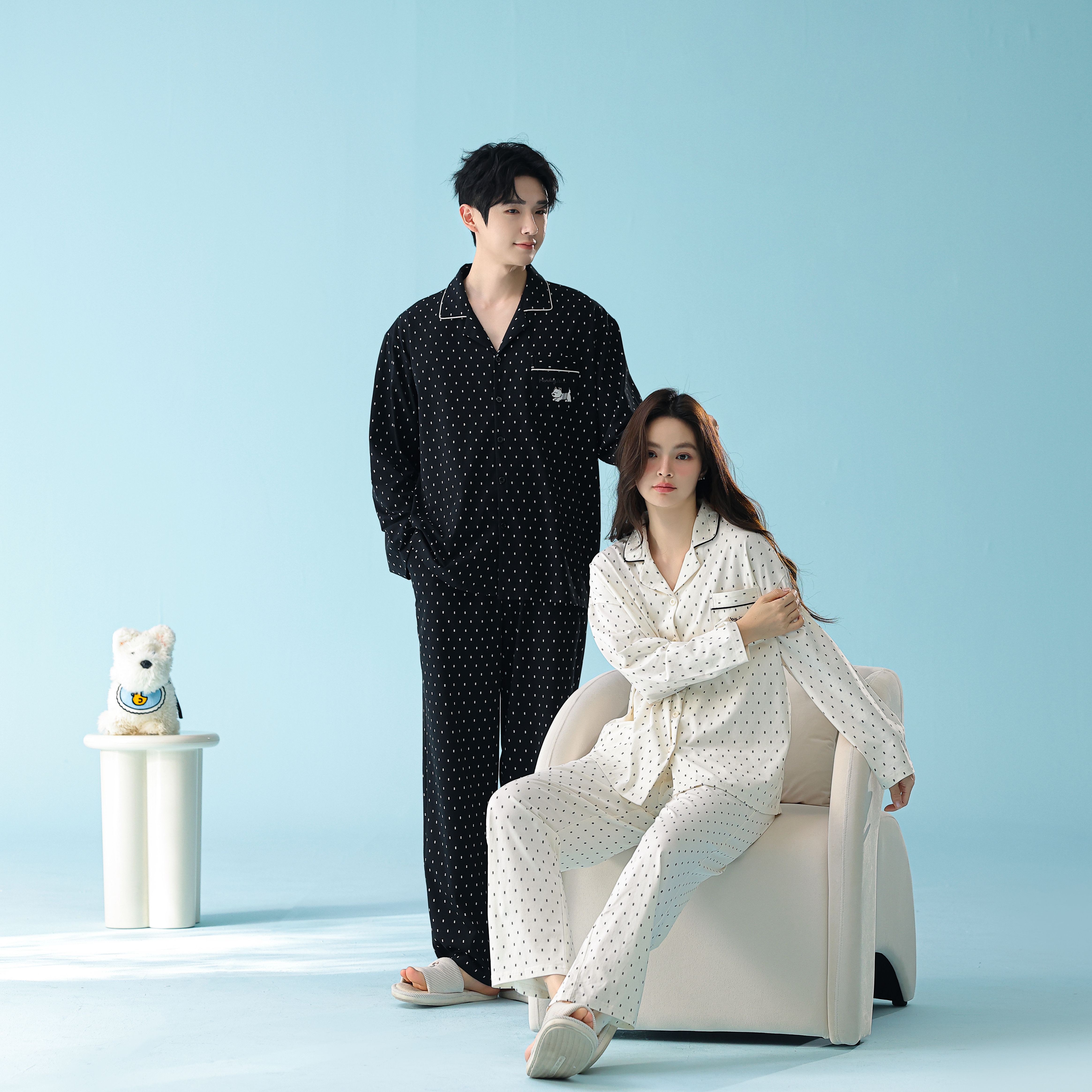 当前位置: 91家纺网 > 商品网购 > 居家日用 > 睡衣/家居服套装 > 妍景家居生活馆 2026新款新疆棉情侣款翻领黑白波点家居服 女款