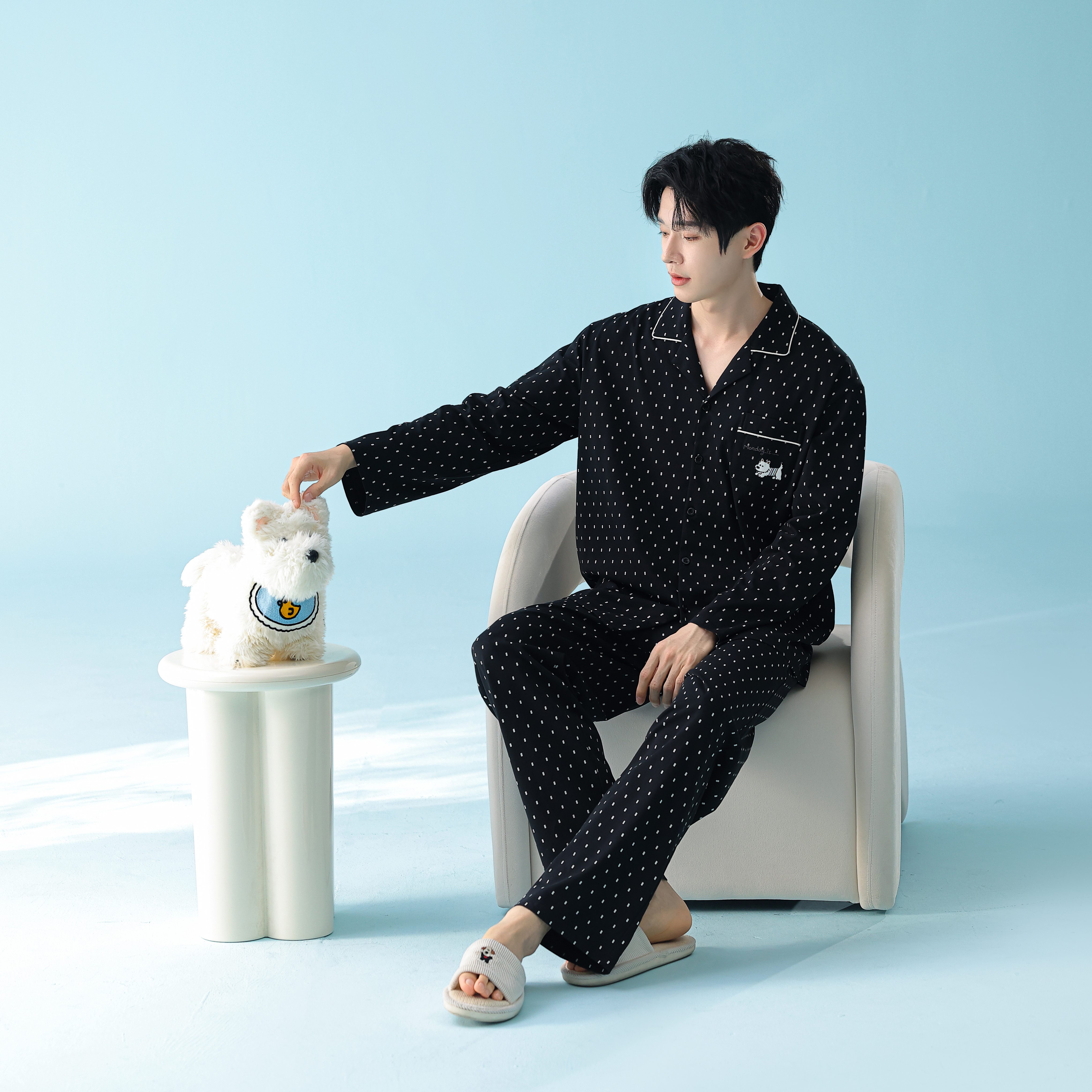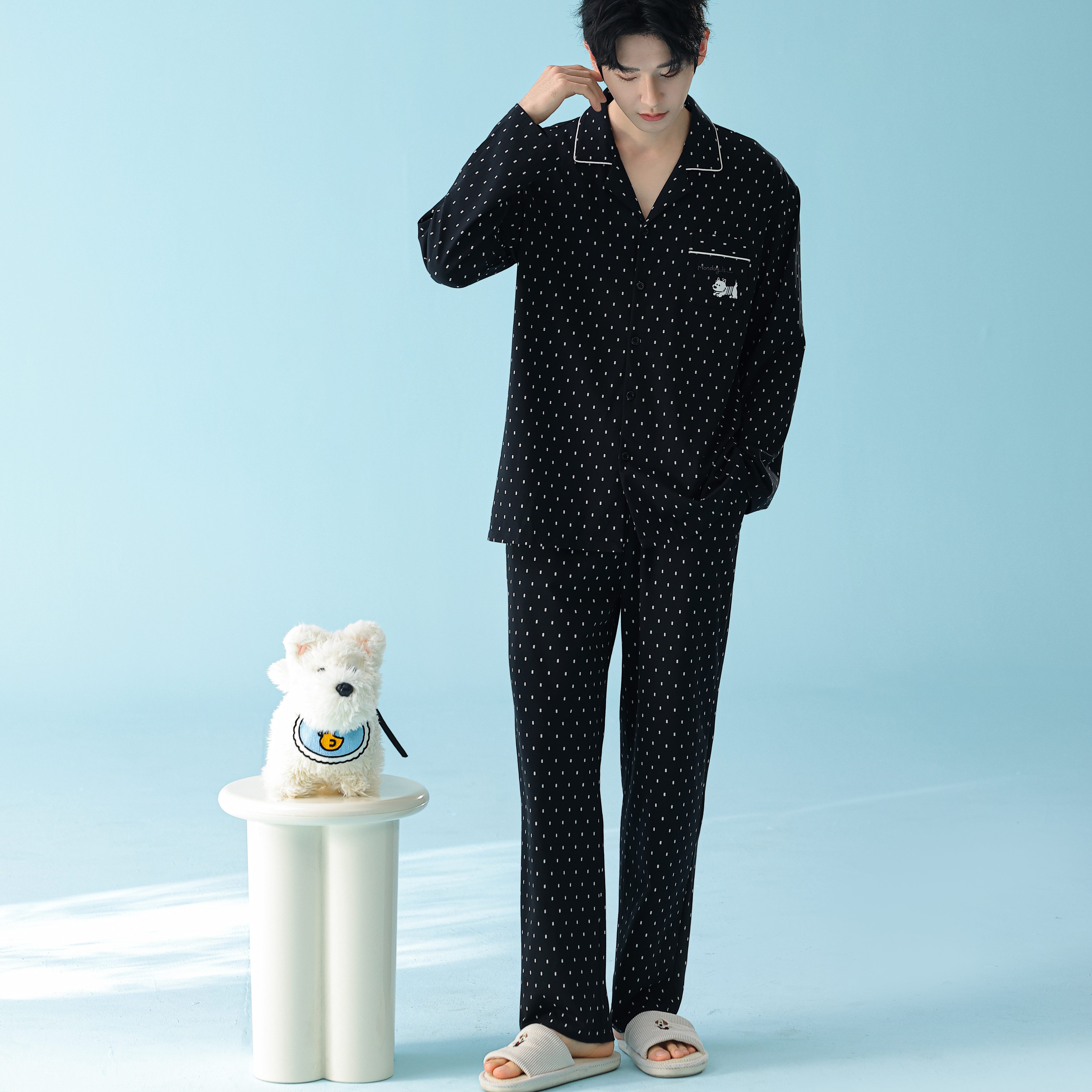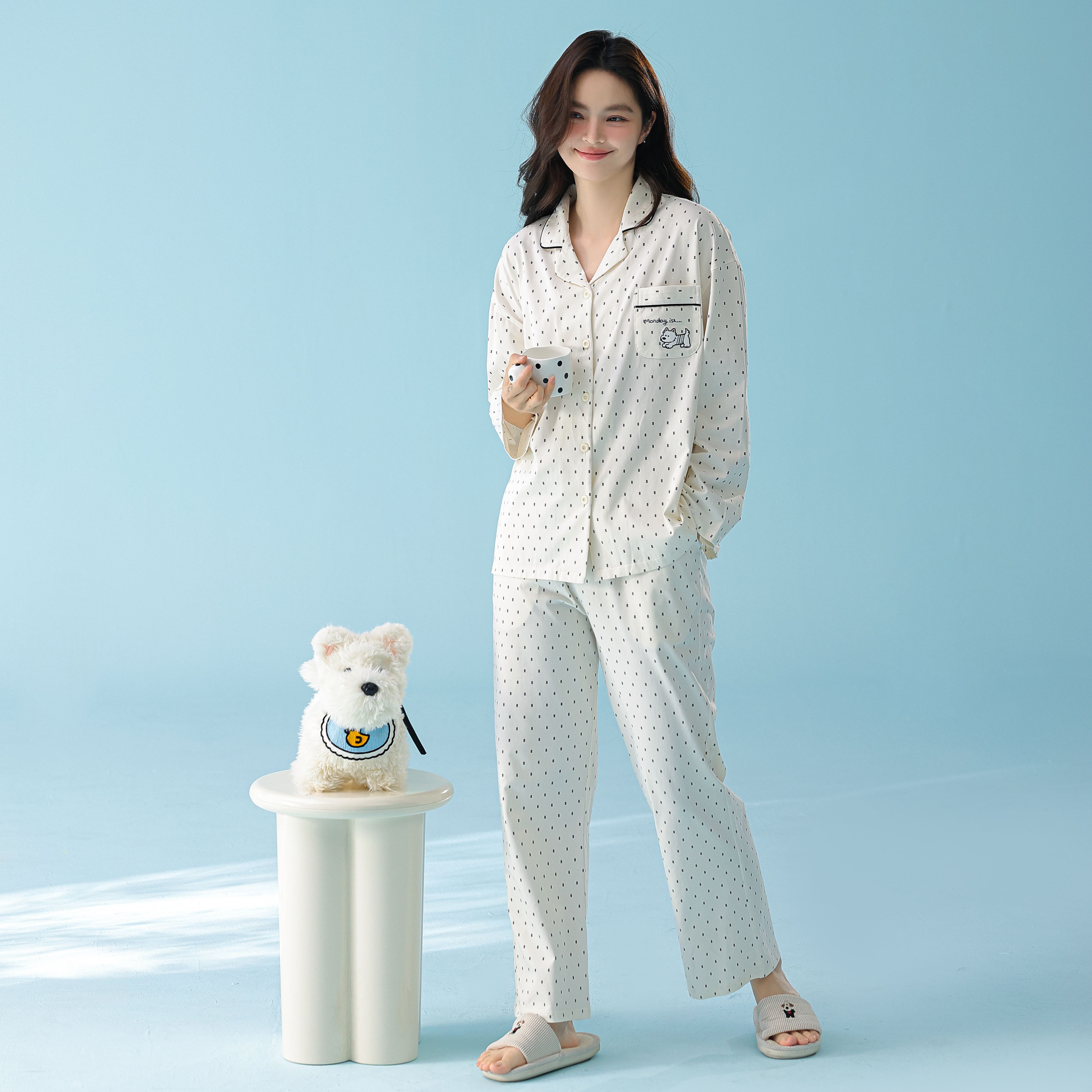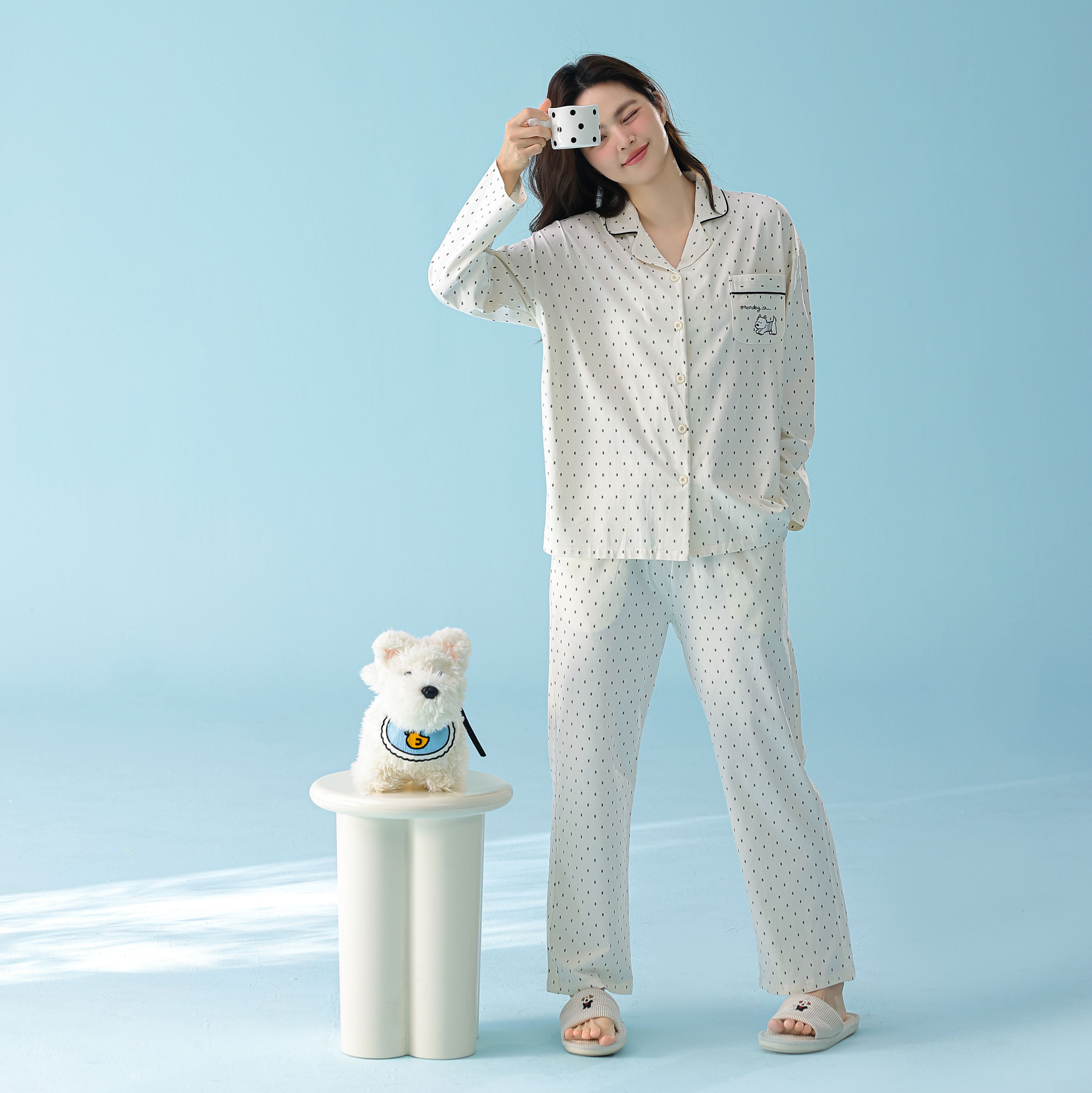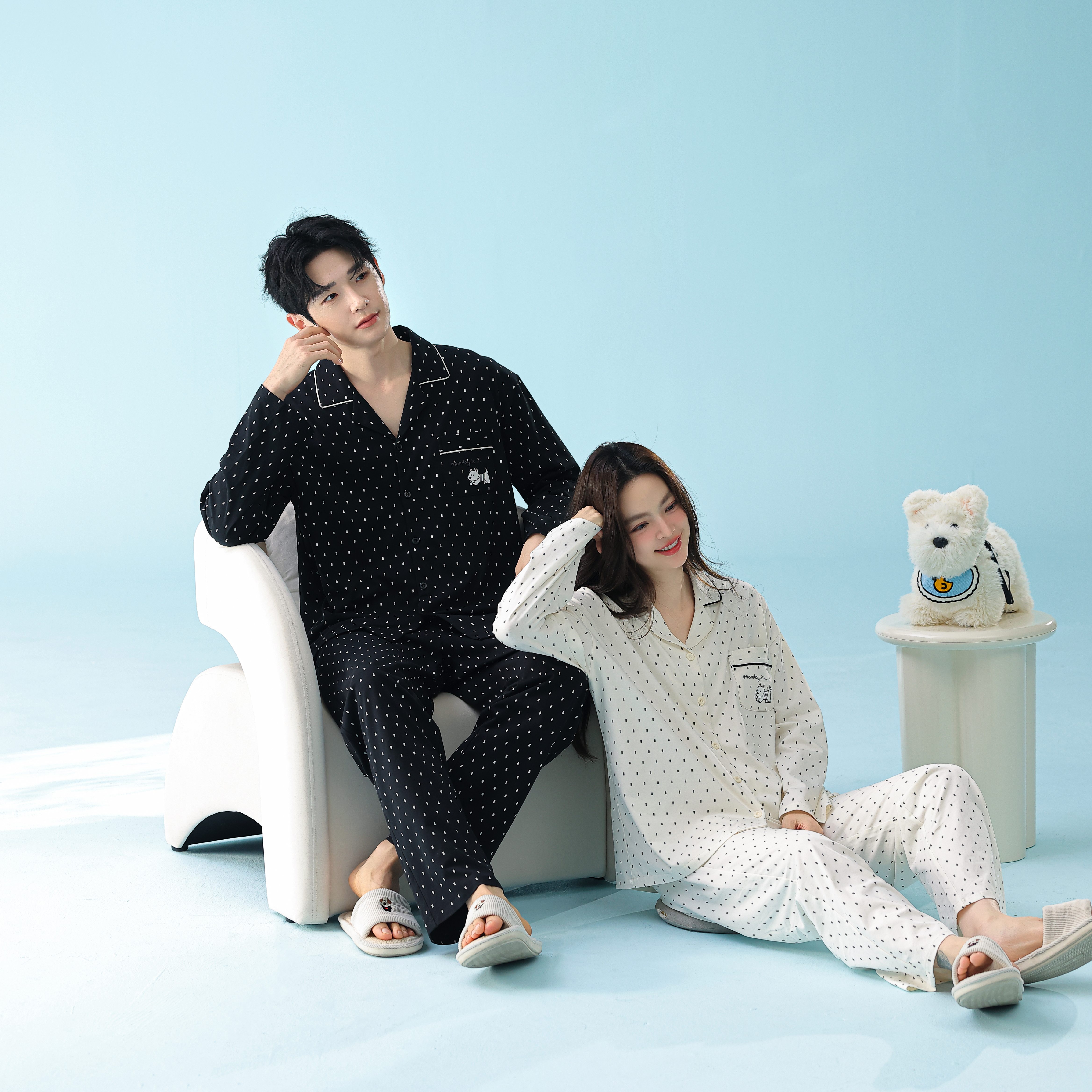 当前位置: 91家纺网 > 商品网购 > 居家日用 > 睡衣/家居服套装 > 妍景家居生活馆 2026新款新疆棉情侣款翻领黑白波点家居服 女款