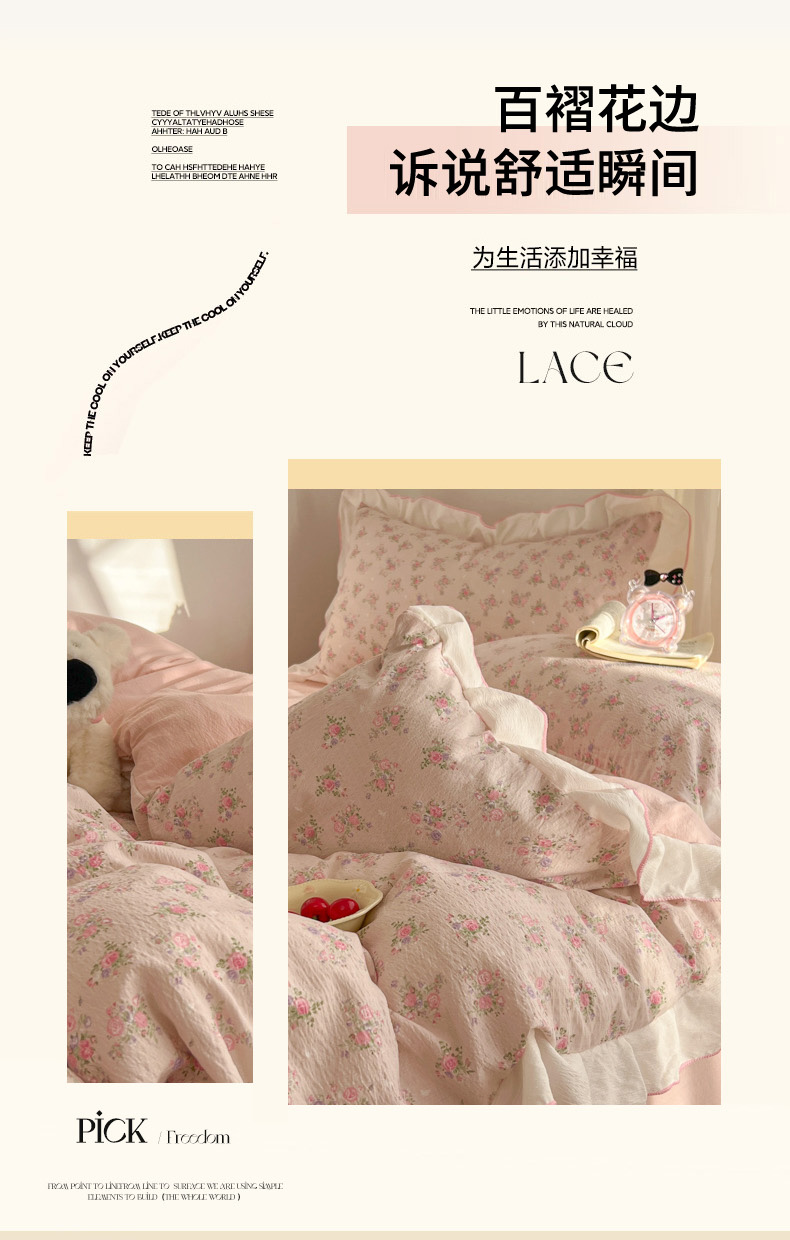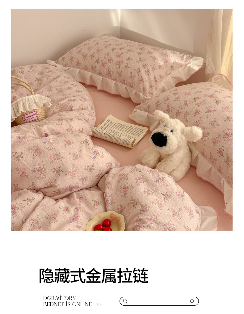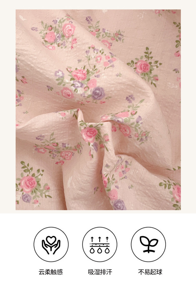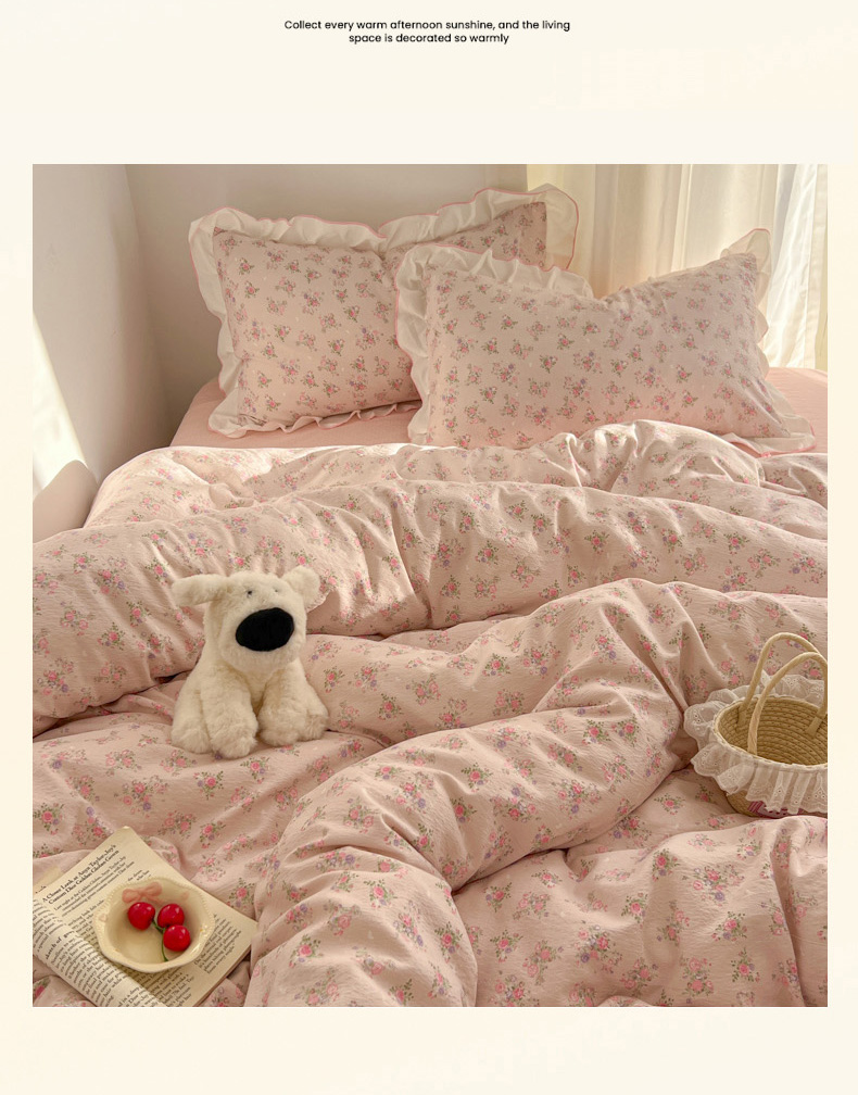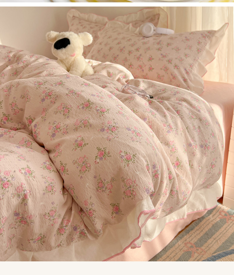 当前位置: 91家纺网 > 商品网购 > 床品套件 > 四件套 > 其它四件套 > 柒月家居 2026新款小清新木棉皱皱纱花边款四件套 花田梦