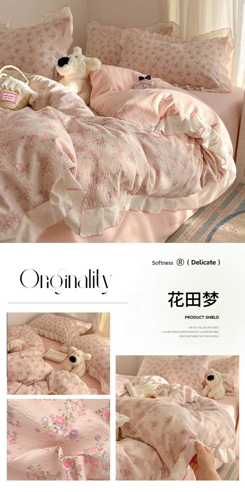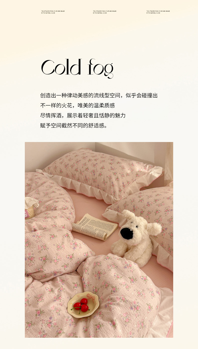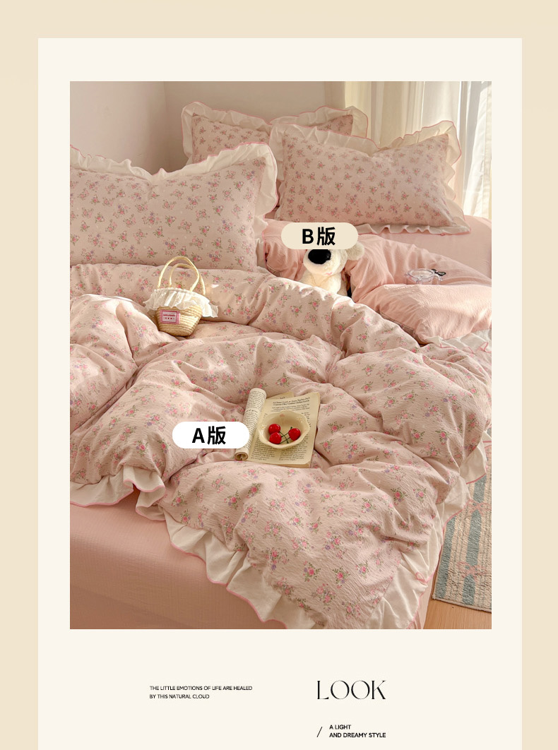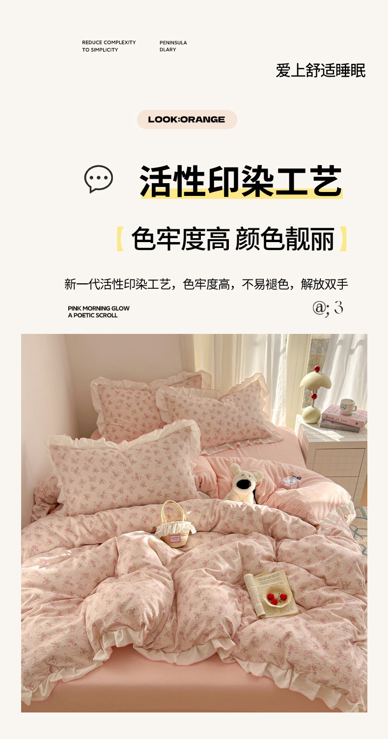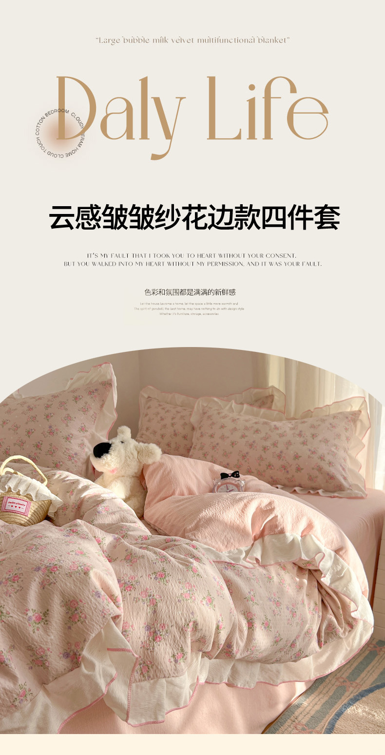 当前位置: 91家纺网 > 商品网购 > 床品套件 > 四件套 > 其它四件套 > 柒月家居 2026新款小清新木棉皱皱纱花边款四件套 花田梦