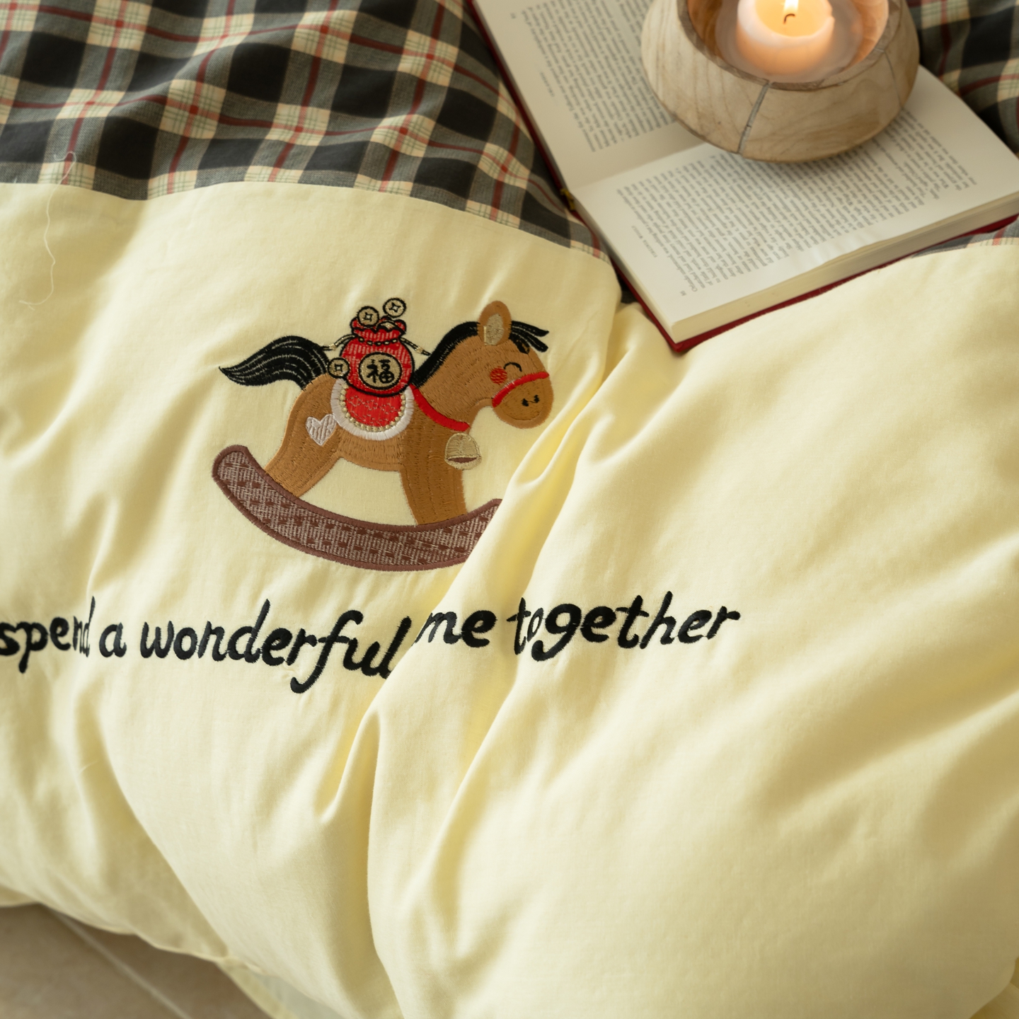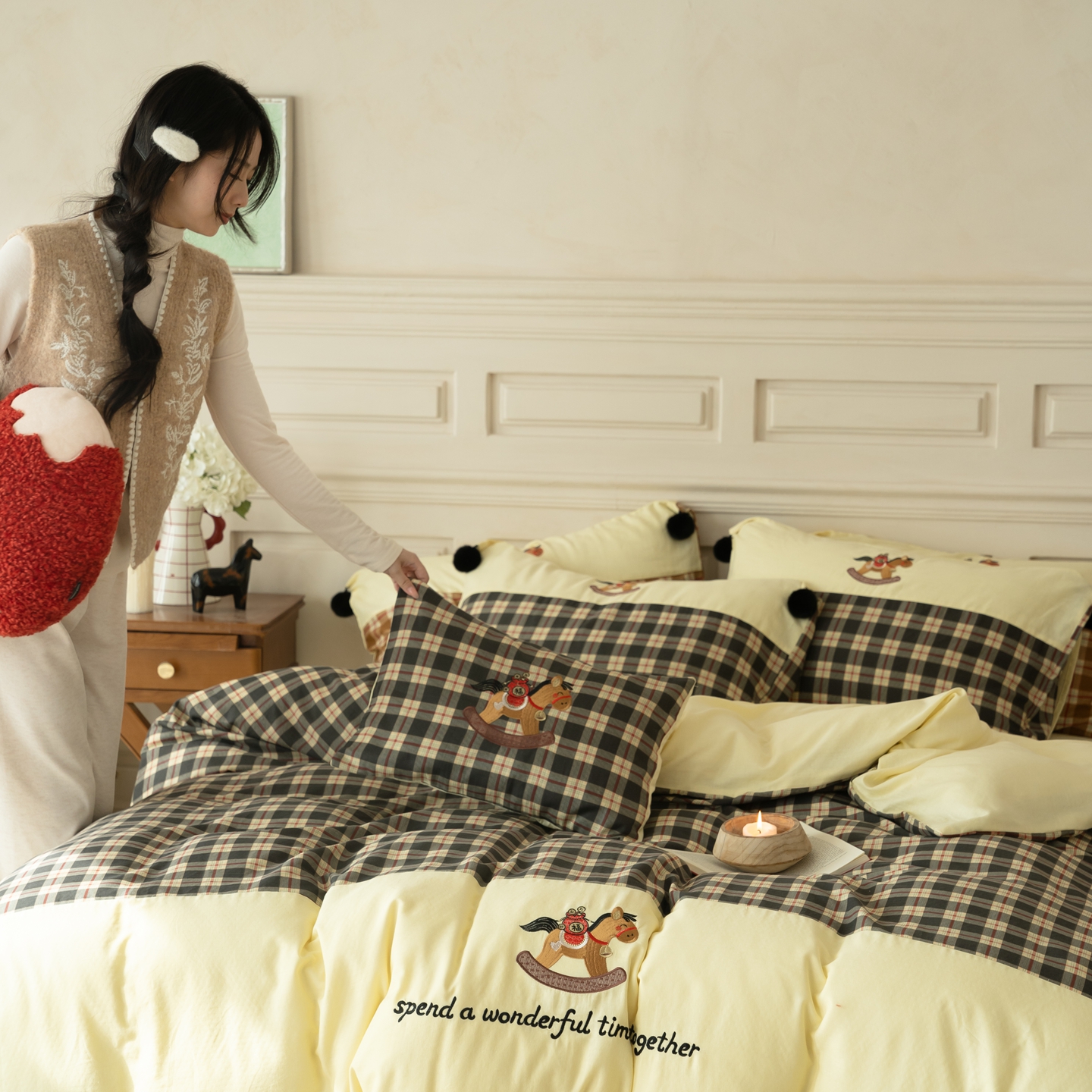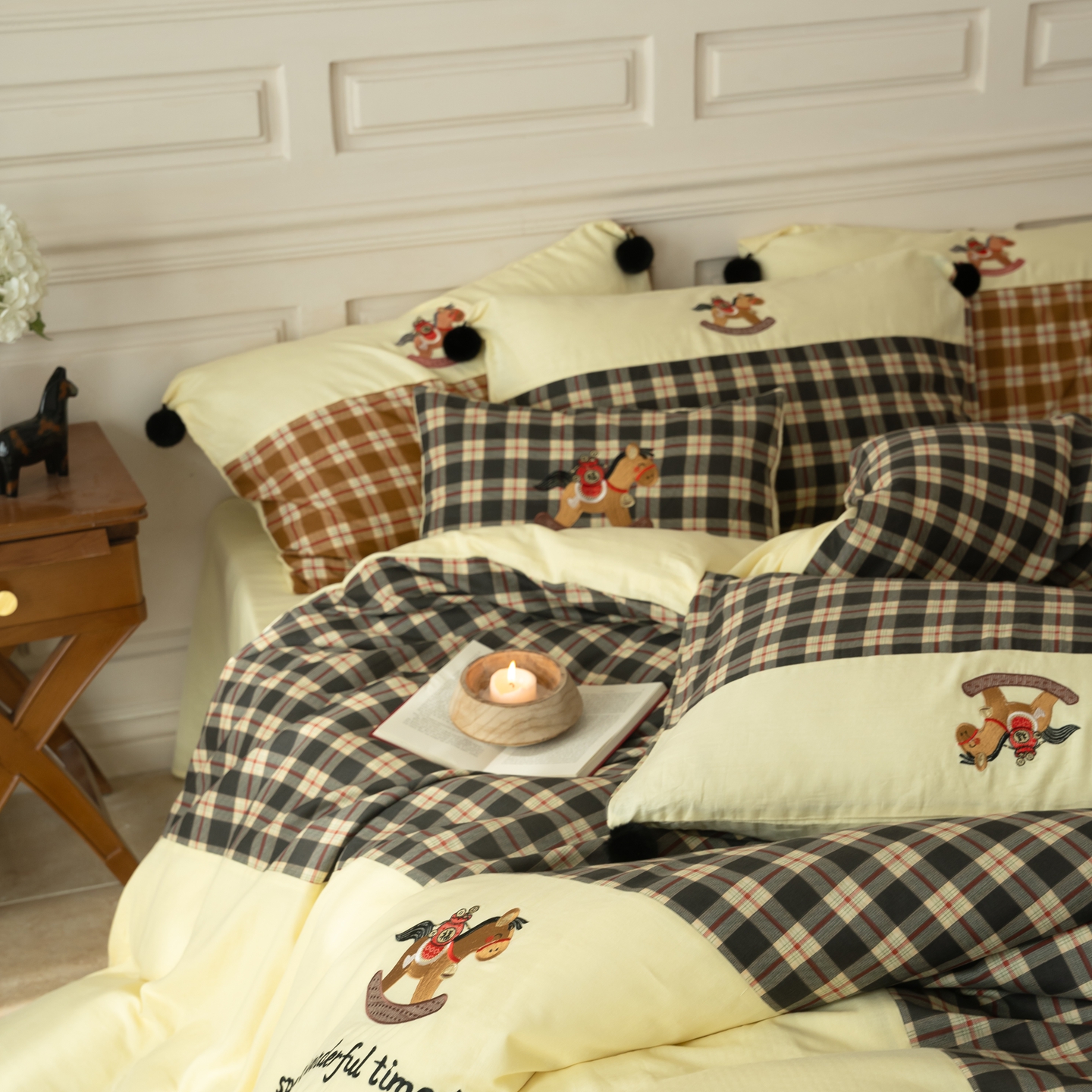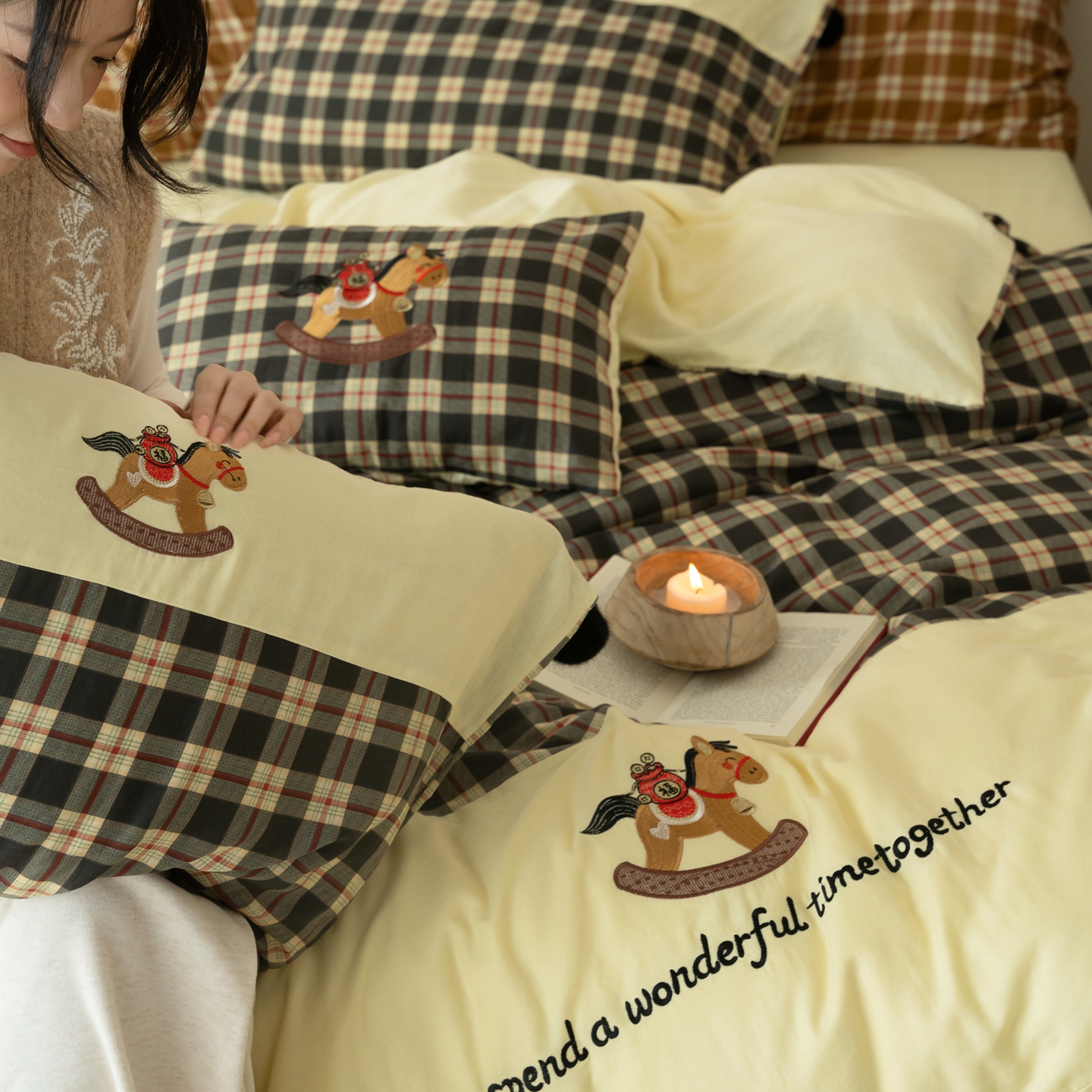(总)优然居家纺 2026新款全棉双层纱刺绣四件套-马上有钱(控价260/328/348),马上有钱-黑格,马上有钱-黄格,马上有钱-绿格