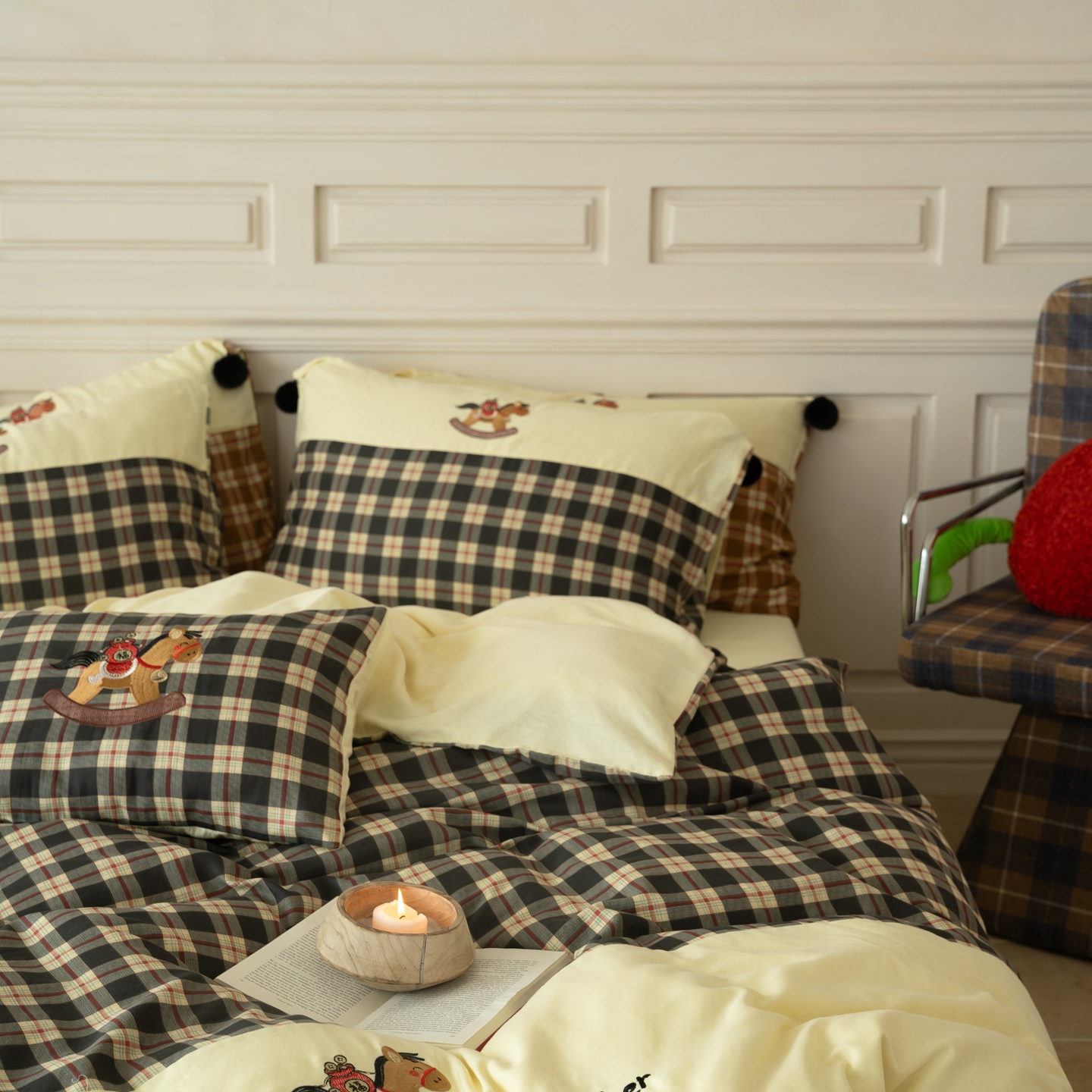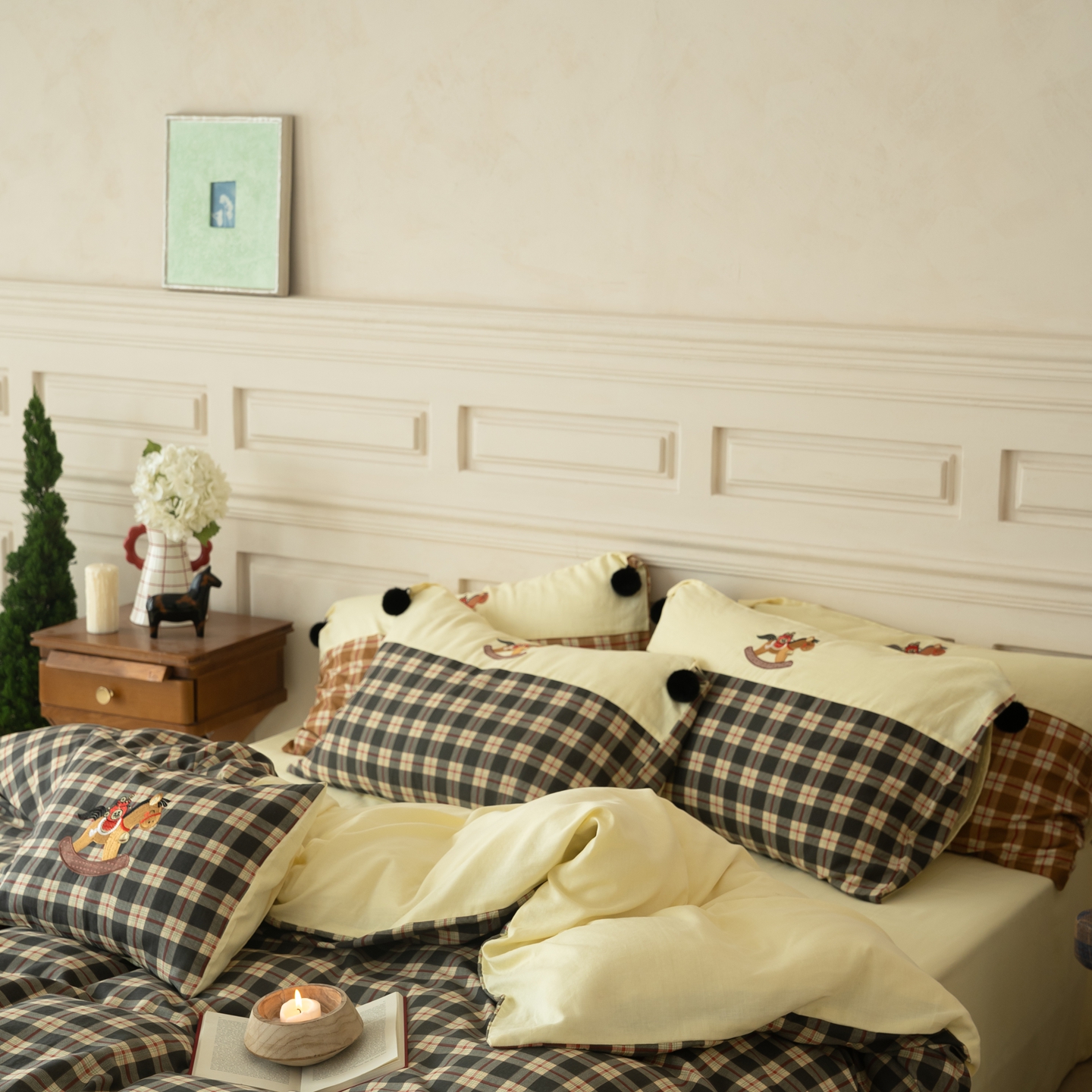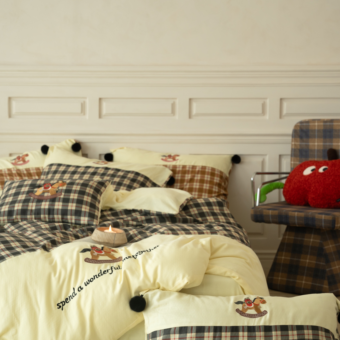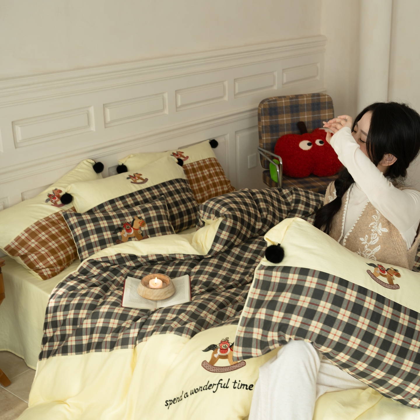 (总)优然居家纺 2026新款全棉双层纱刺绣四件套-马上有钱(控价260/328/348),马上有钱-黑格,马上有钱-黄格,马上有钱-绿格