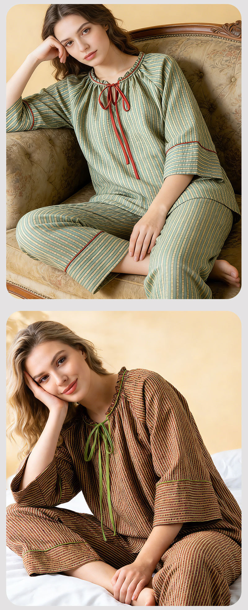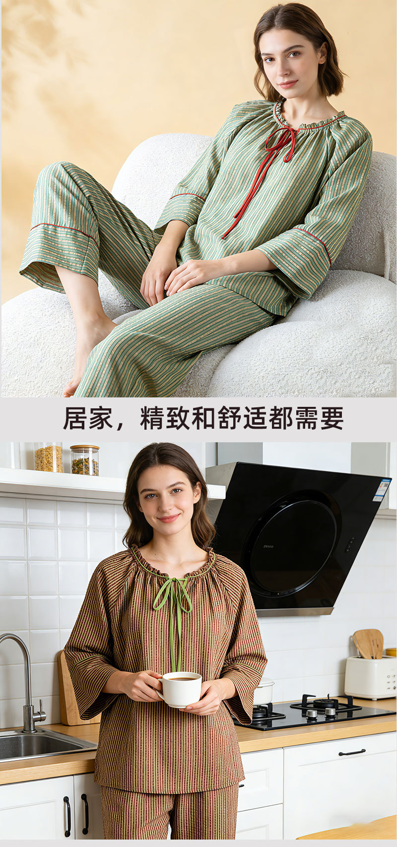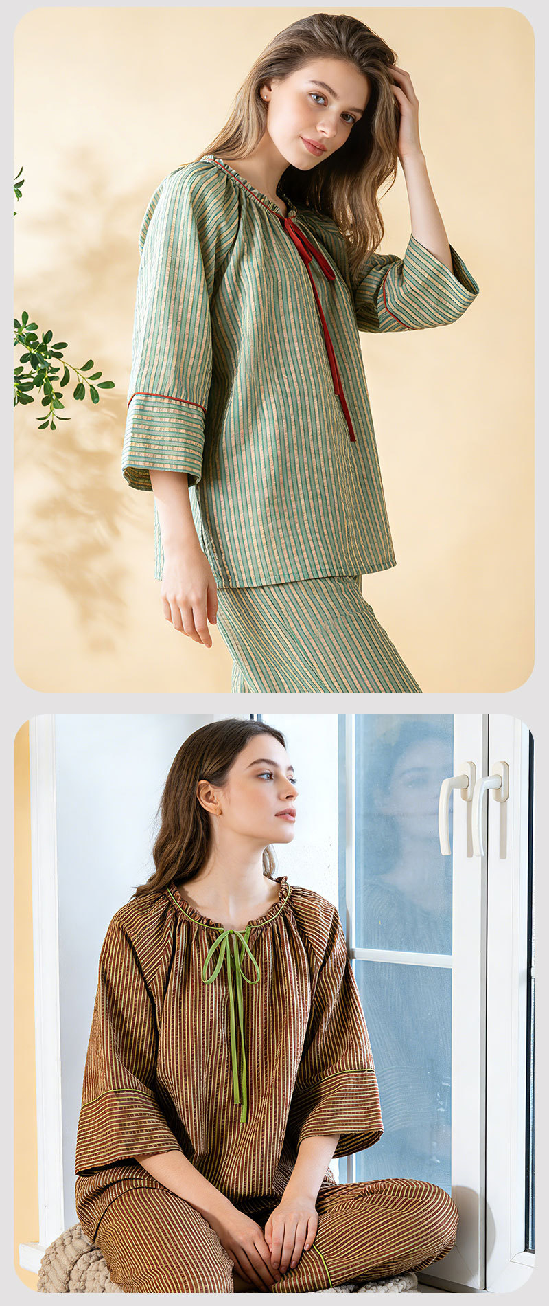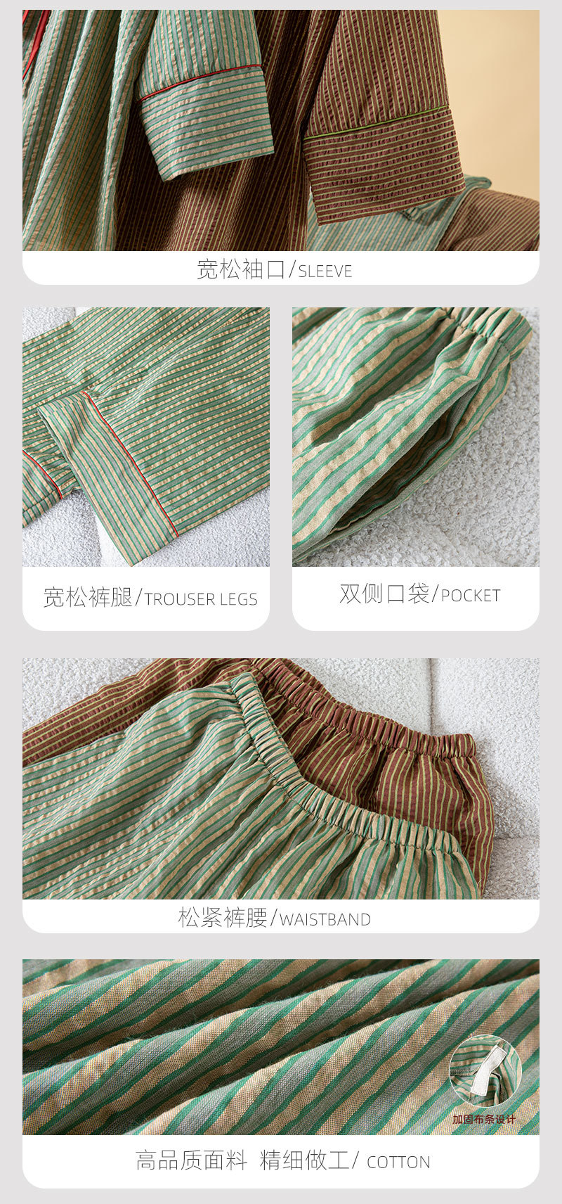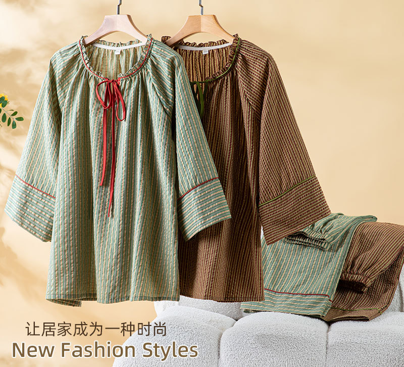 (总)洛兰沙家居馆 2026年春季新款纯棉睡衣女条纹长袖圆领套头休闲家居服套装可外穿