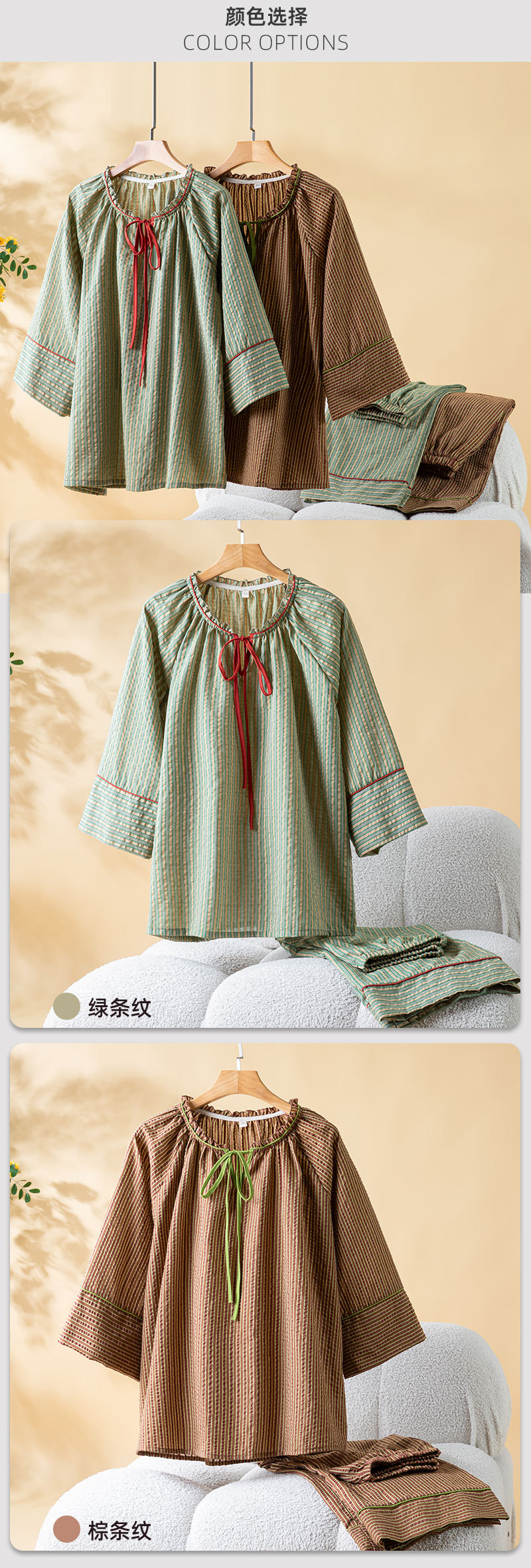 (总)洛兰沙家居馆 日式纯棉情侣睡衣春秋夏季无印风男女纱布长袖长裤家居服套装,女款粉格,女款绿格,男款咖格